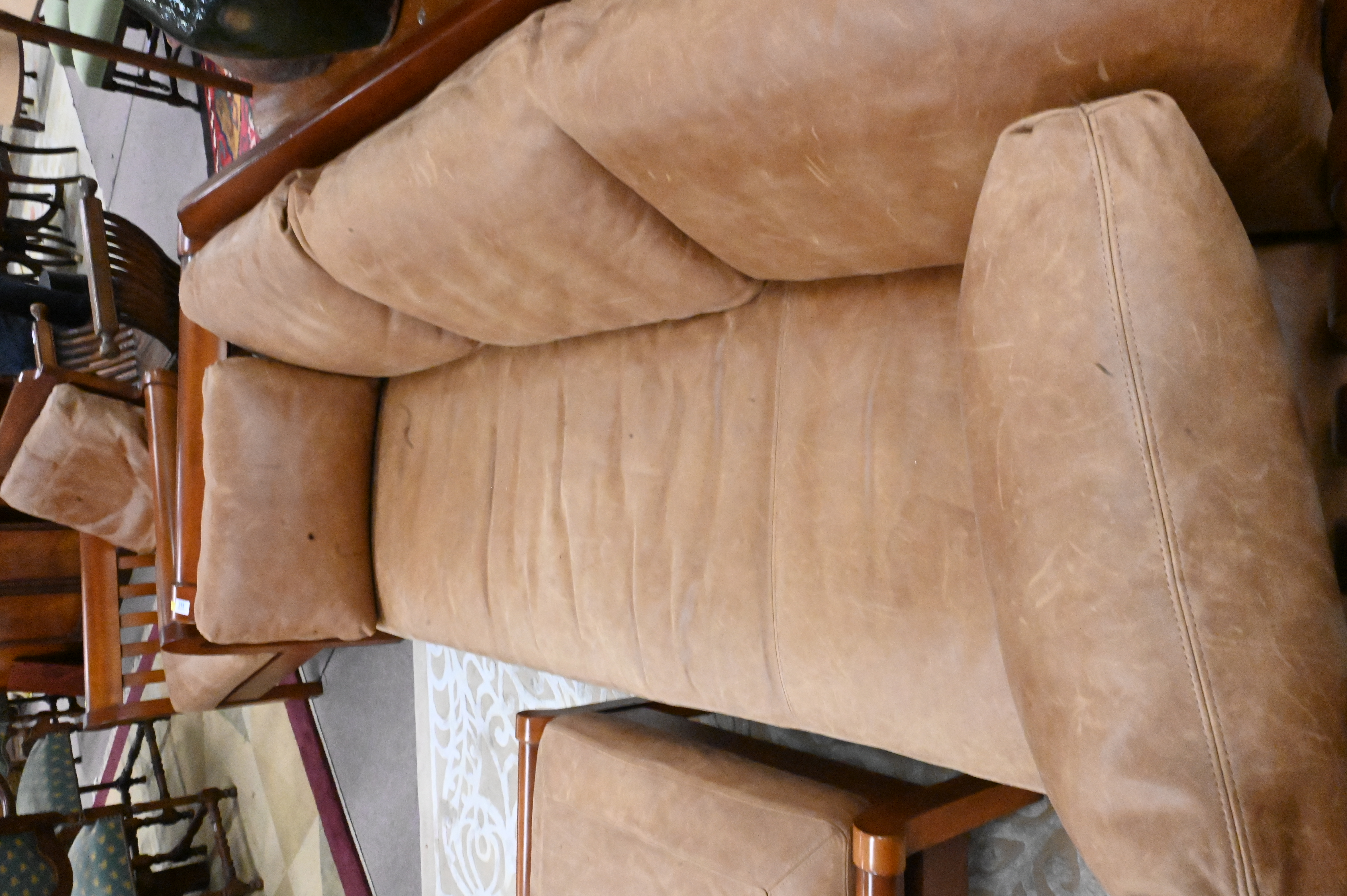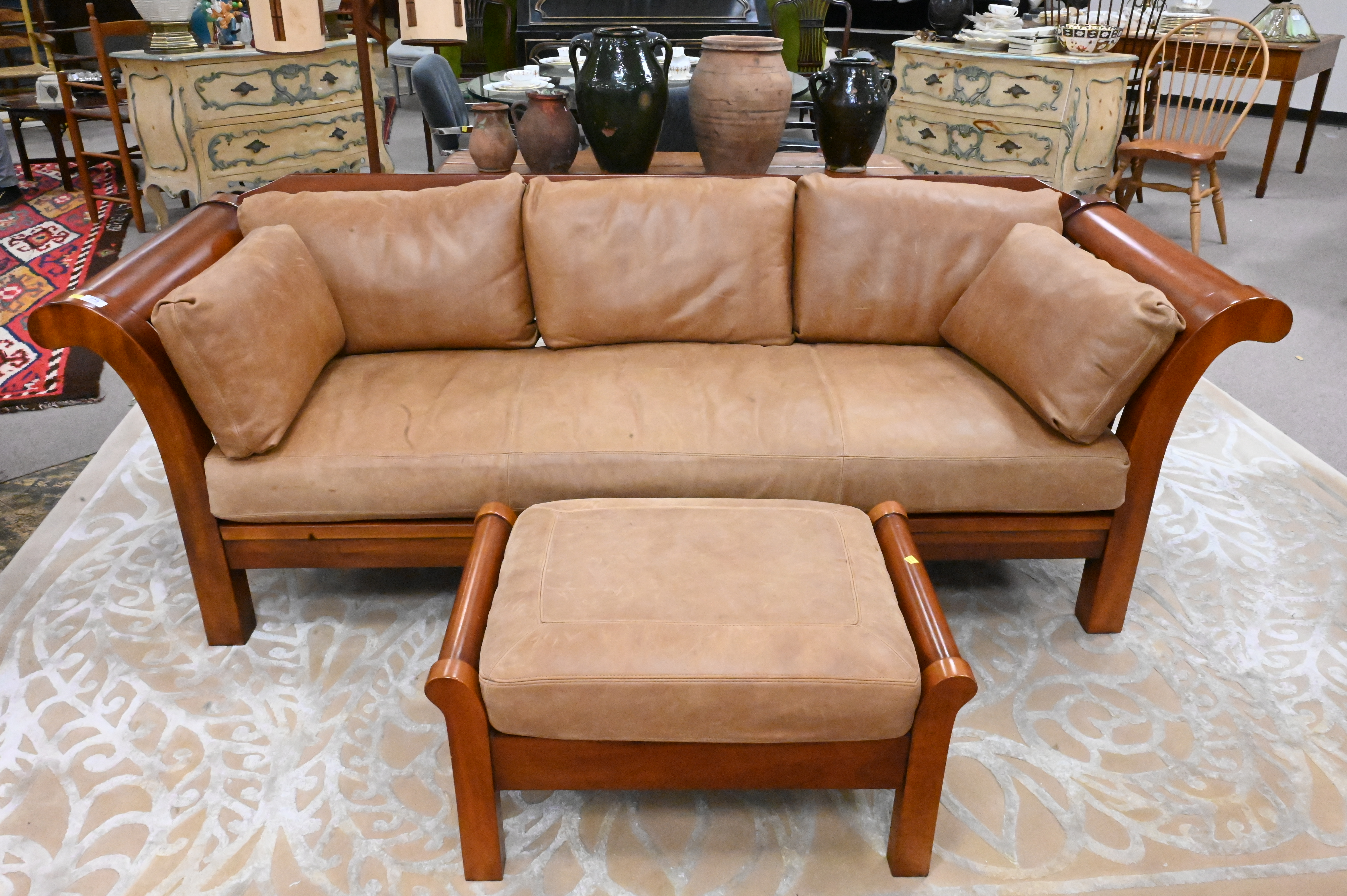 Three Piece Mission Style Cherry and Leather Group, to include a mission style cherry and leather sofa, height 31 inches, length 86 inches, a leather club chair, along with ottoman; height 35 inches, width 37 inches.