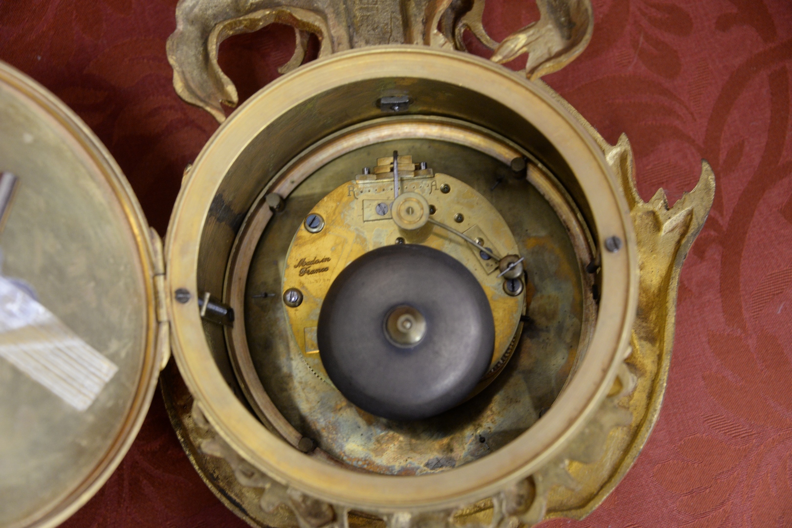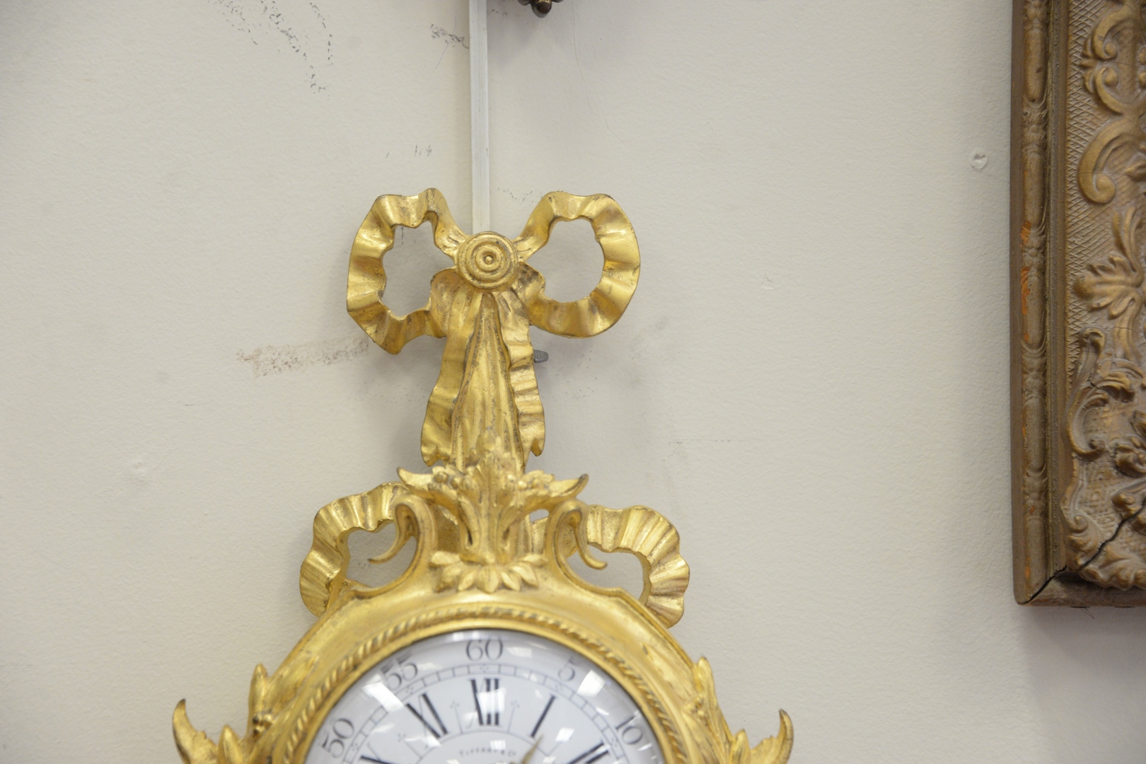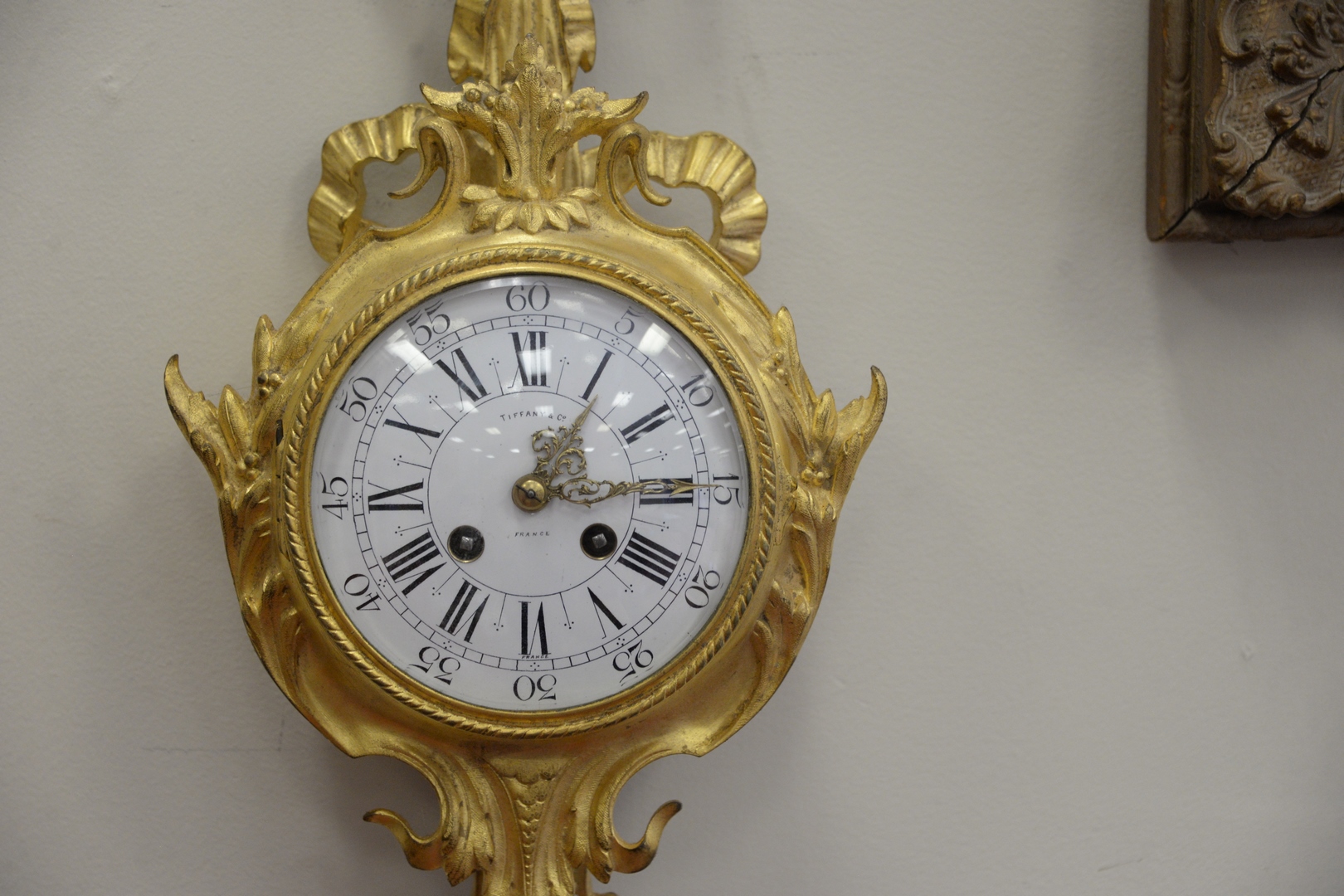 Lot 219: Tiffany & Company Gilt Bronze Louis XV Style Clock, enameled dial marked Tiffany & Company and marked France, height 17 inches.