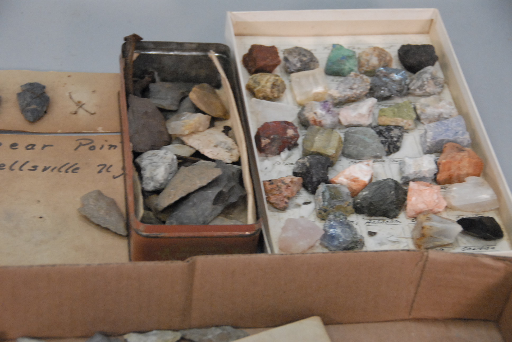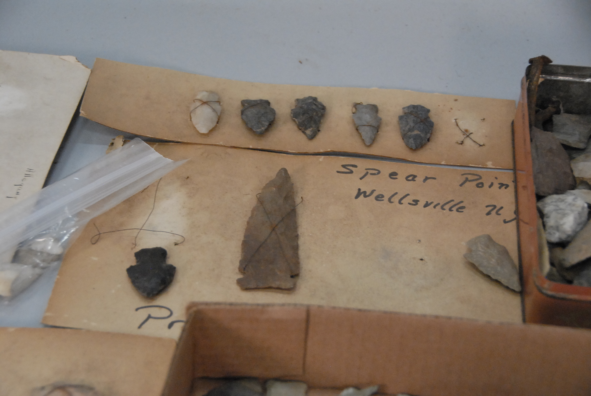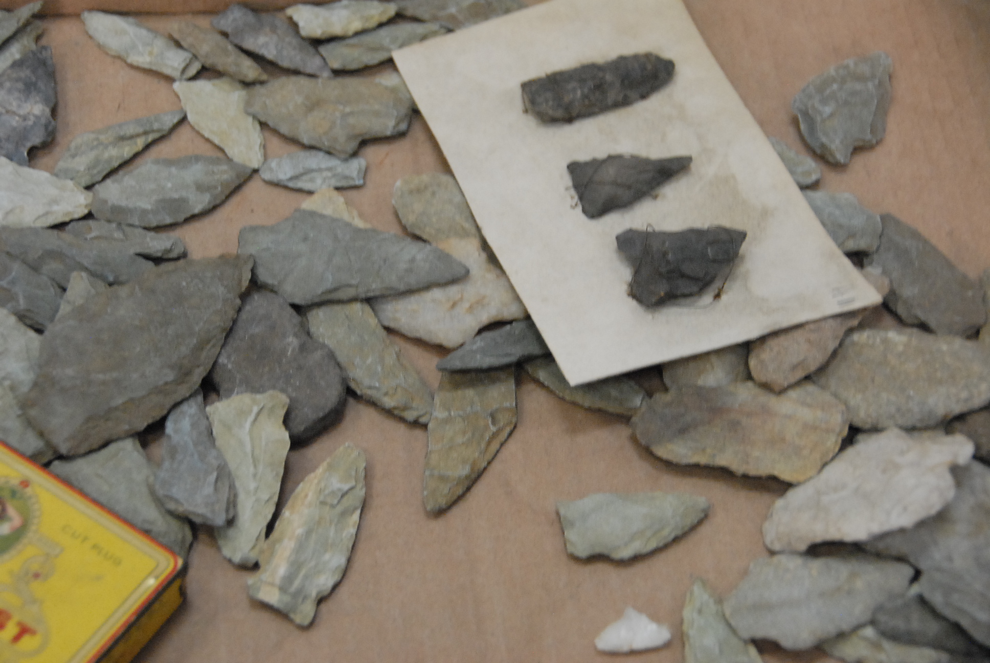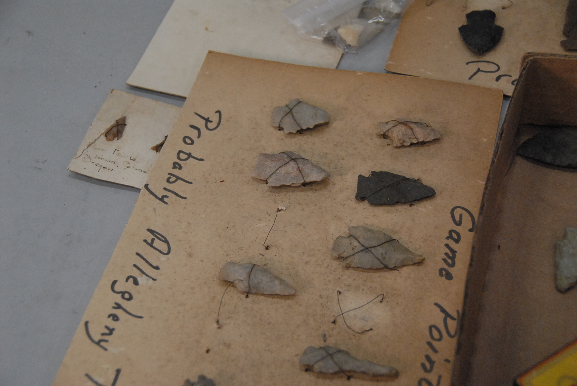 Two box lot collection of arrowheads, some on cards marked Allegany, two bird point marked Columbia River, Oregon.
