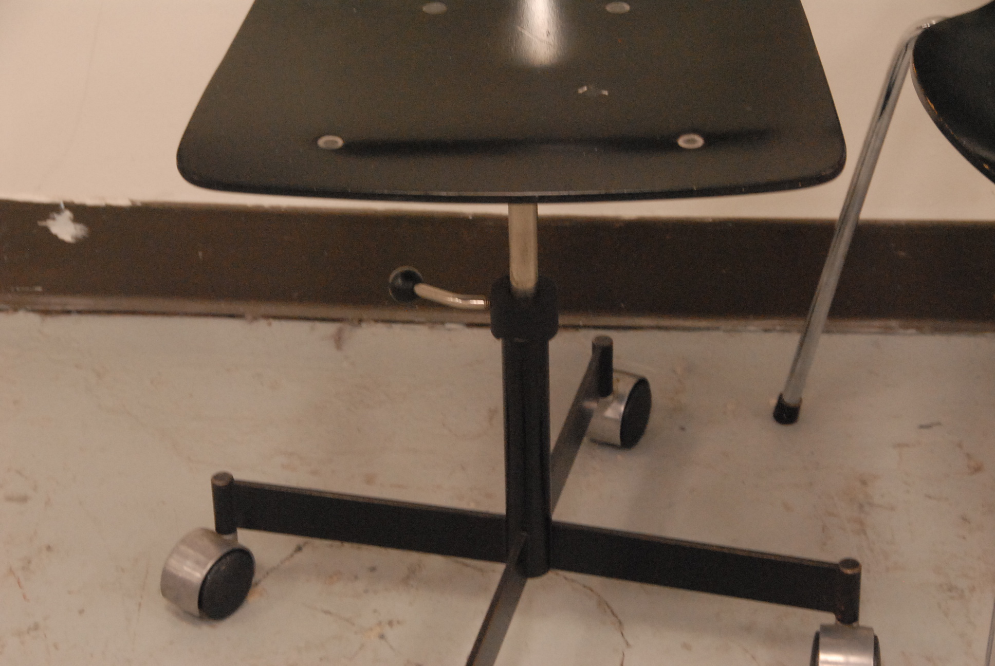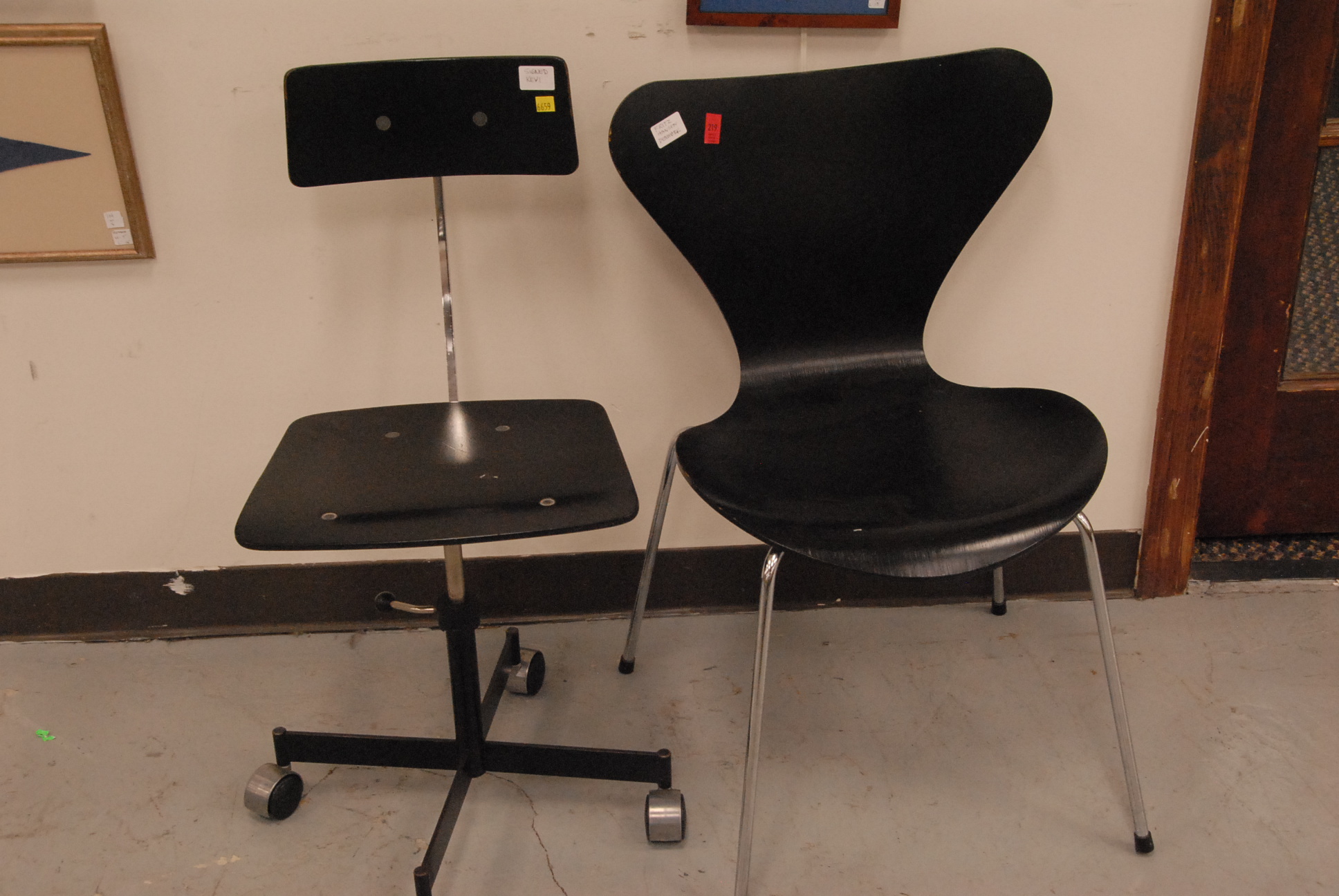 Two Mid-Century bent ply chairs of black lacquer & chrome chairs, an Arne Jacobsen Ant chair for Fritz Hansen and a Kevi adjustable office chair.