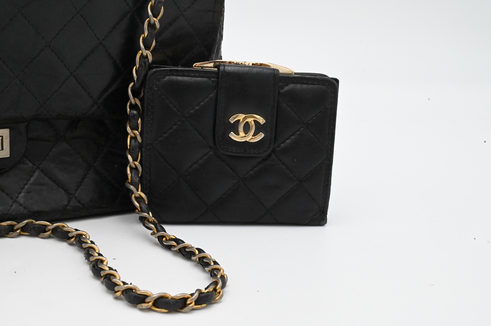 Lot 219: Two Piece Vintage Chanel Lot, to include quilted leather handbag, along with one leather wallet, both marked Chanel to interior.