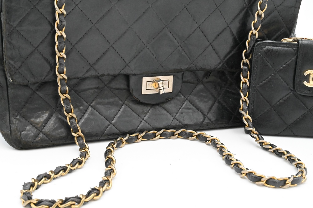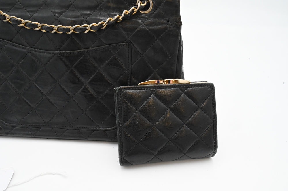 Two Piece Vintage Chanel Lot, to include quilted leather handbag, along with one leather wallet, both marked Chanel to interior.