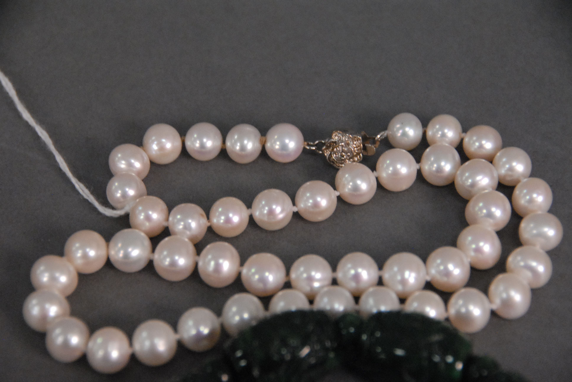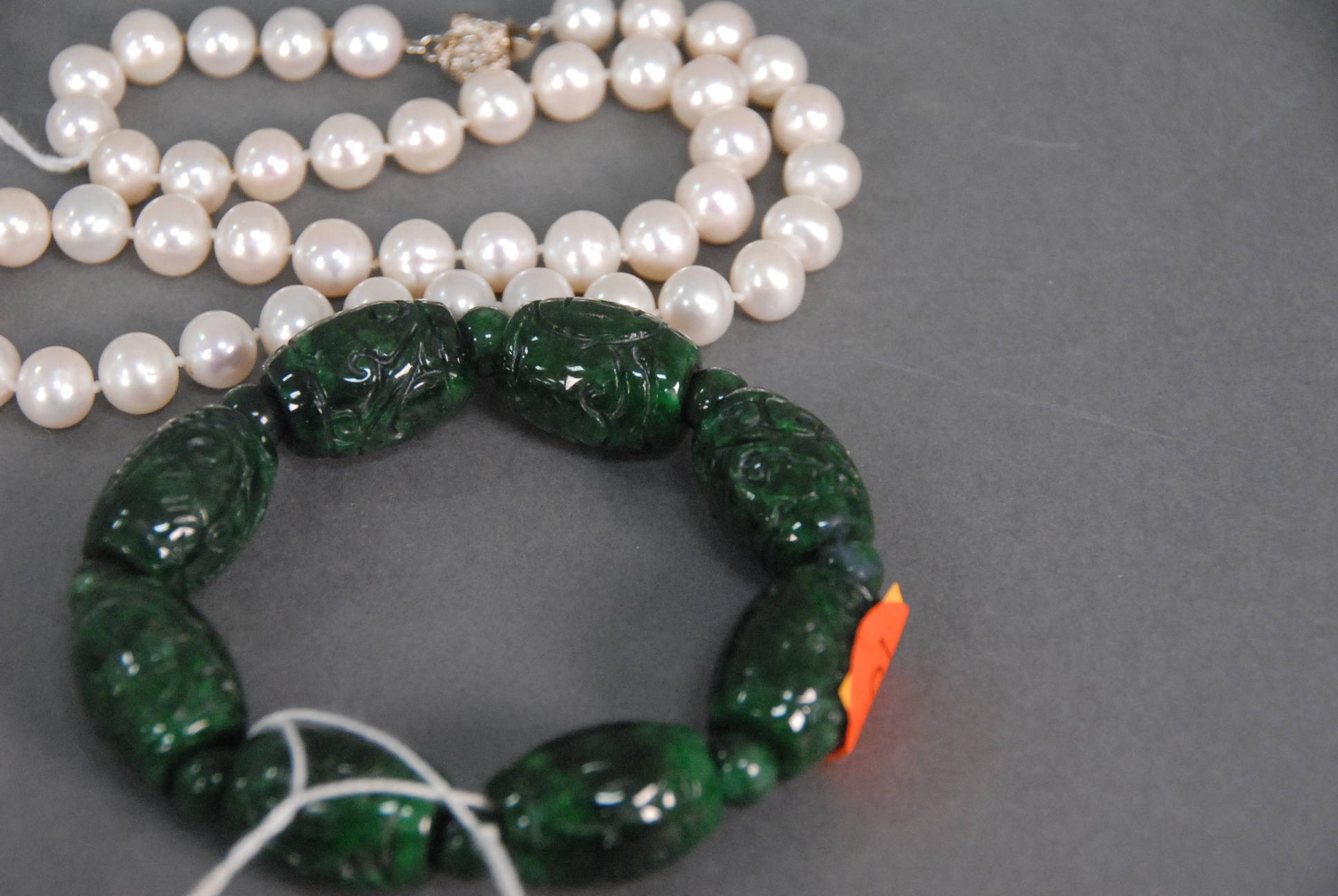 Two pieces of Oriental jewelry pearl necklace lg. 18in. and jade bracelet lg. 4 1/2in.