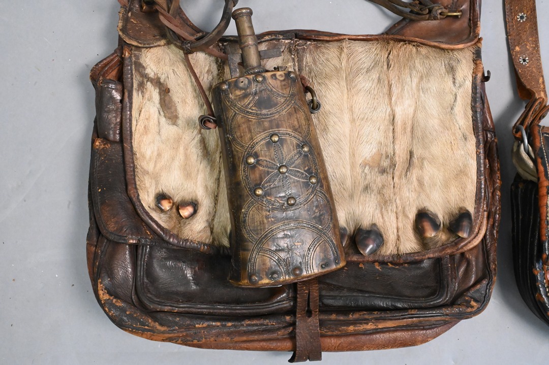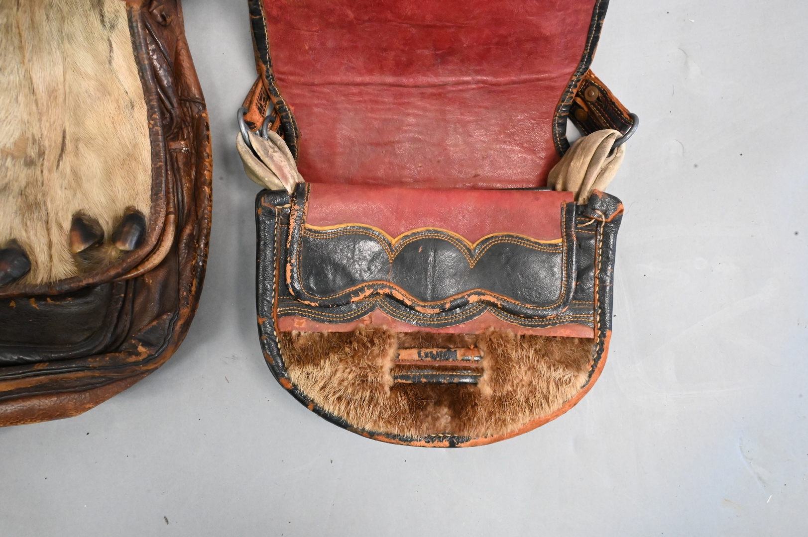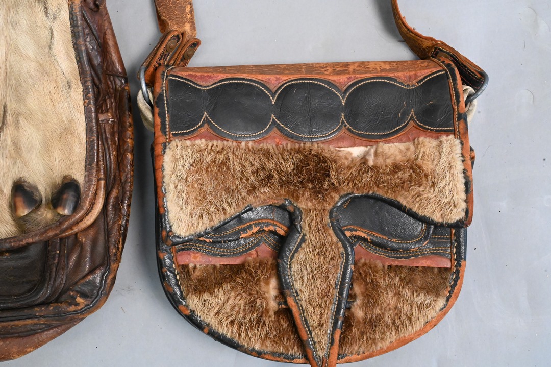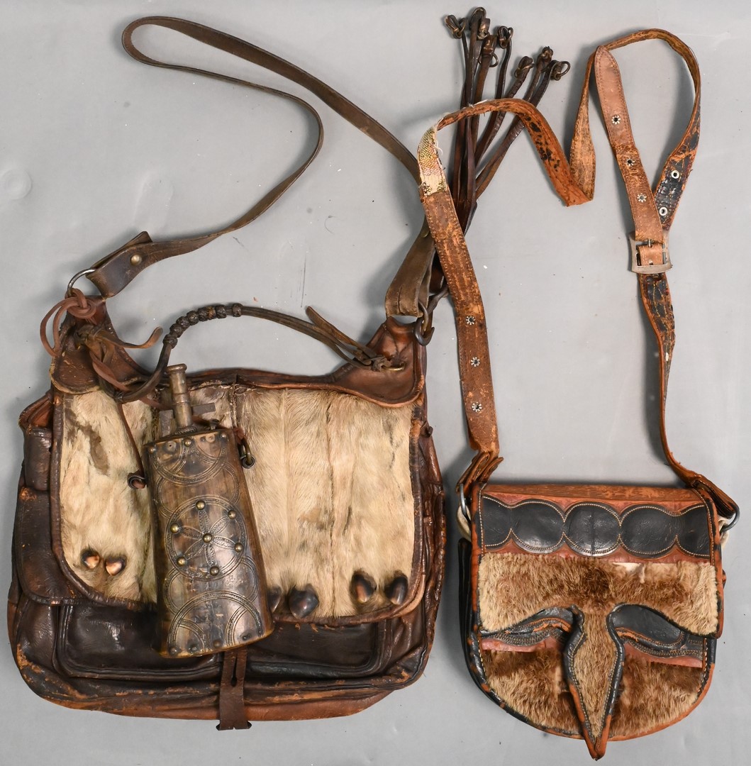 Two Leather and Hide Satchel Bags, each having animal skin fronts and one having carved powder horn, largest bag has height 13 inches, width 14 inches, smaller bag has height 9 inches, width 8 1/2 inches, Provenance: Estate of Peter Tillou, Litchfield, Connecticut.