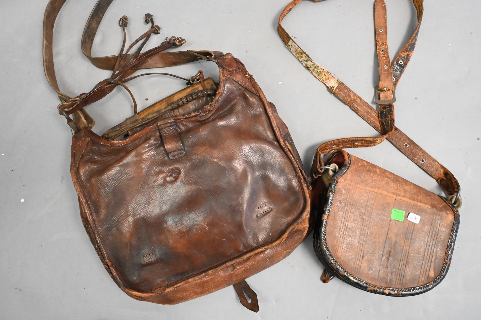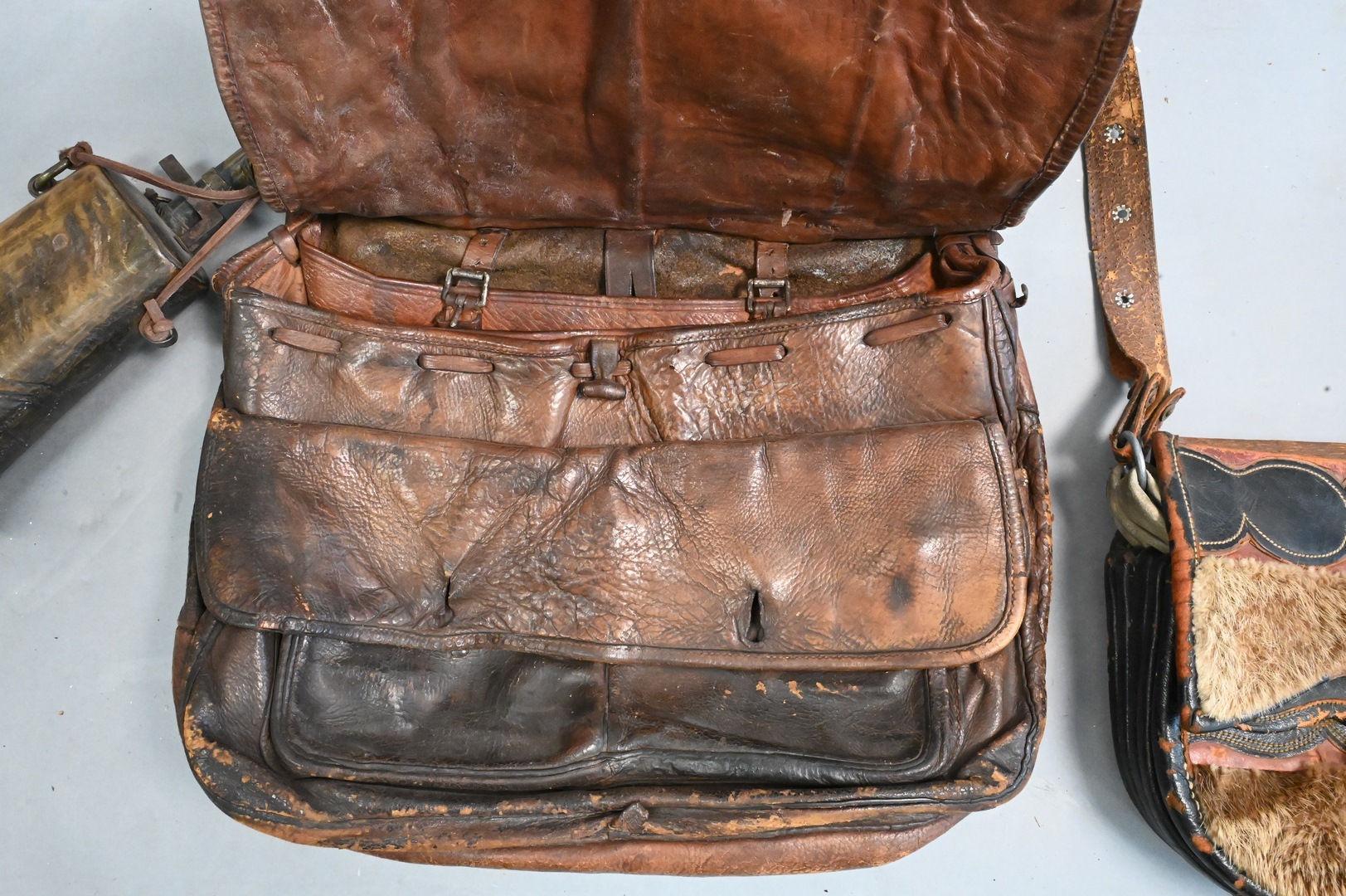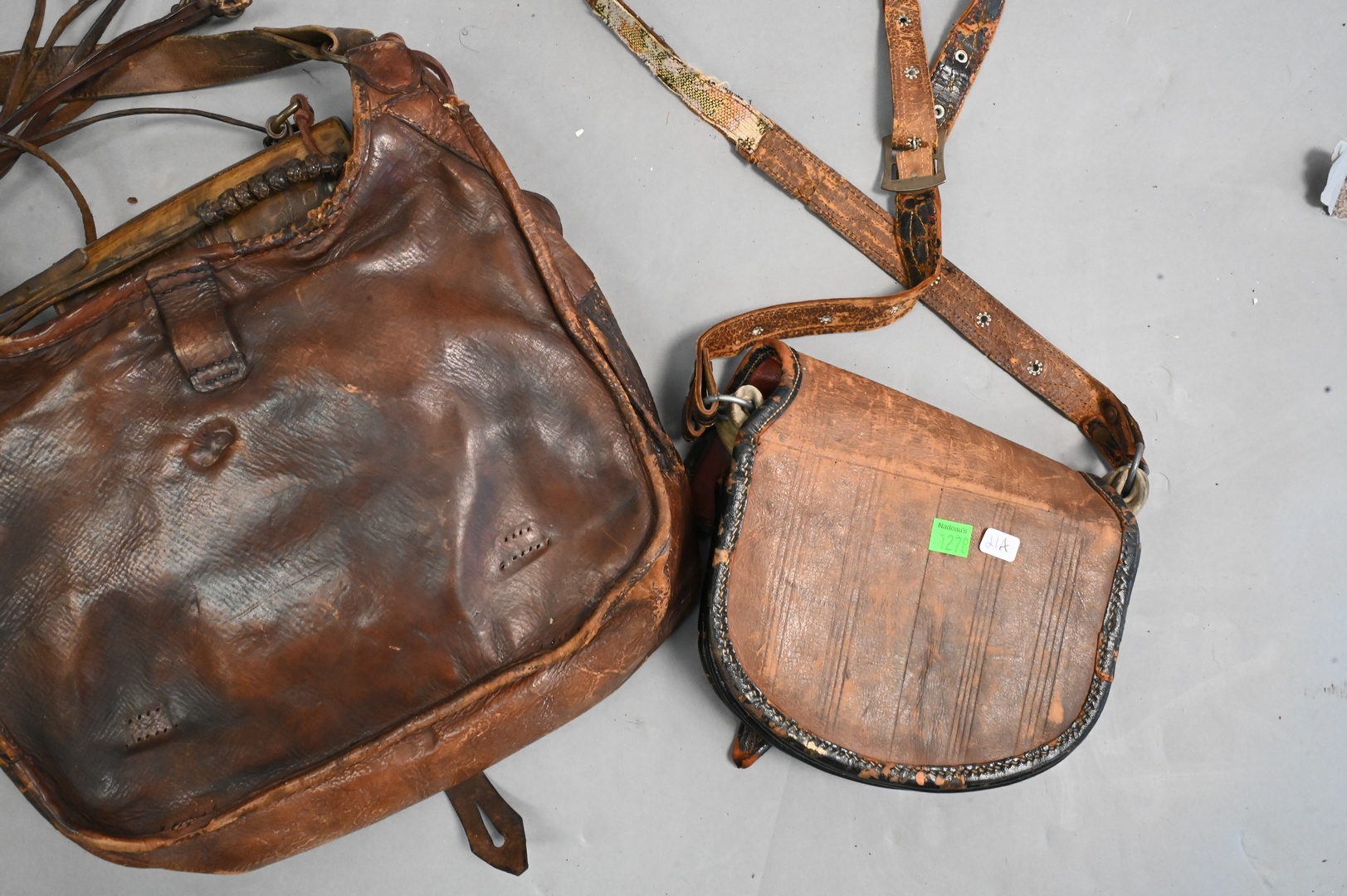 Two Leather and Hide Satchel Bags, each having animal skin fronts and one having carved powder horn, largest bag has height 13 inches, width 14 inches, smaller bag has height 9 inches, width 8 1/2 inches, Provenance: Estate of Peter Tillou, Litchfield, Connecticut.