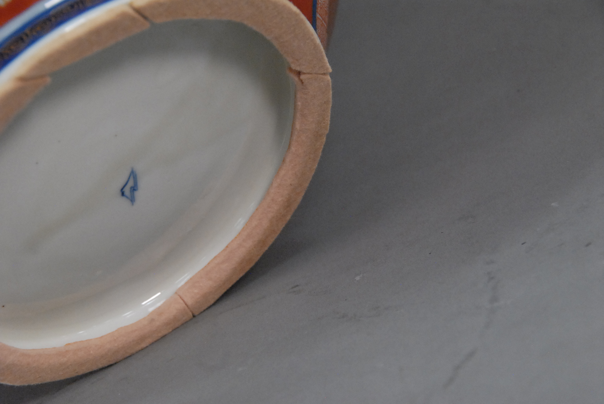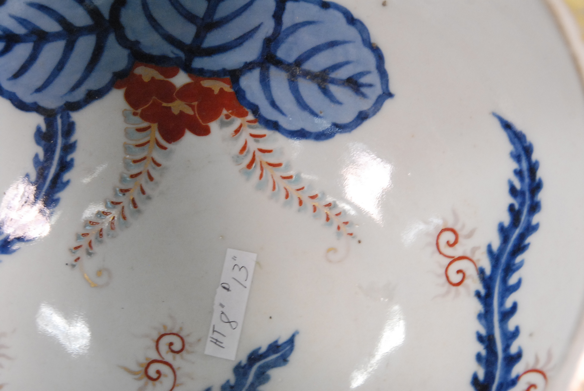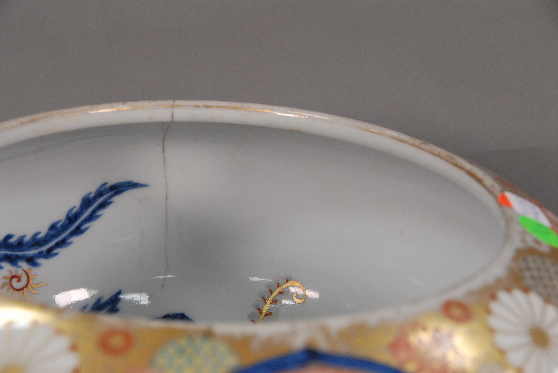Large phoenix bird Imari bowl having painted exterior with a large phoenix bird interior, mark on bottom small crack on one side.