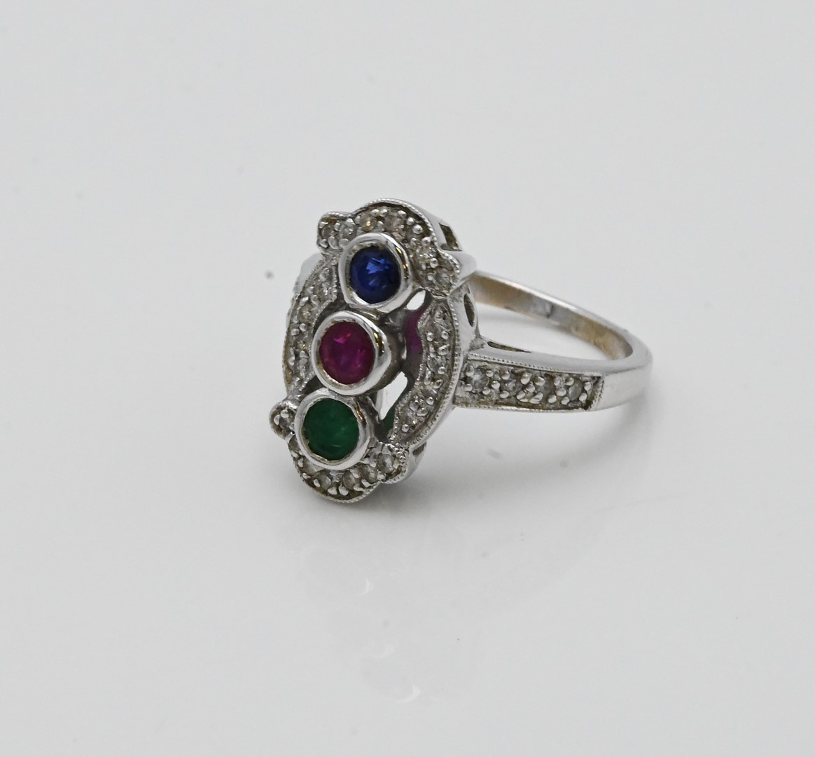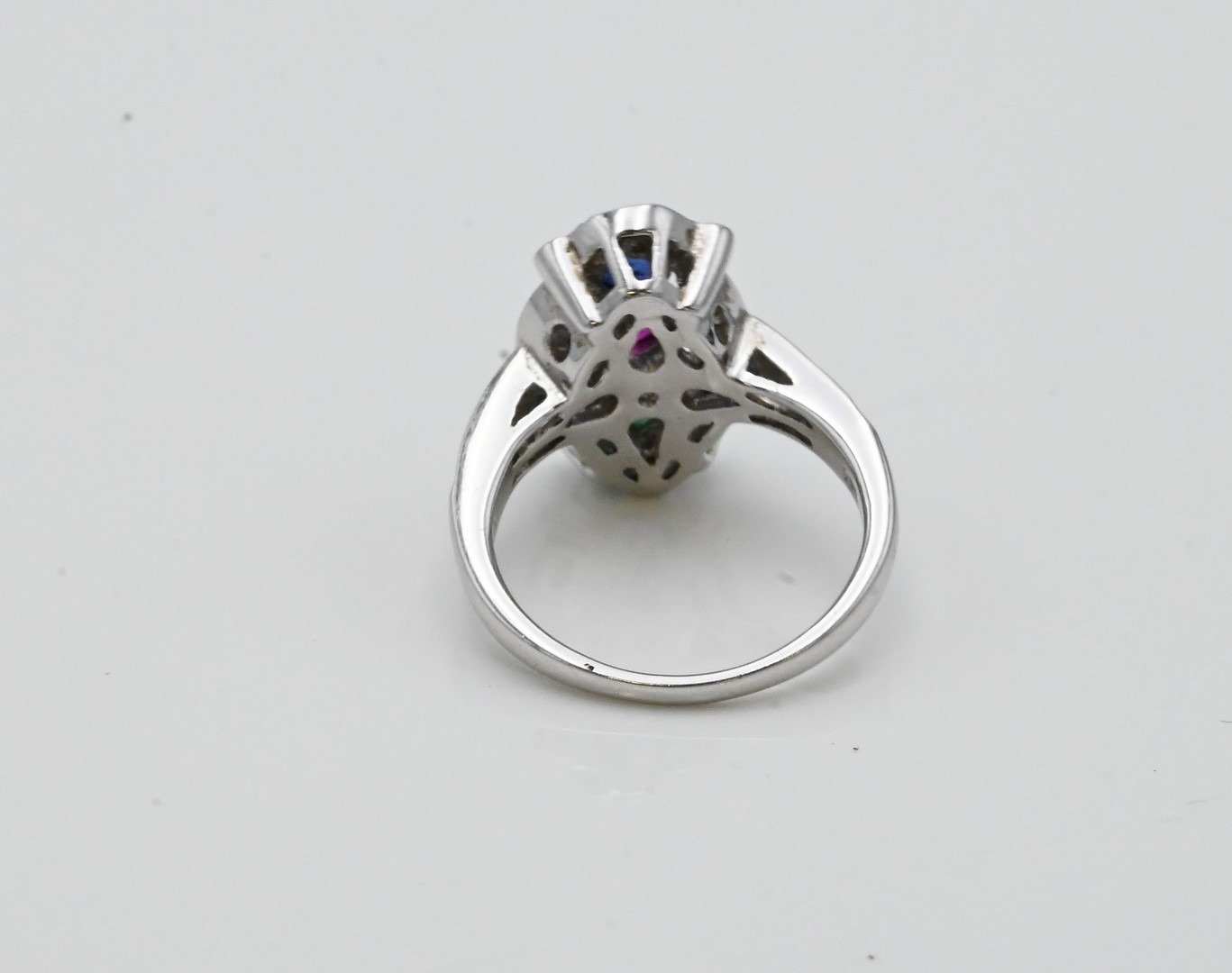 18 Karat White Gold Ring, set with round sapphire, ruby, emerald, and small diamonds, size 6 1/4, 7.4 grams.