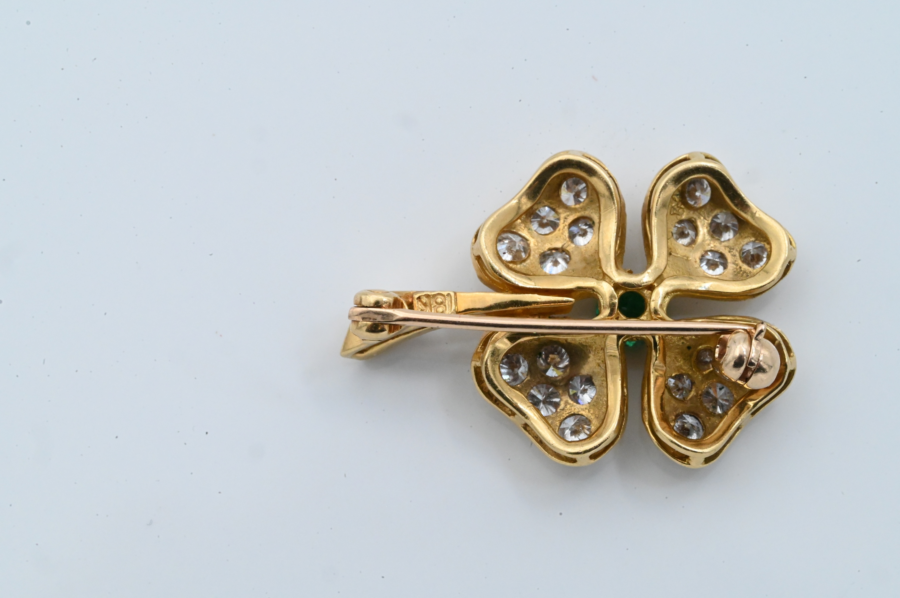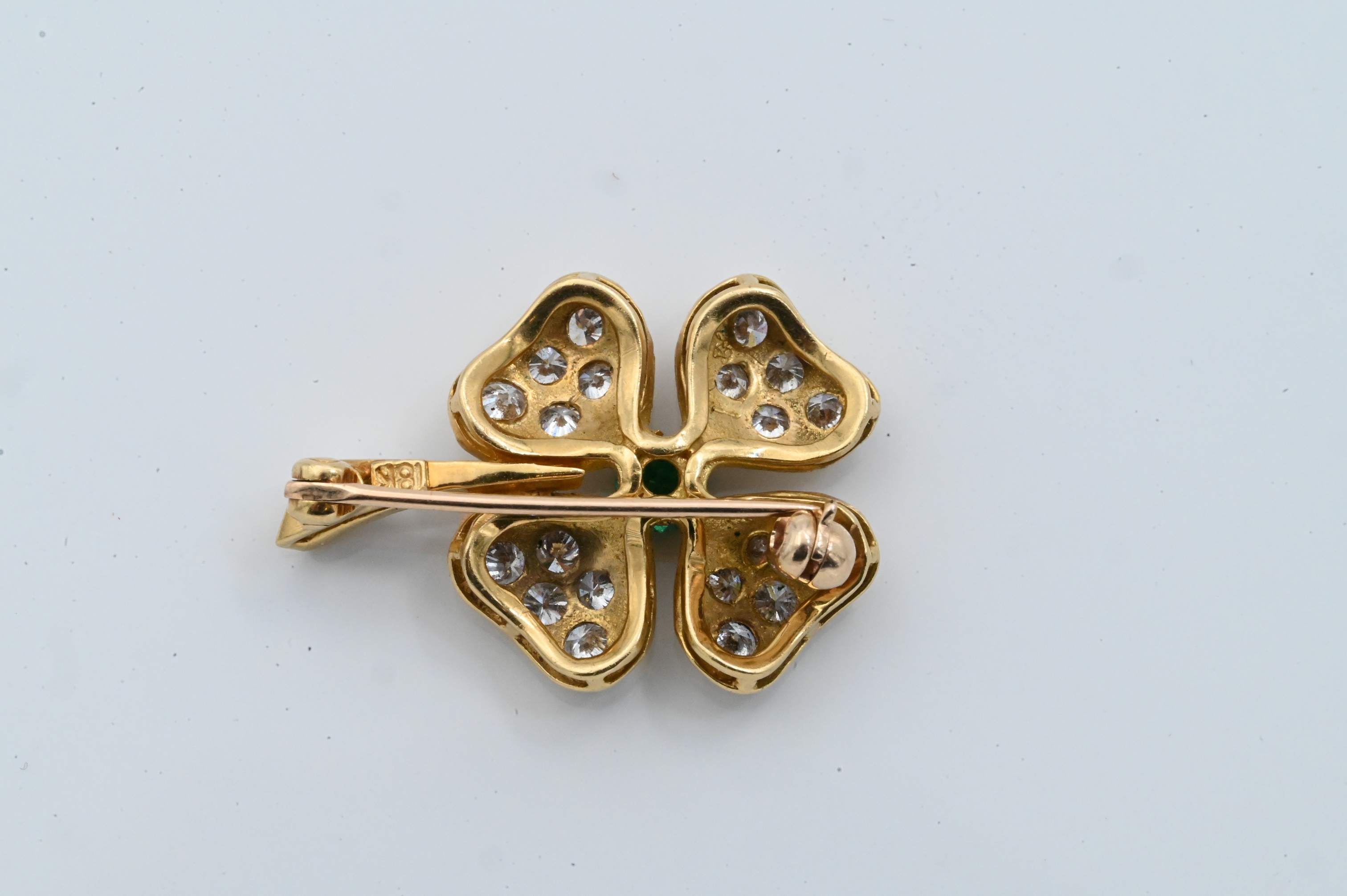 Lot 22: 18K Yellow Gold Clover-form Brooch Centering One Round Emerald