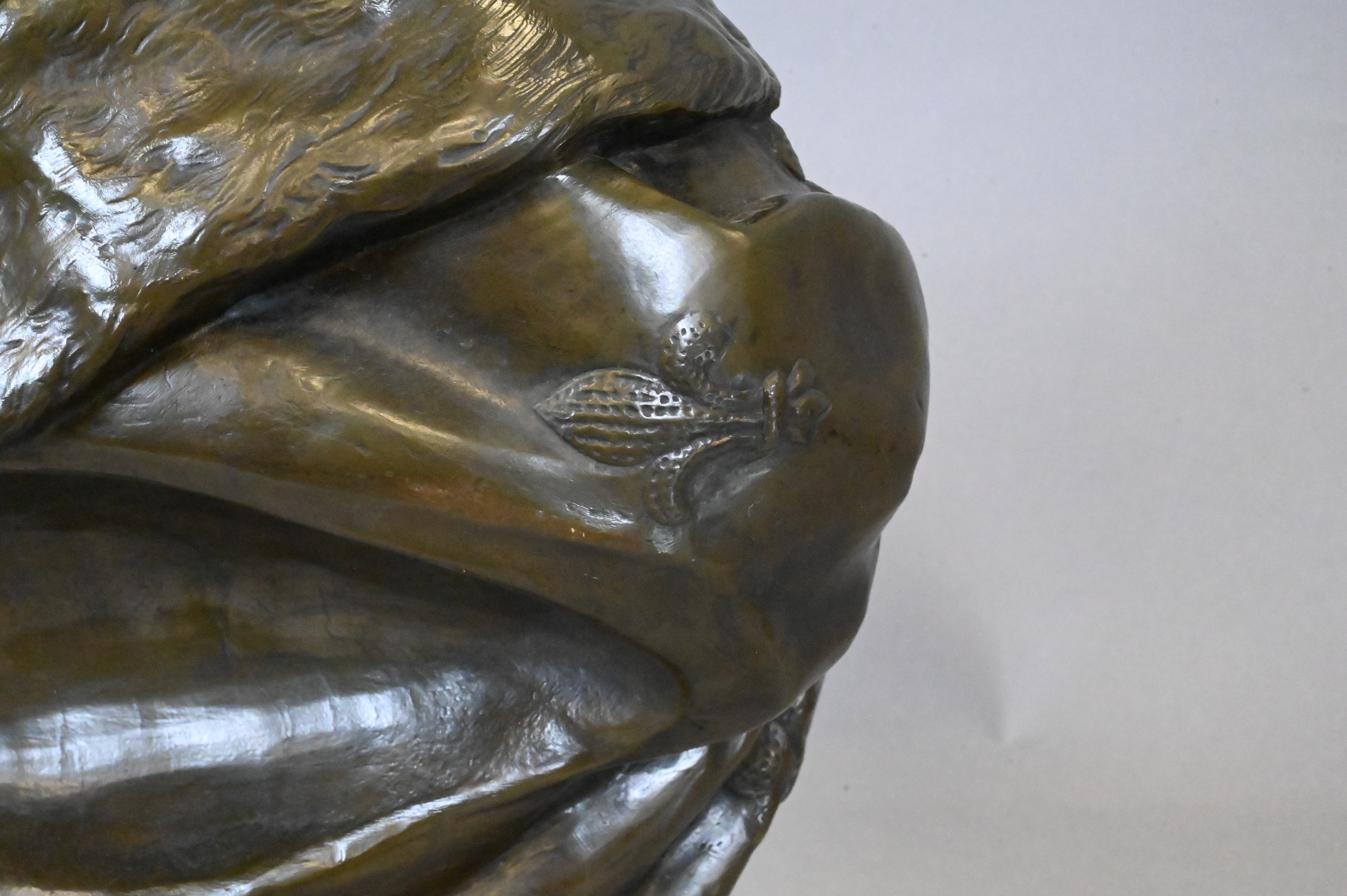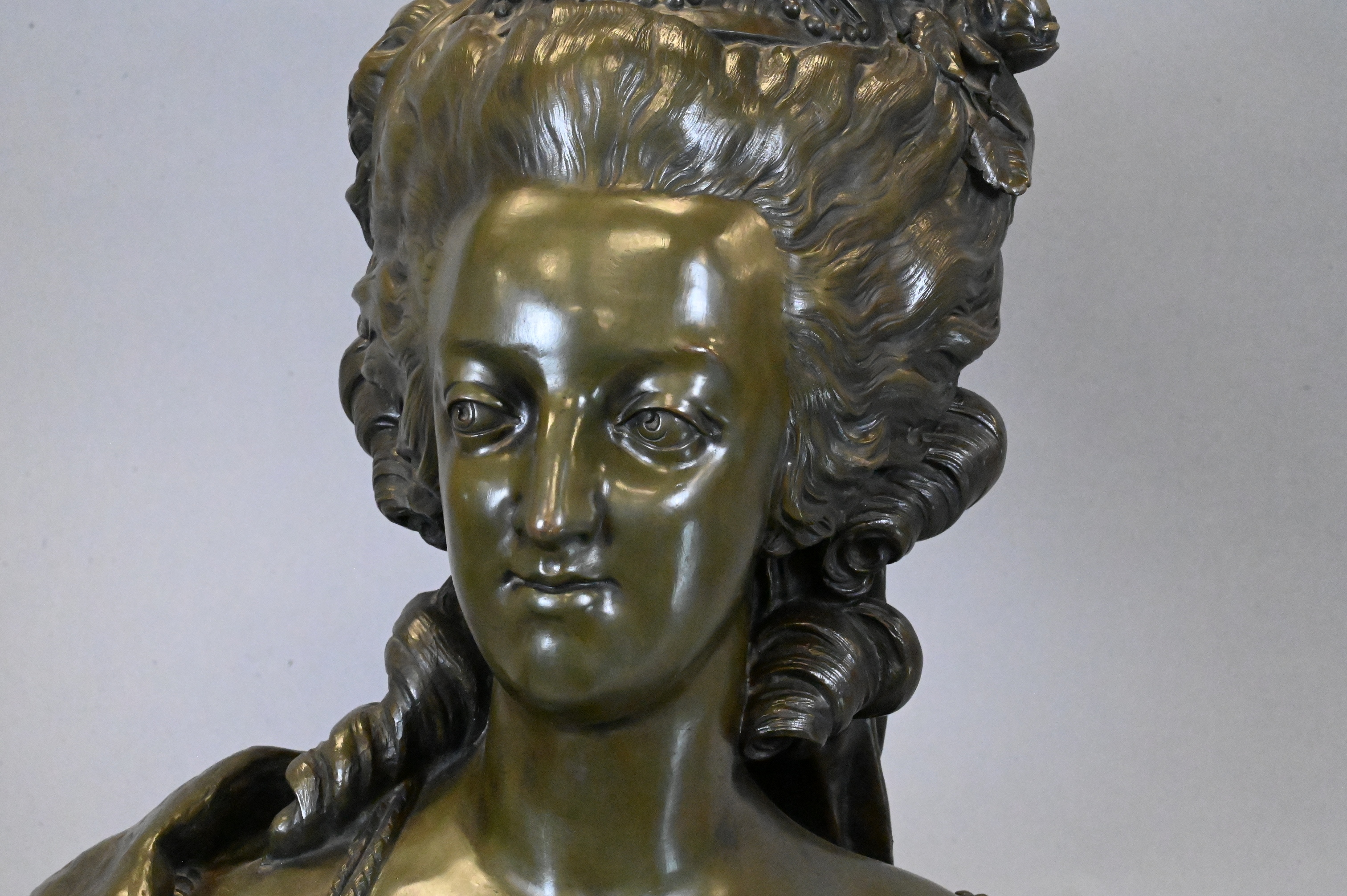 Queen Marie Antoinette, depicted with elaborate coiffure and jeweled drapery, after the celebrated model by Jean-Antoine Houdon. With plaque and signature on the reverse.