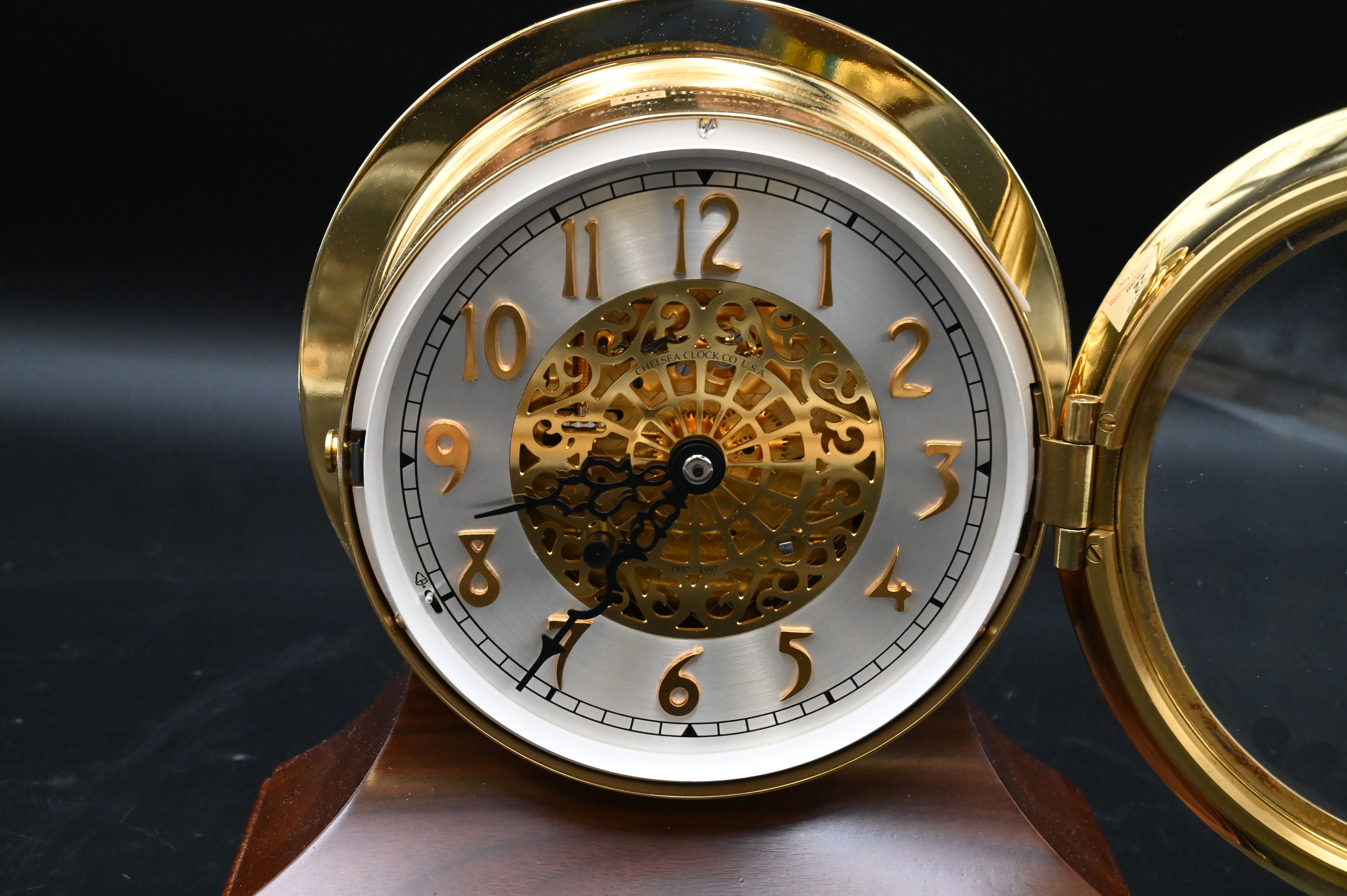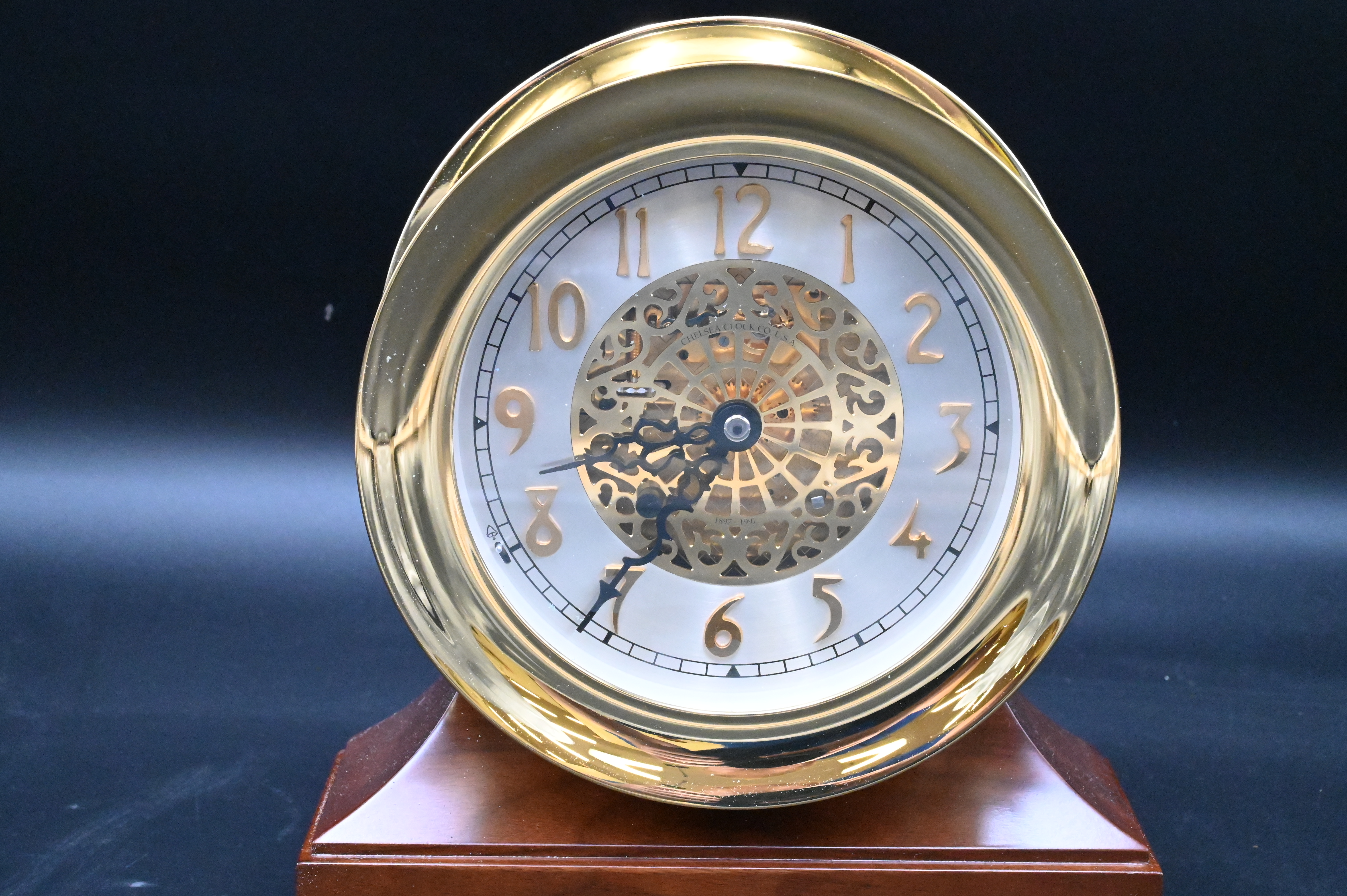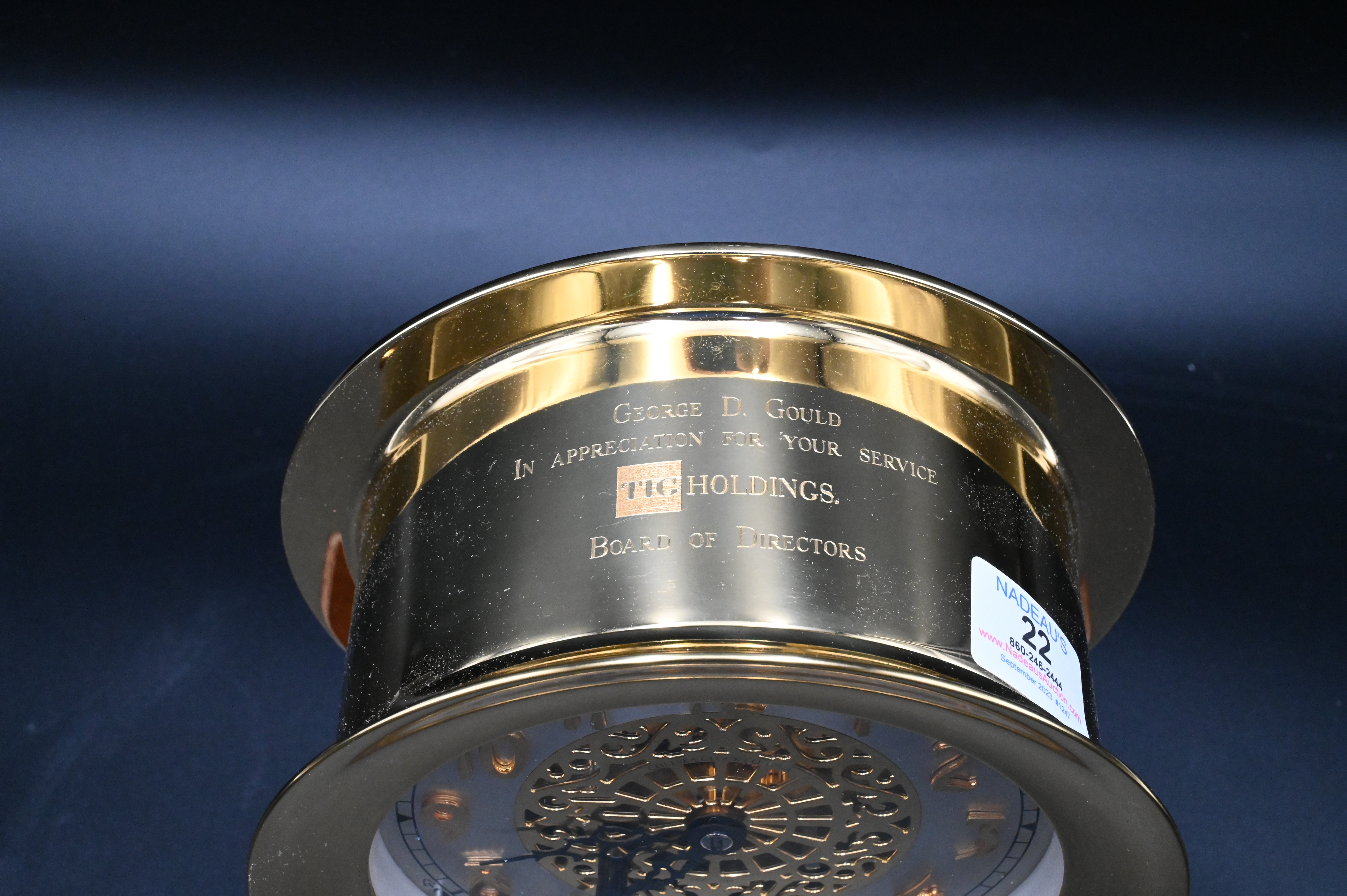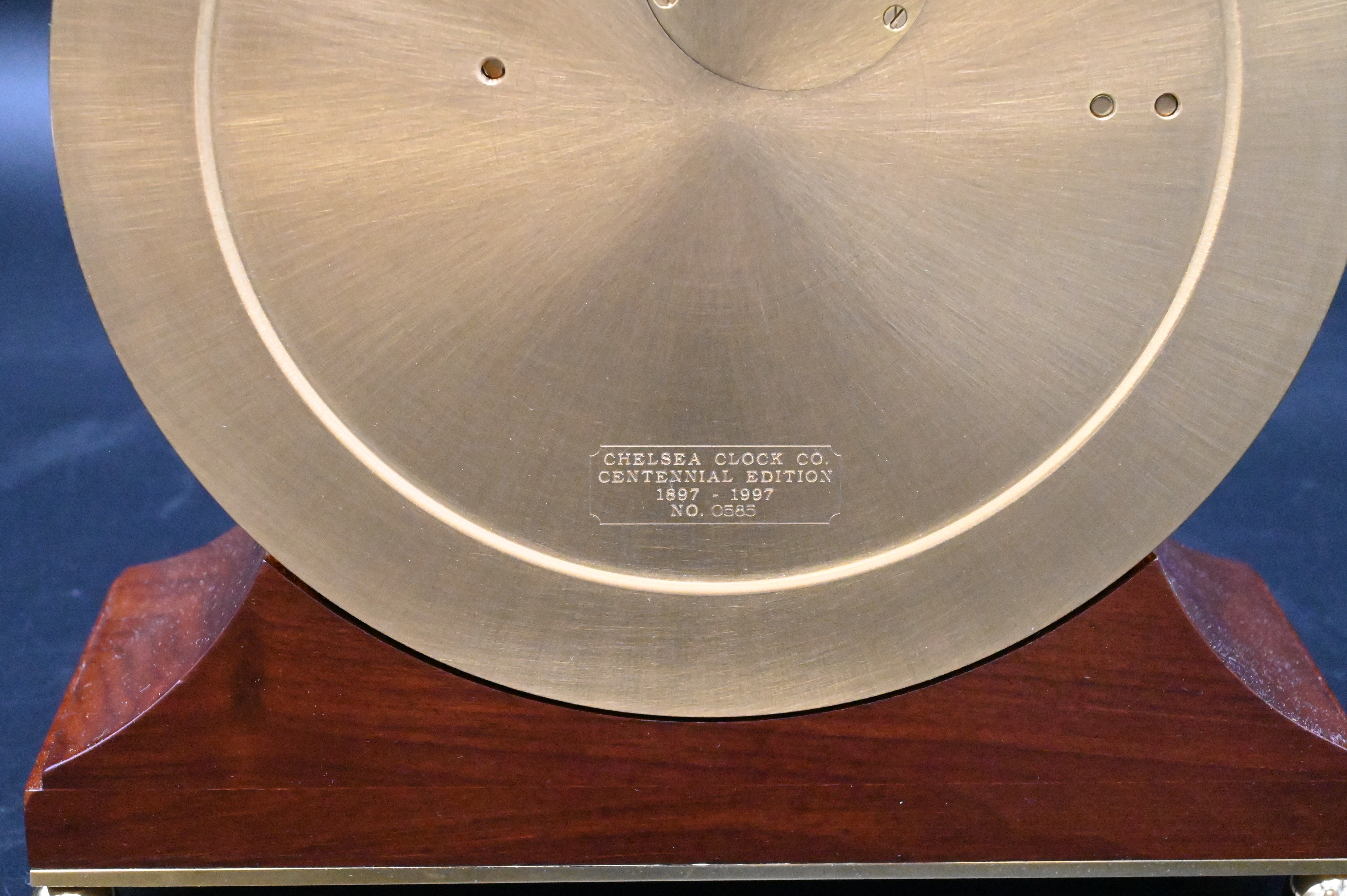 Chelsea Brass Centennial Limited Edition Clock, monogrammed, along with original box, height 9 inches.