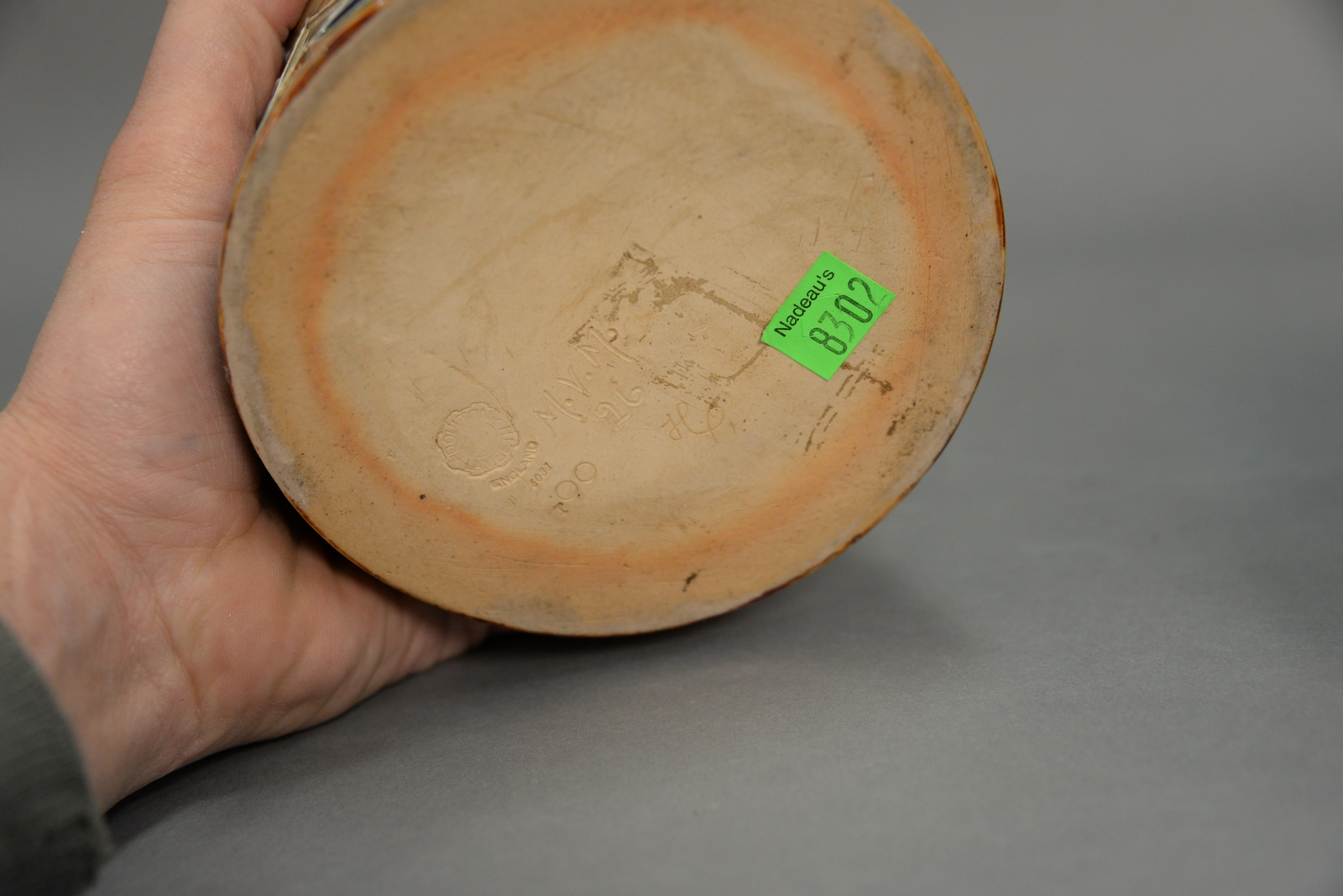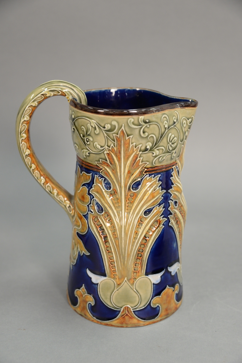 Lot 22: Doulton Lambeth stoneware pitcher by Mark Marshall having heavy glaze over molded leaf dcor. height 9 1/2 inches