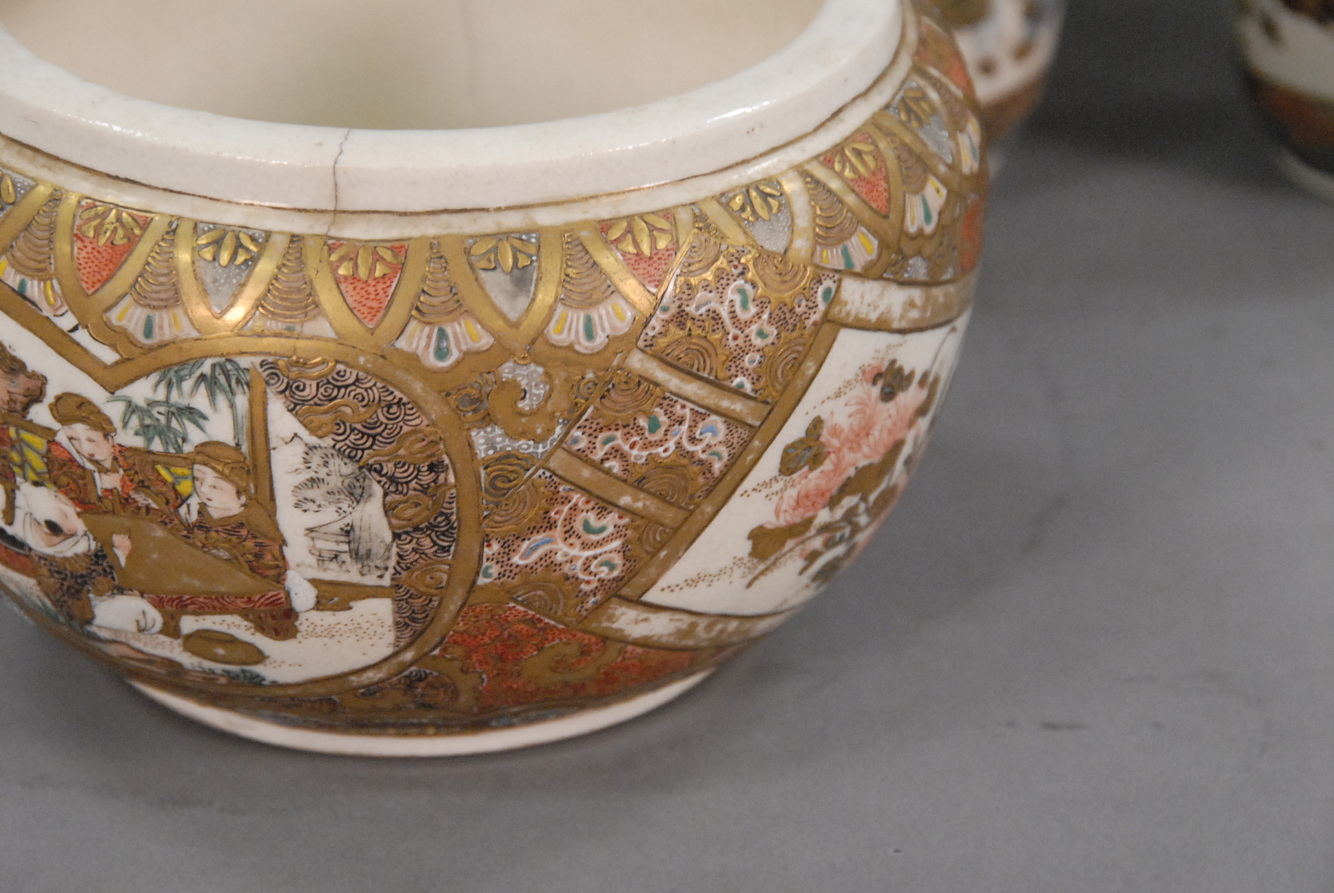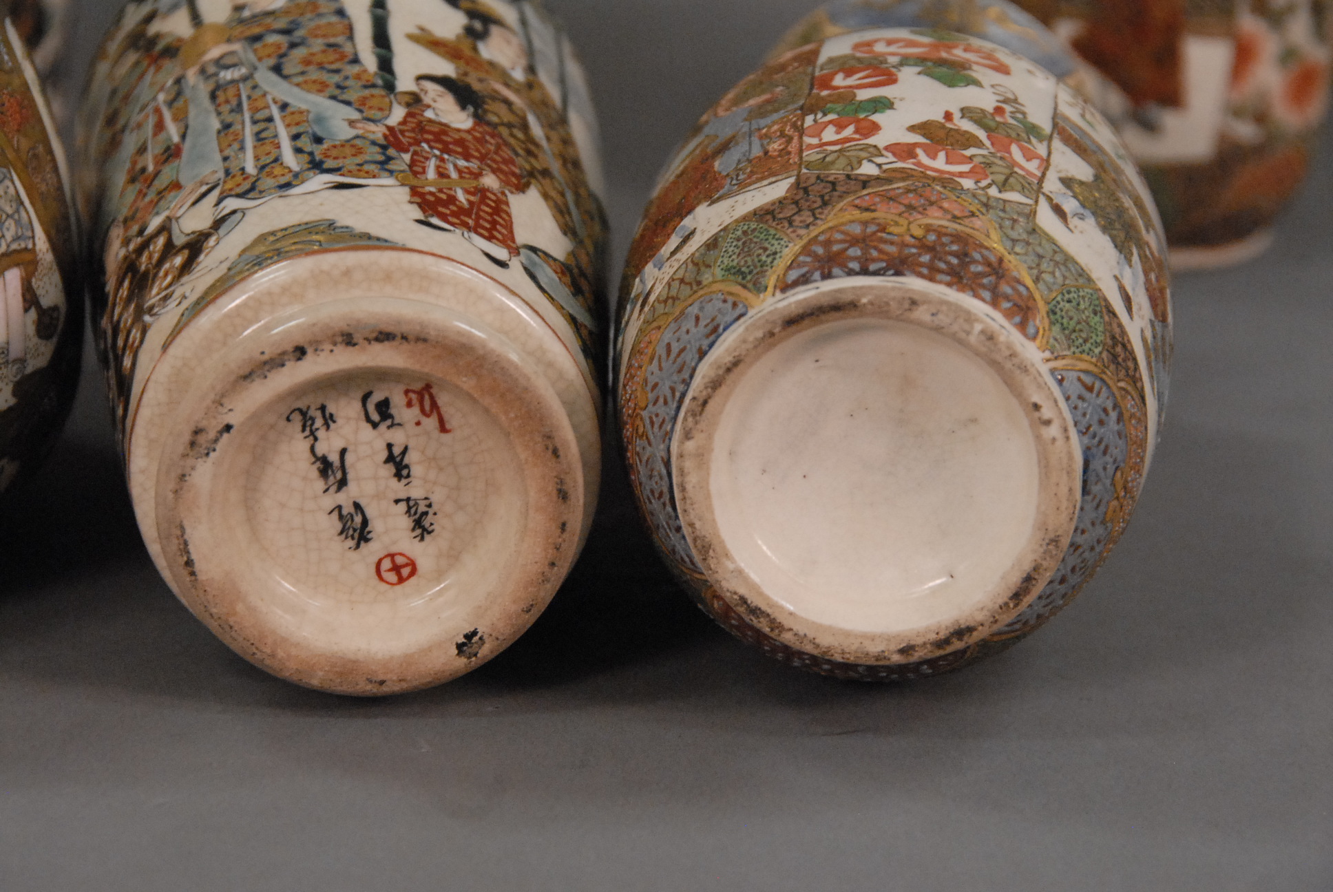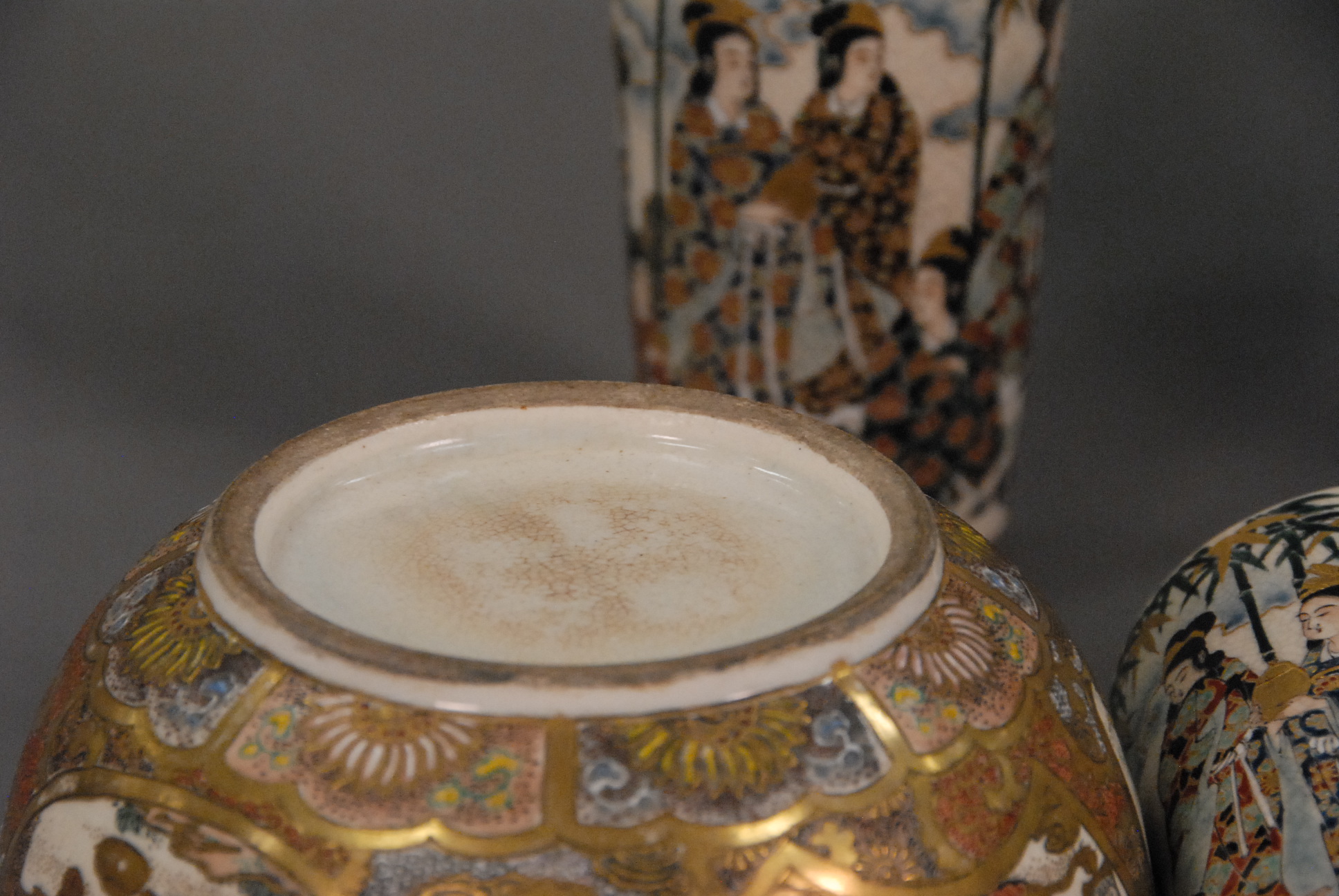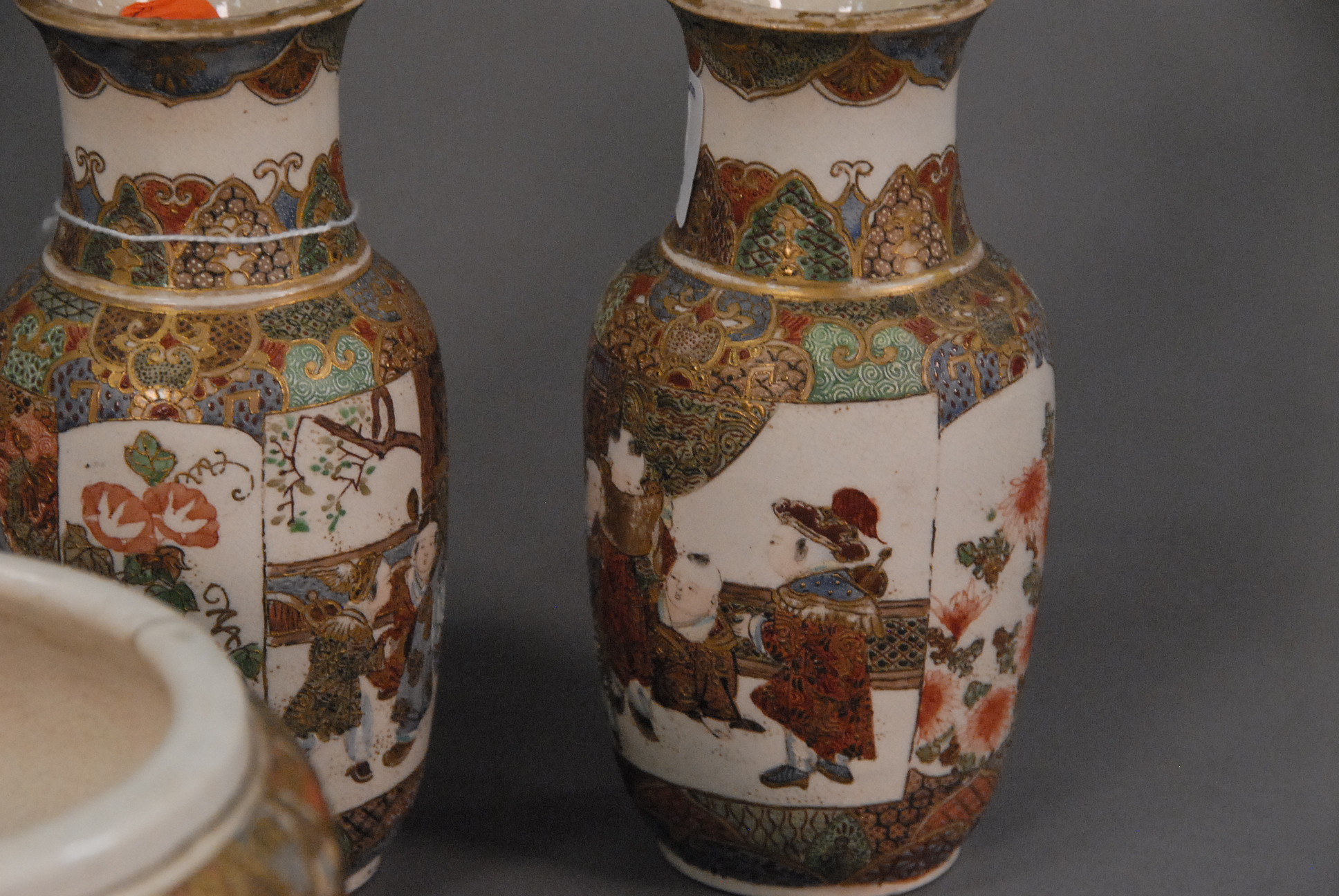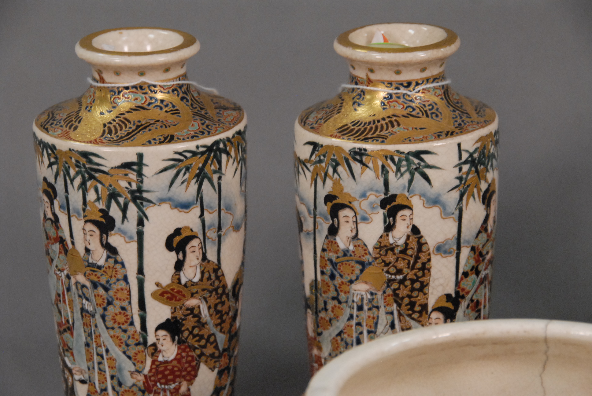 Five pieces of Satsuma to include two pairs of vases and bowl.