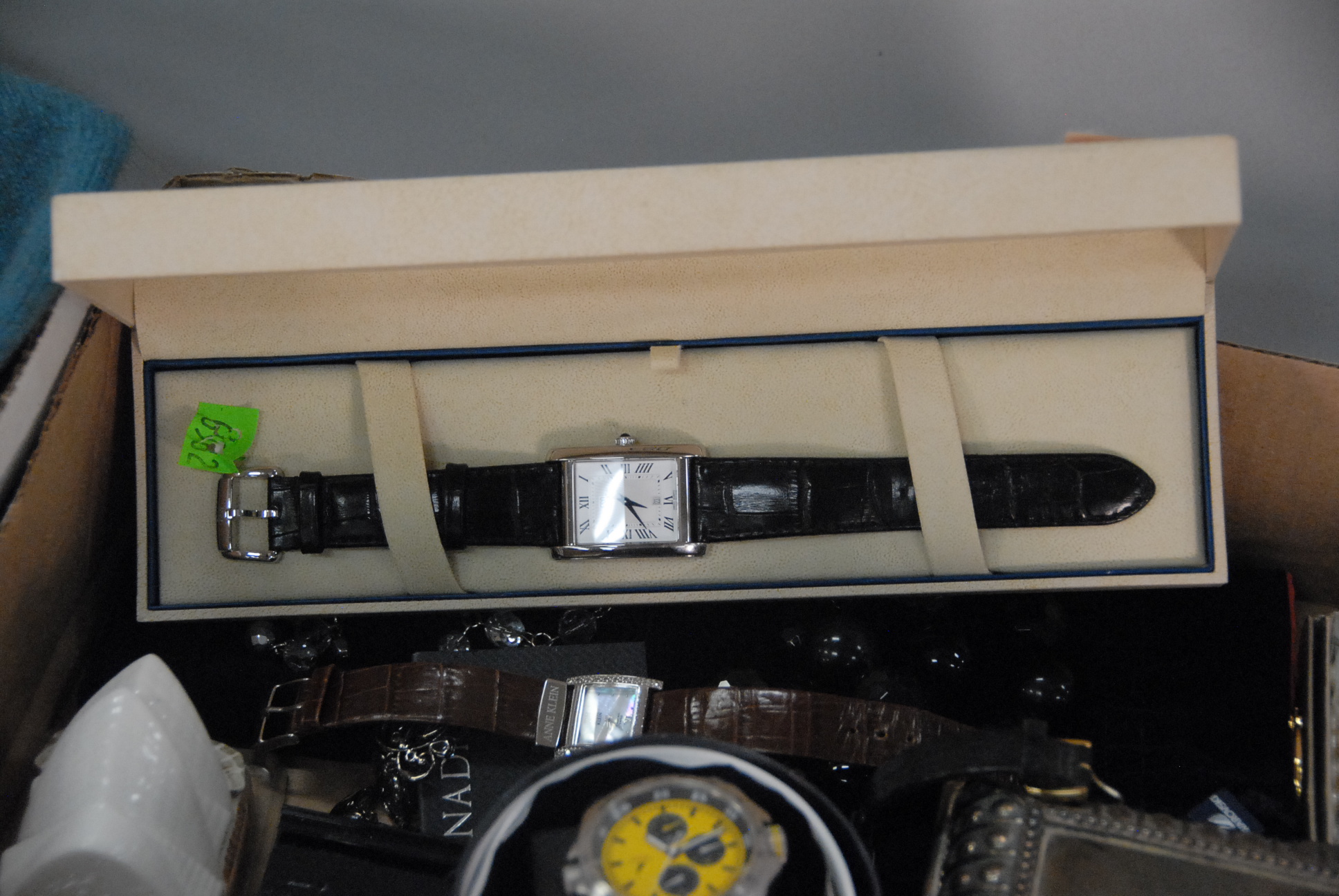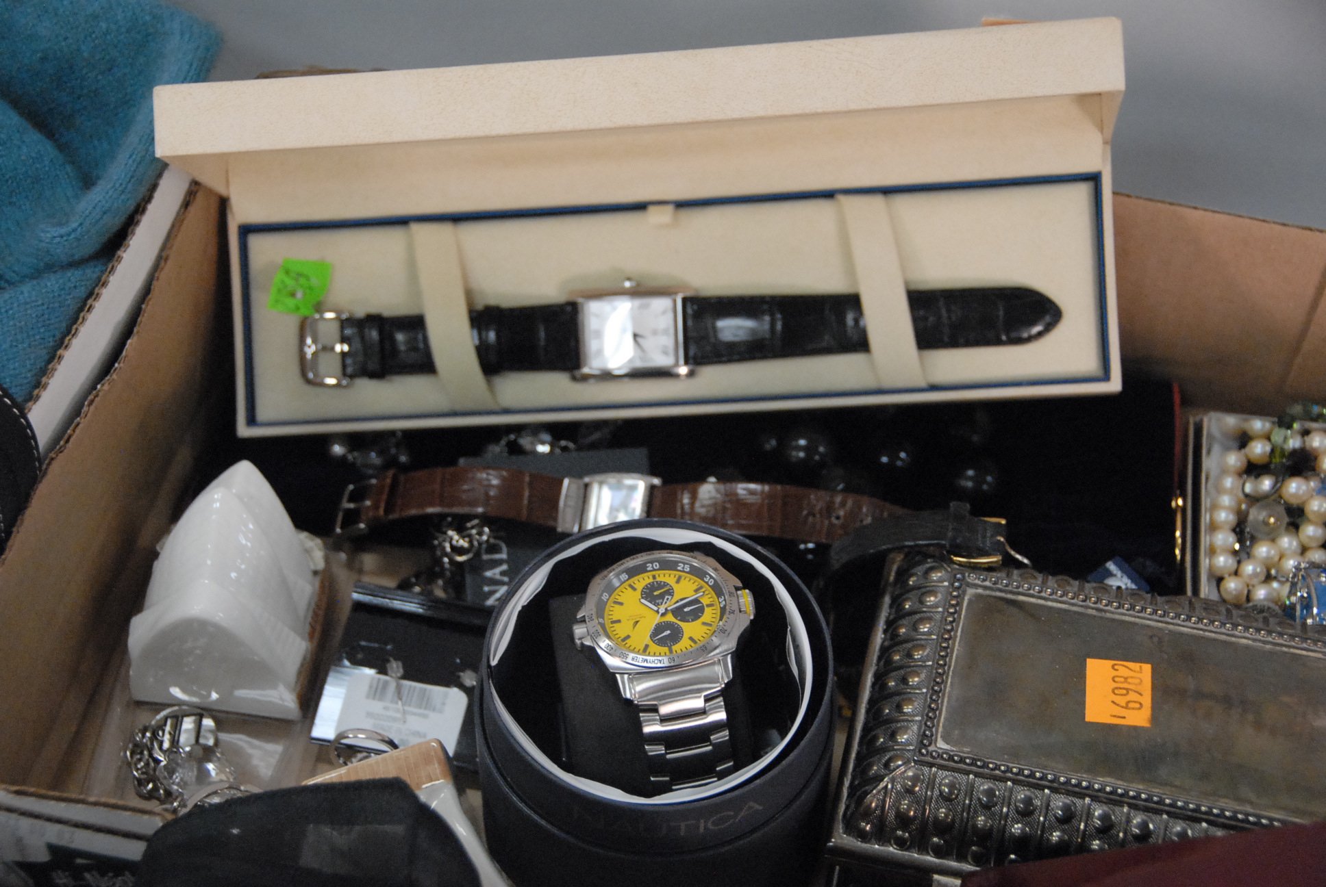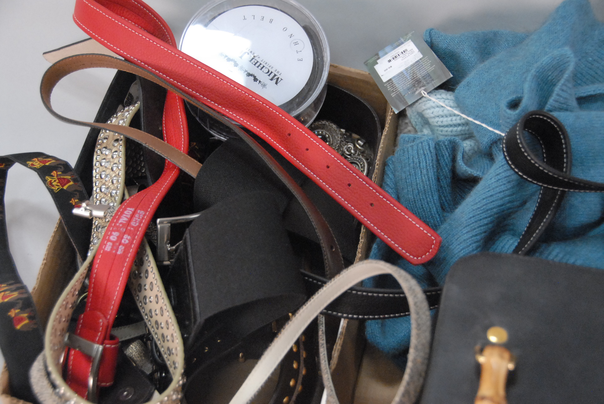 Four tray lots to include a collection of designer belts, costume jewelry, and watches.