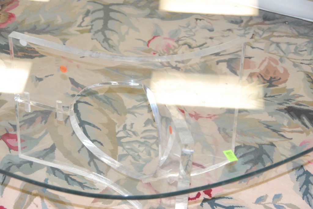 Freeform glass top coffee table with lucite base, ht. 16in. lg. 51in. wd. 36in.