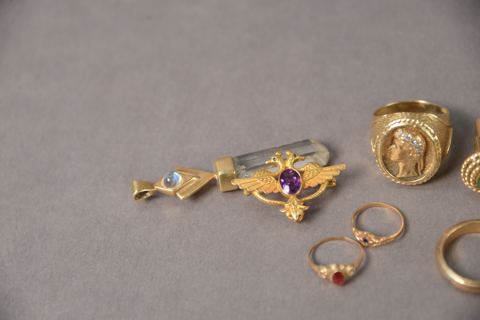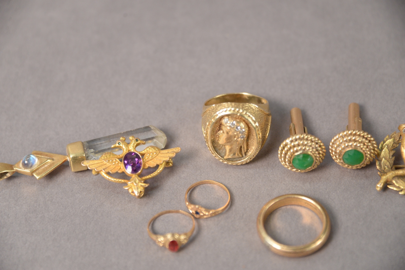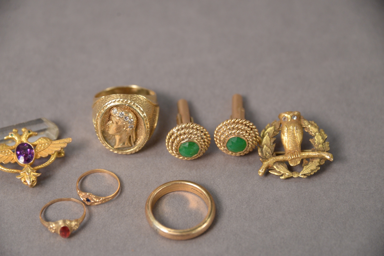 Group of Miscellaneous Gold Jewelry, to include 14 karat and emerald cufflinks, 41 grams total weight.