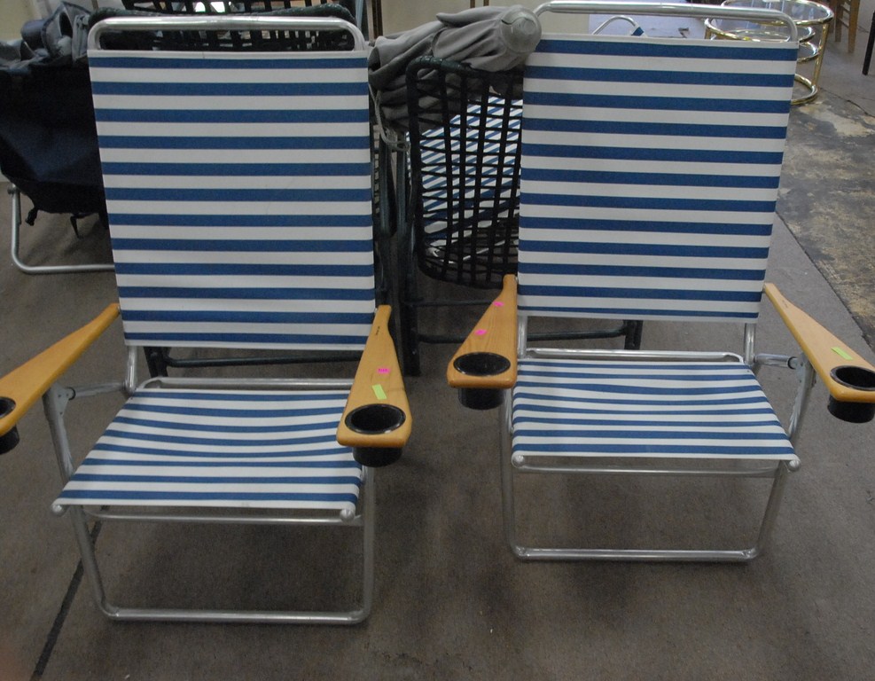 Group of outdoor furniture lounges, chairs, and various folding chairs.