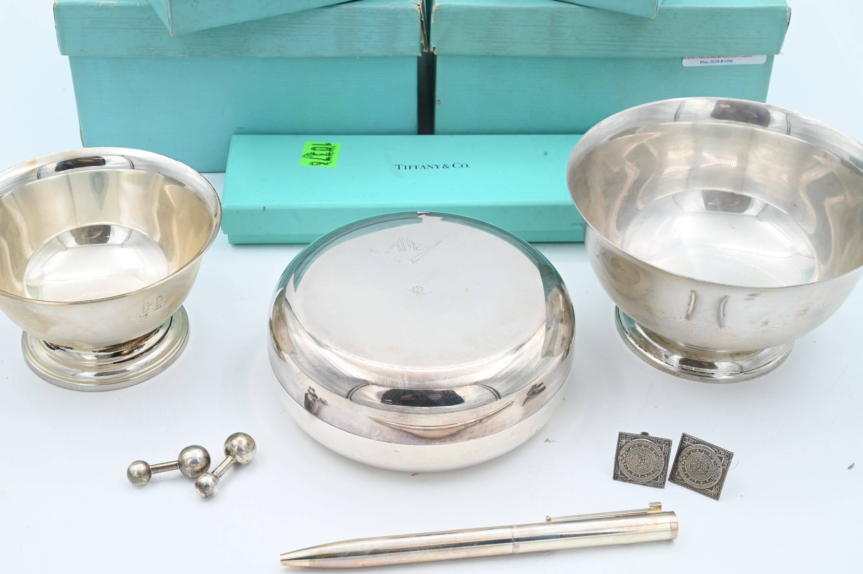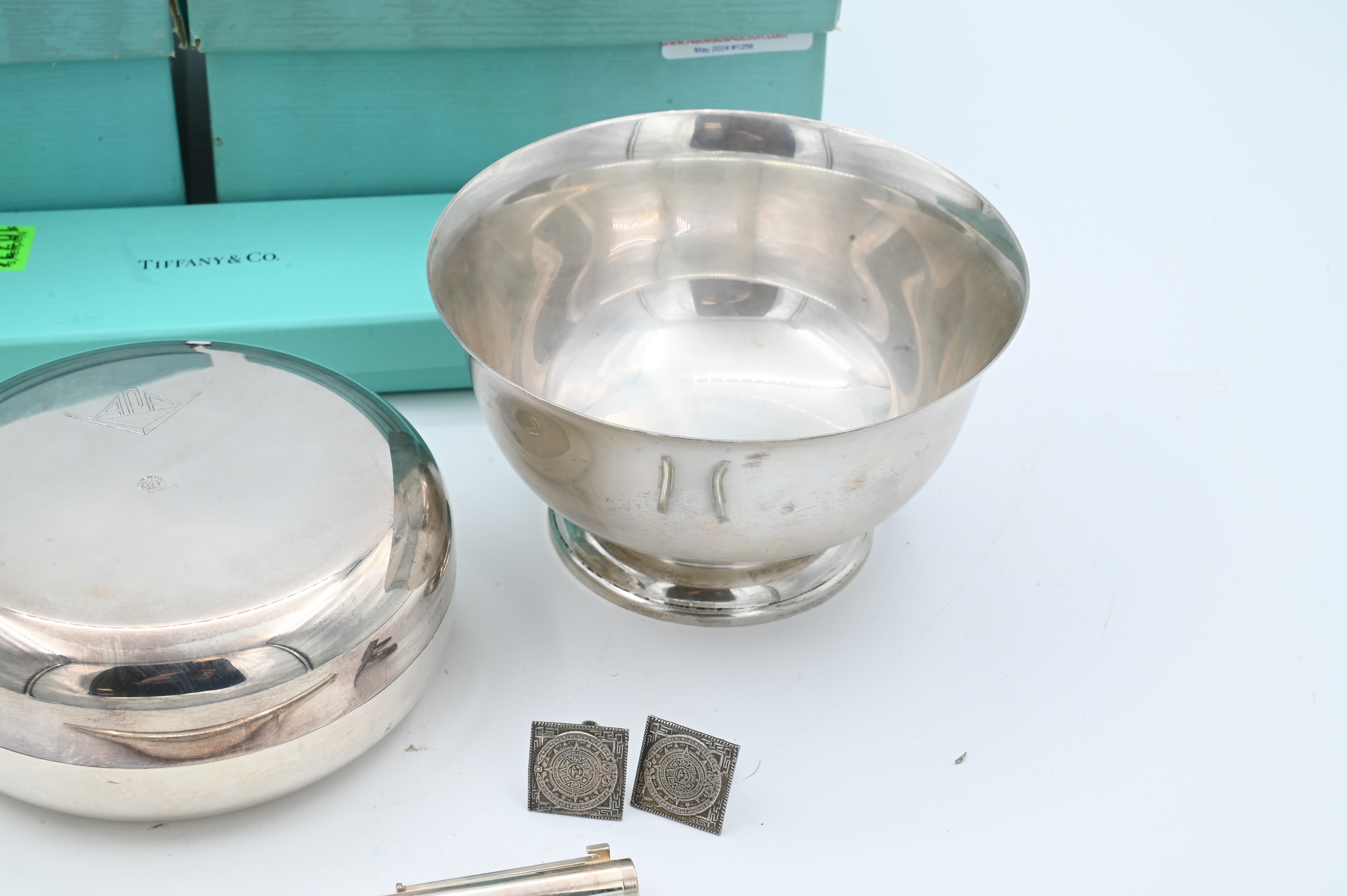 to include Tiffany Revere style bowl with original box and bag, Tiffany sterling cuff links with original box and bag, silver plated Tiffany powder box in original box and bag with receipt, pair of unmarked cufflinks, along with Cartier sterling marked Paul Revere 1227