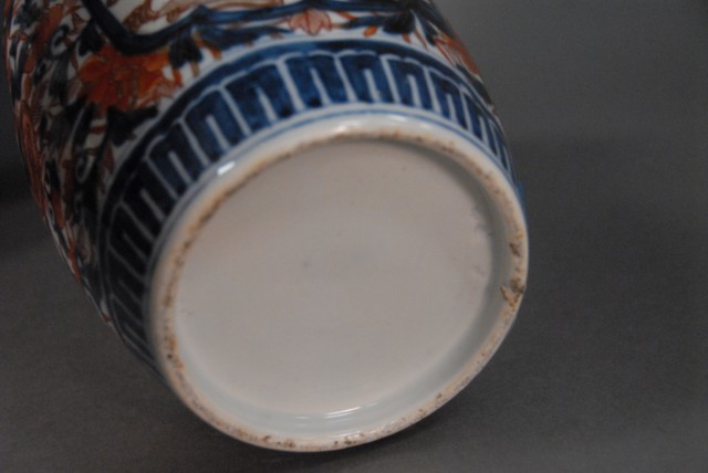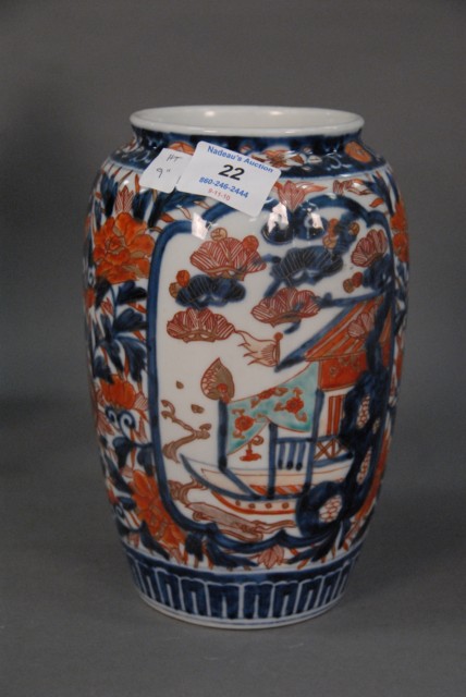 Iron red, blue and gold vase having 2 panels painted with courtyard scenes and an overall scrolling vine and flower decoration.