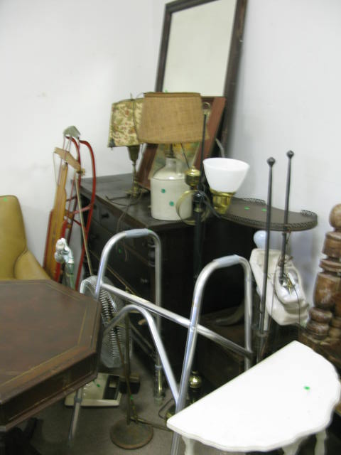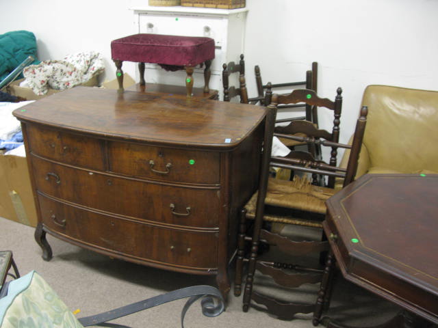 Large group of furniture to include Sheraton style chest, drum table, two over two drawer chest, ladder back chairs, vinyl cover chair, sled, fan, small tables, painted chest, footstool etc.