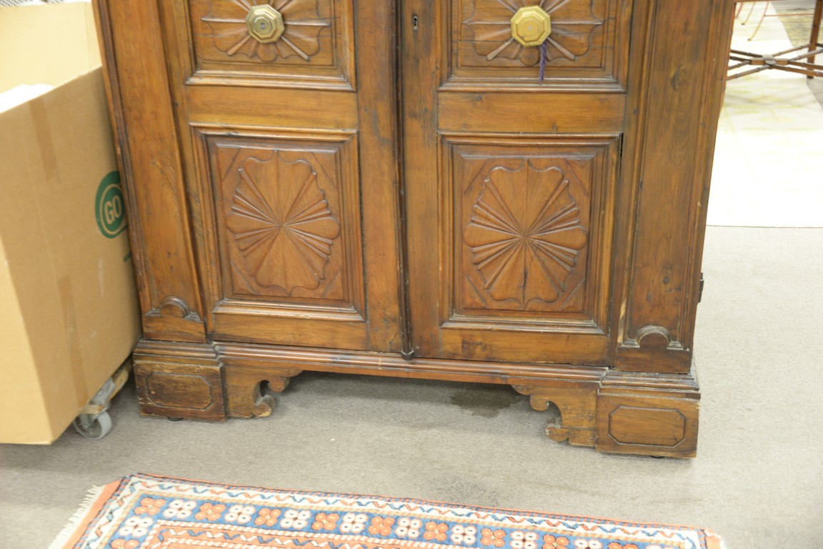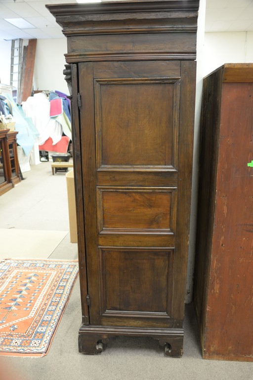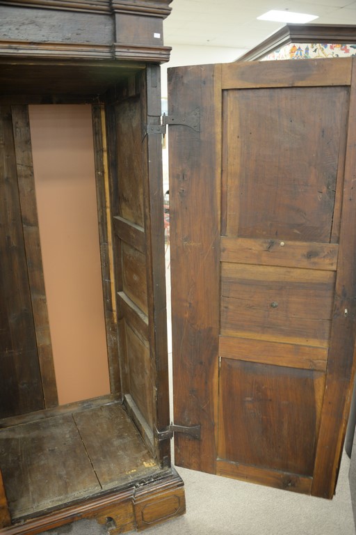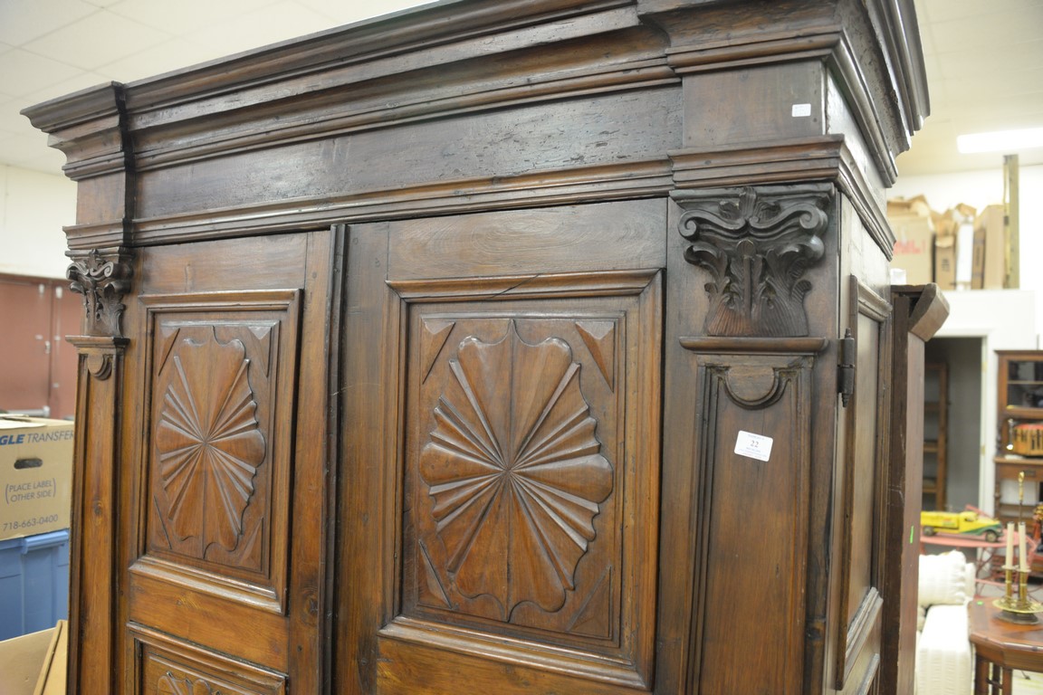 Lot 22: Large Italian armoire having two carved doors flanked by carved columns, 18th century. ht. 84in., wd. 59in., dp. 30in.