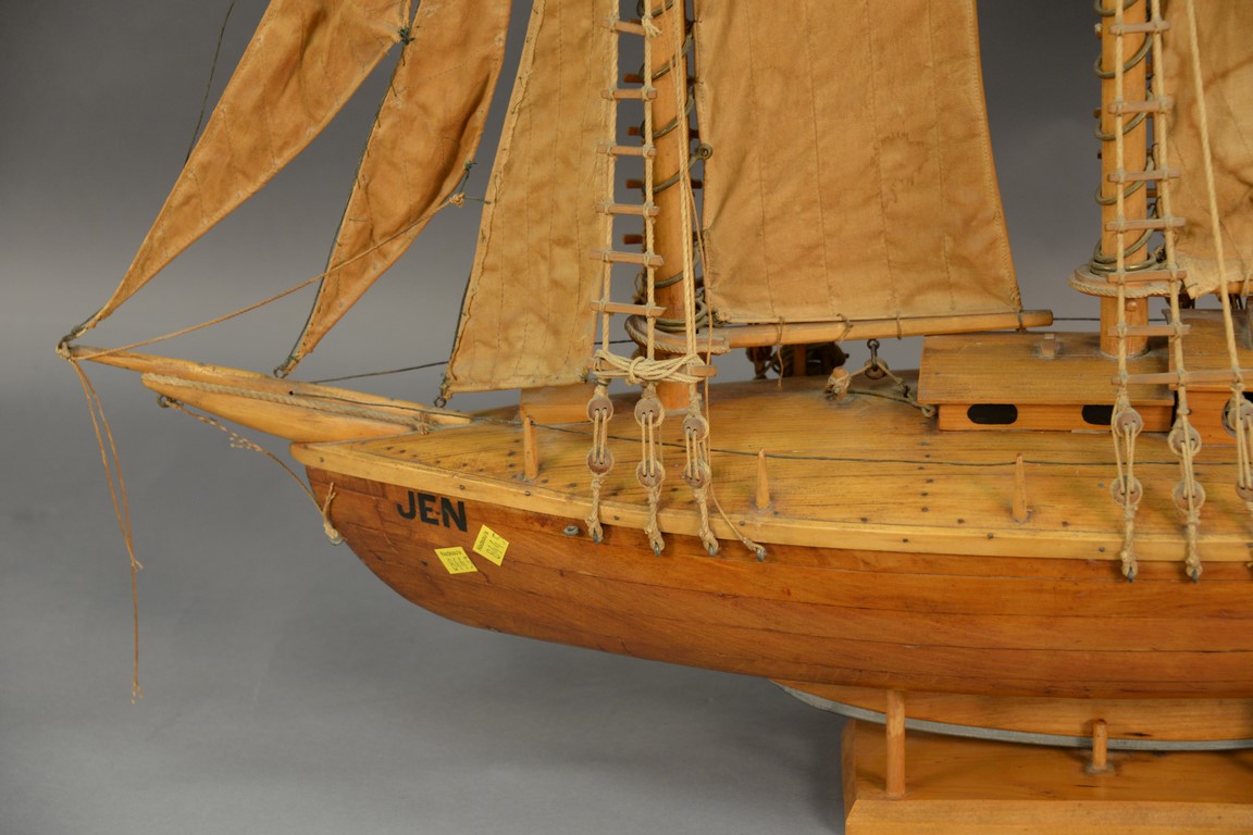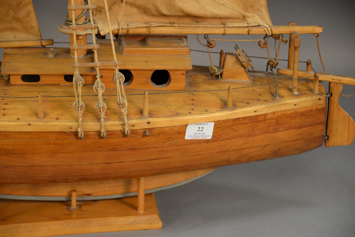 Lot 22: Large vintage sailing boat model with cloth sails. ht. 32 1/2in., lg. 36in.