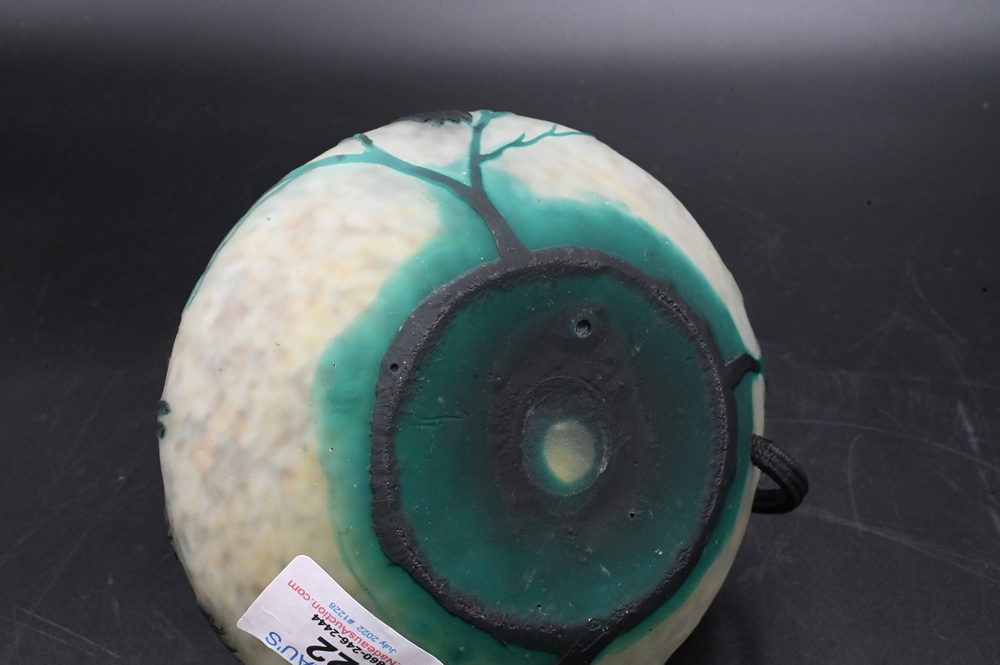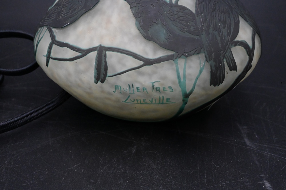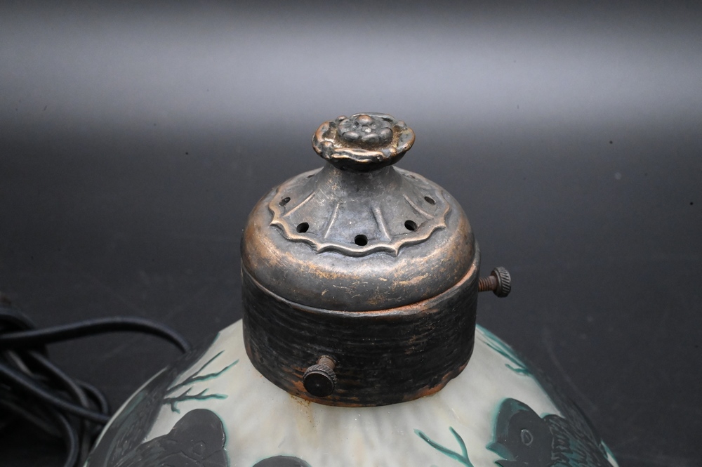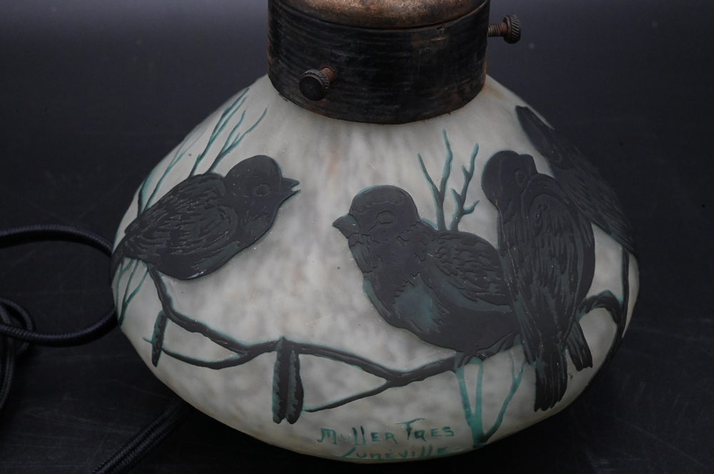 Muller Freres Cameo Glass Perfume Lamp, decorated with birds perched on branches, height 6 inches.