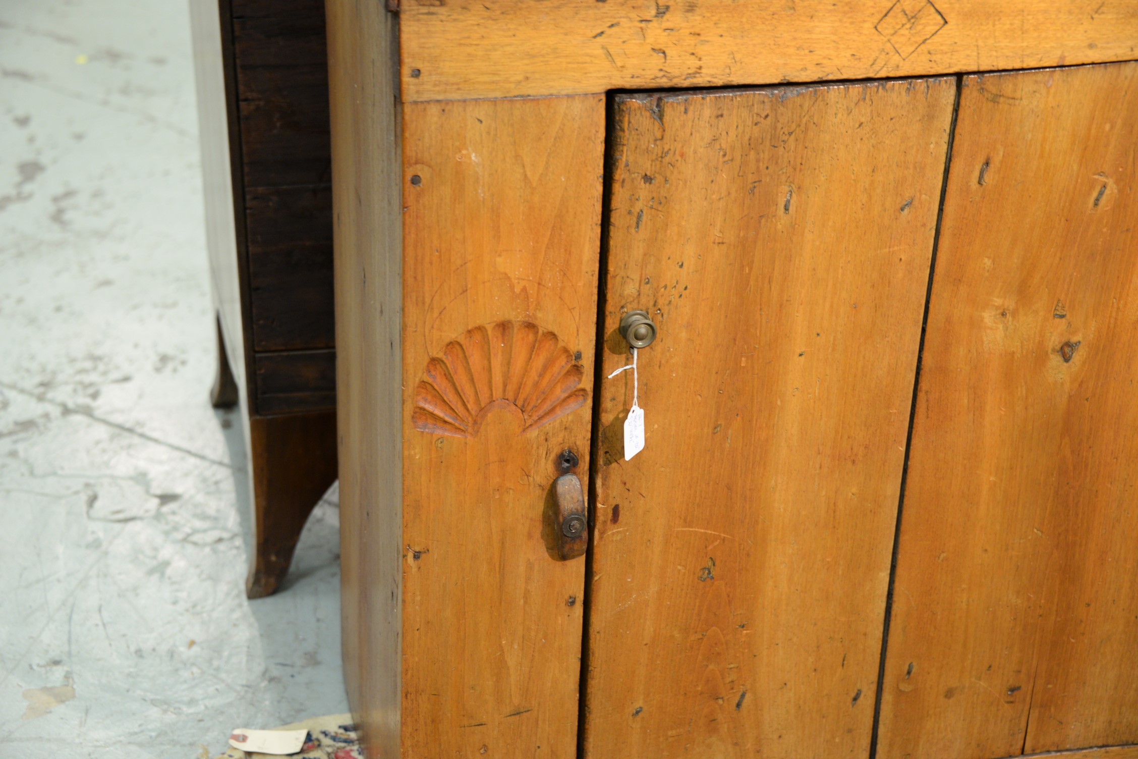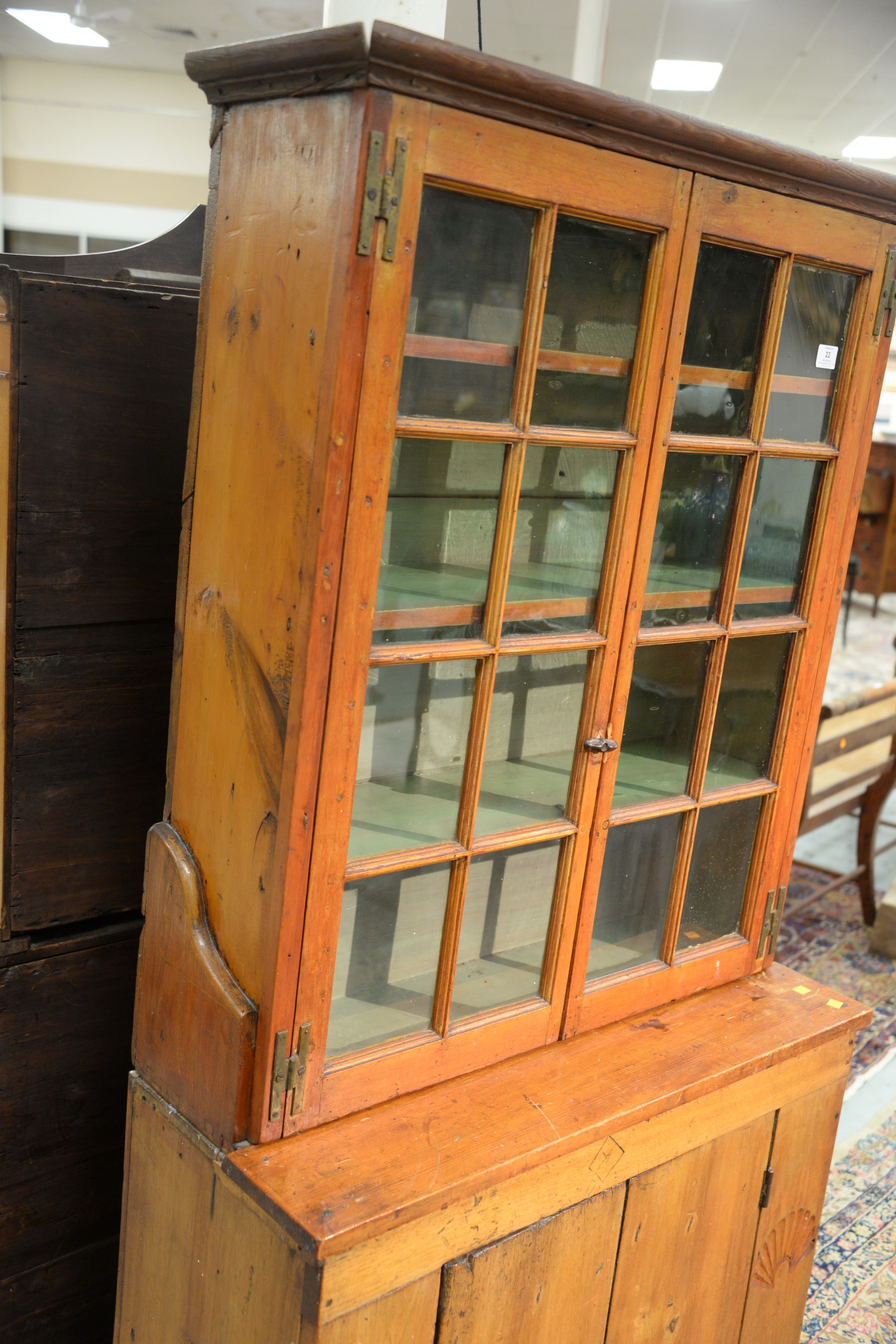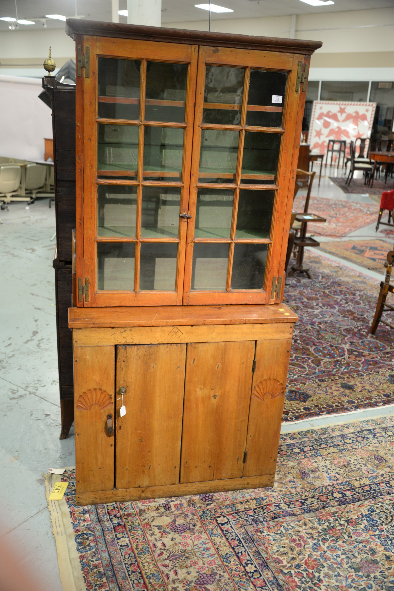 Lot 22: Primitive cupboard in two parts, upper portion with two glazed doors with H hinges on lower portion with one door flanked by fan car…