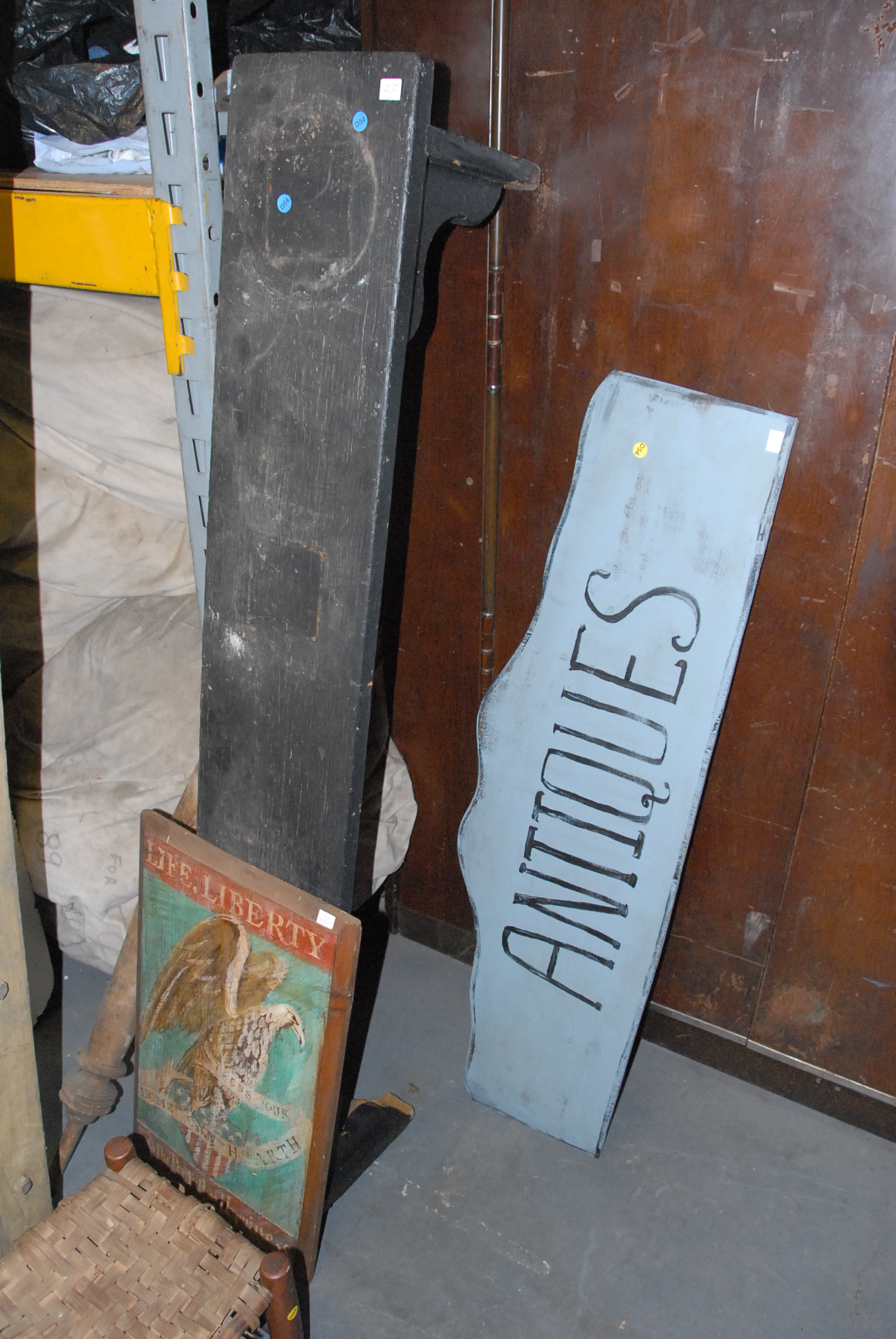 Primitive lot including an ironing board, wooden extension ladder, apple picking ladder, antique sign, bench, an eagle sign, a paddle, and a footstool.