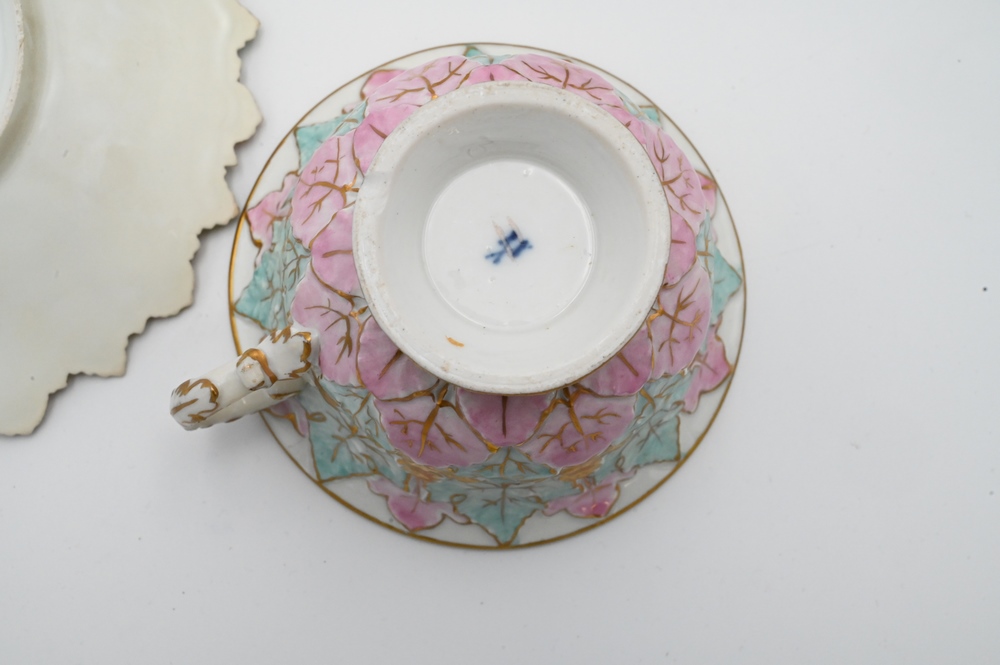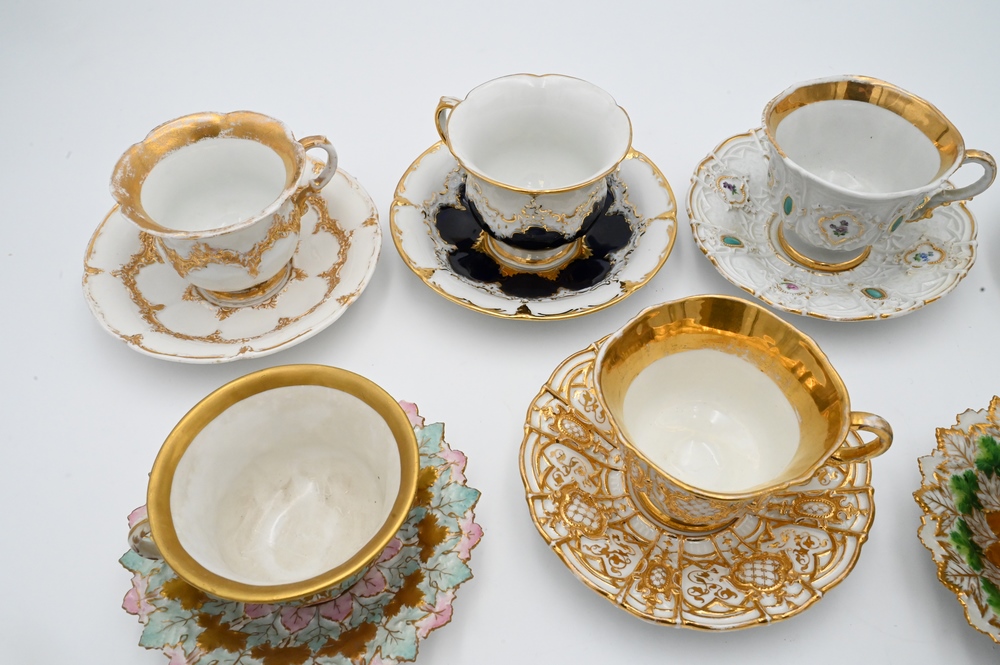 Seven Meissen Cups and Saucers, marked with crossed swords, cup height 2 3/4 inches, diameter 4 inches.