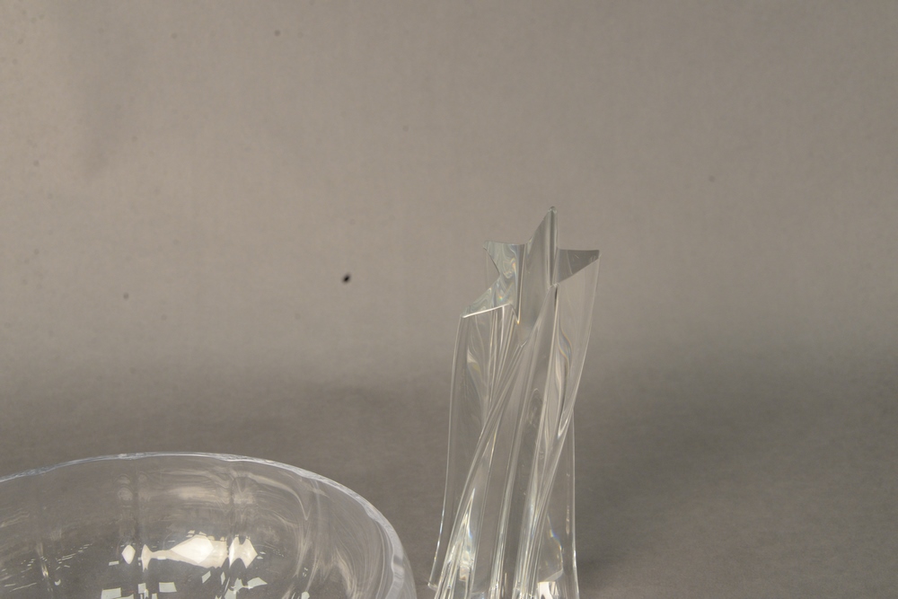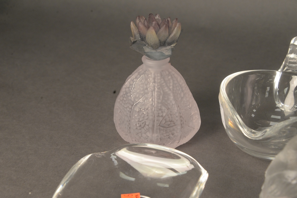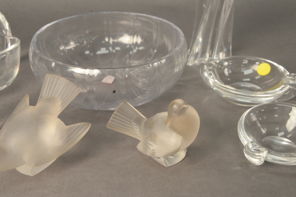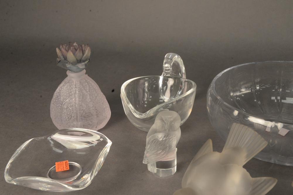 Lot 22: Ten Piece Art Glass Lot, to include two Lalique birds, a Lalique owl, four small Steuben bowls, one large Daum bowl, a Daum flower f…