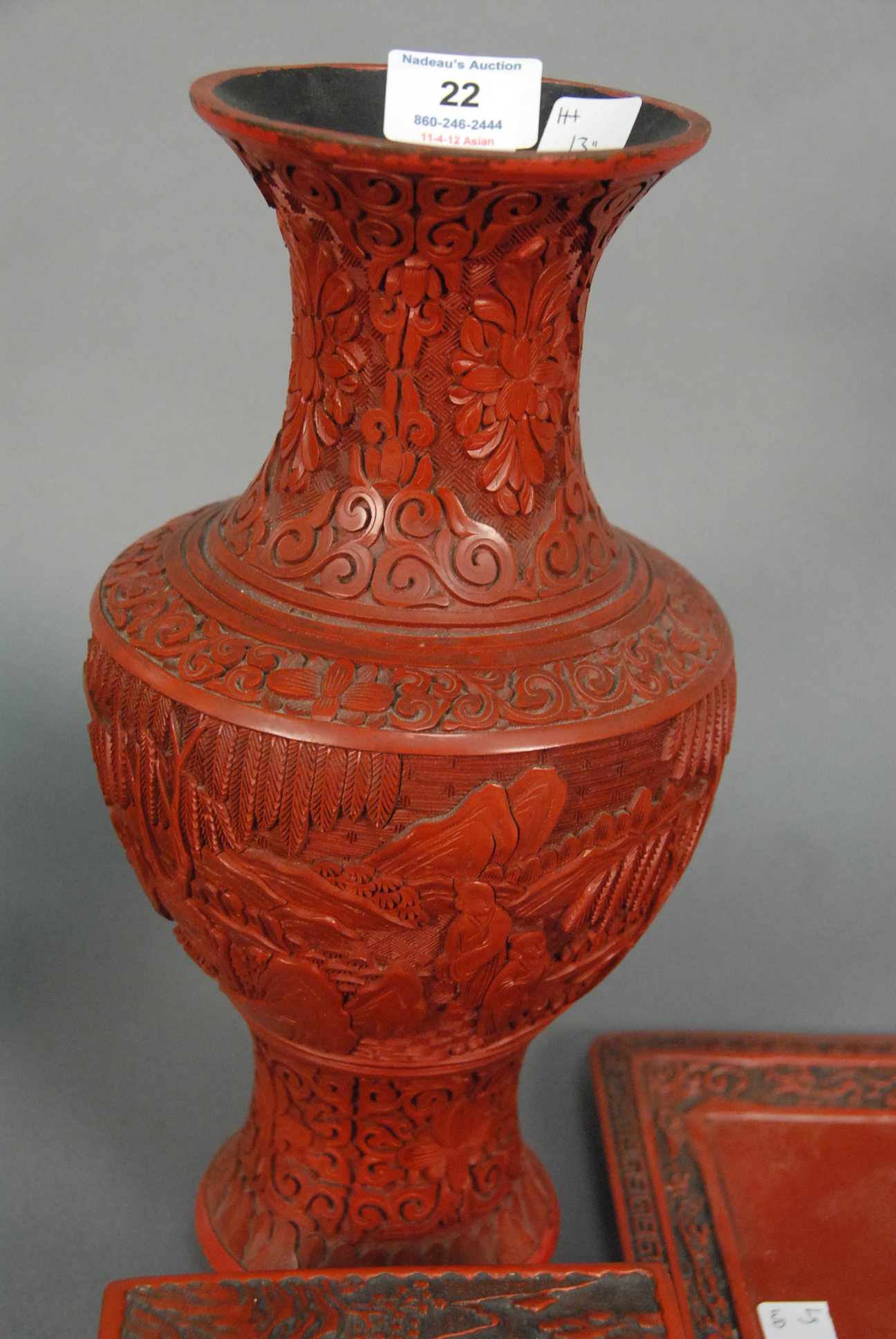 Three cinnabar pieces baluster form vase with carved landscape scene ht. 13in., covered box with landscape scene 5 1/4 x 4, and an under plate.