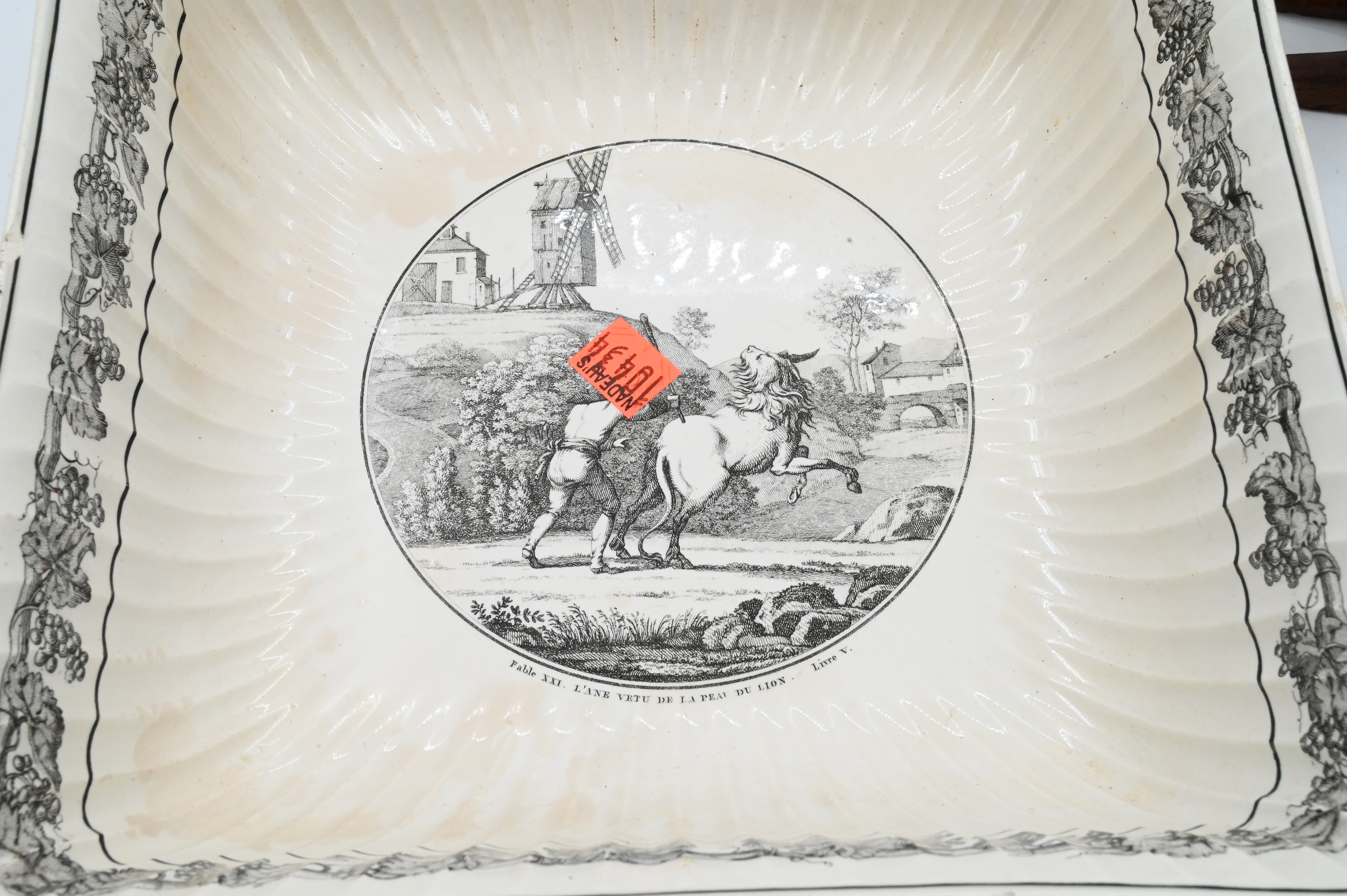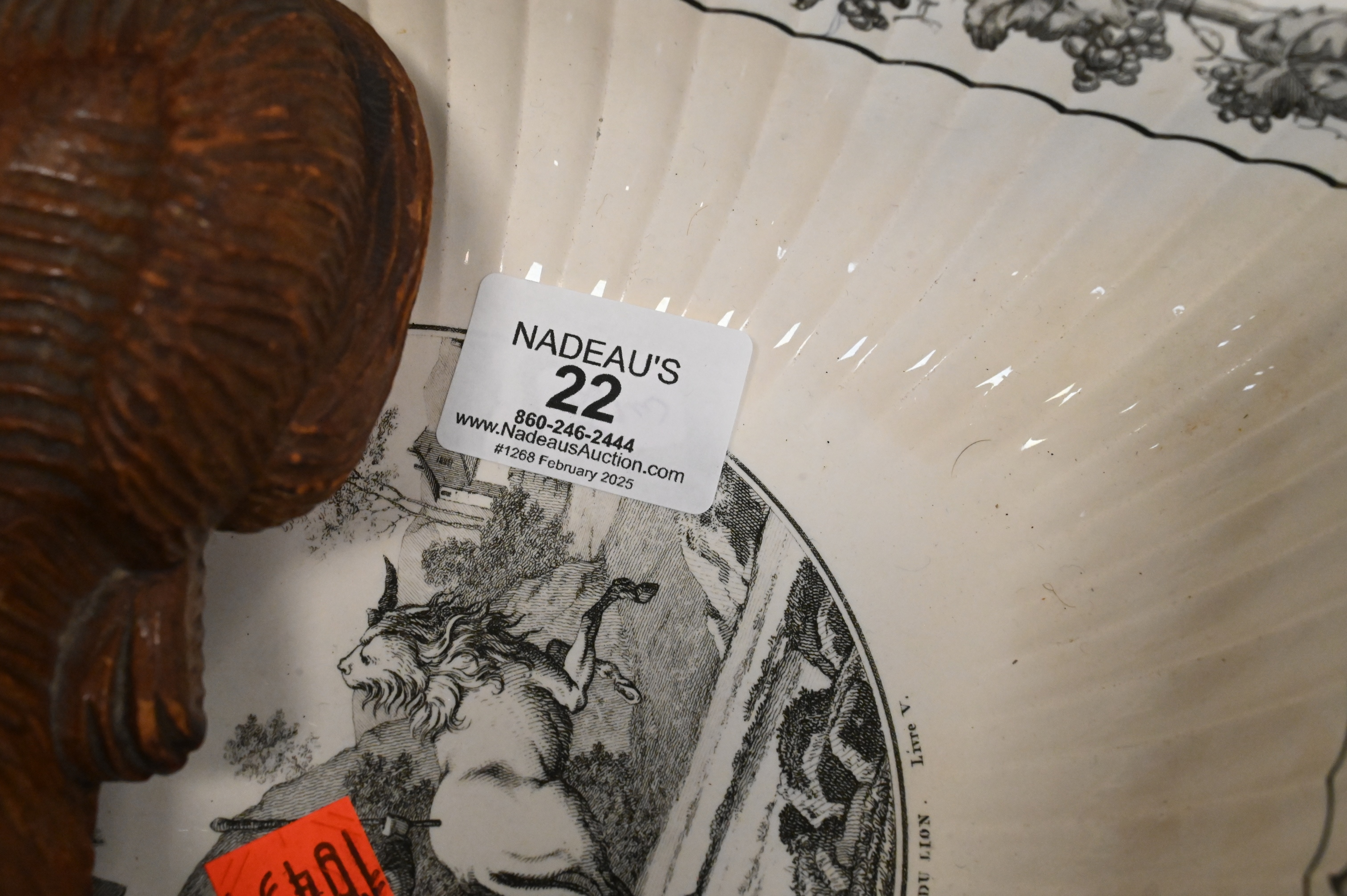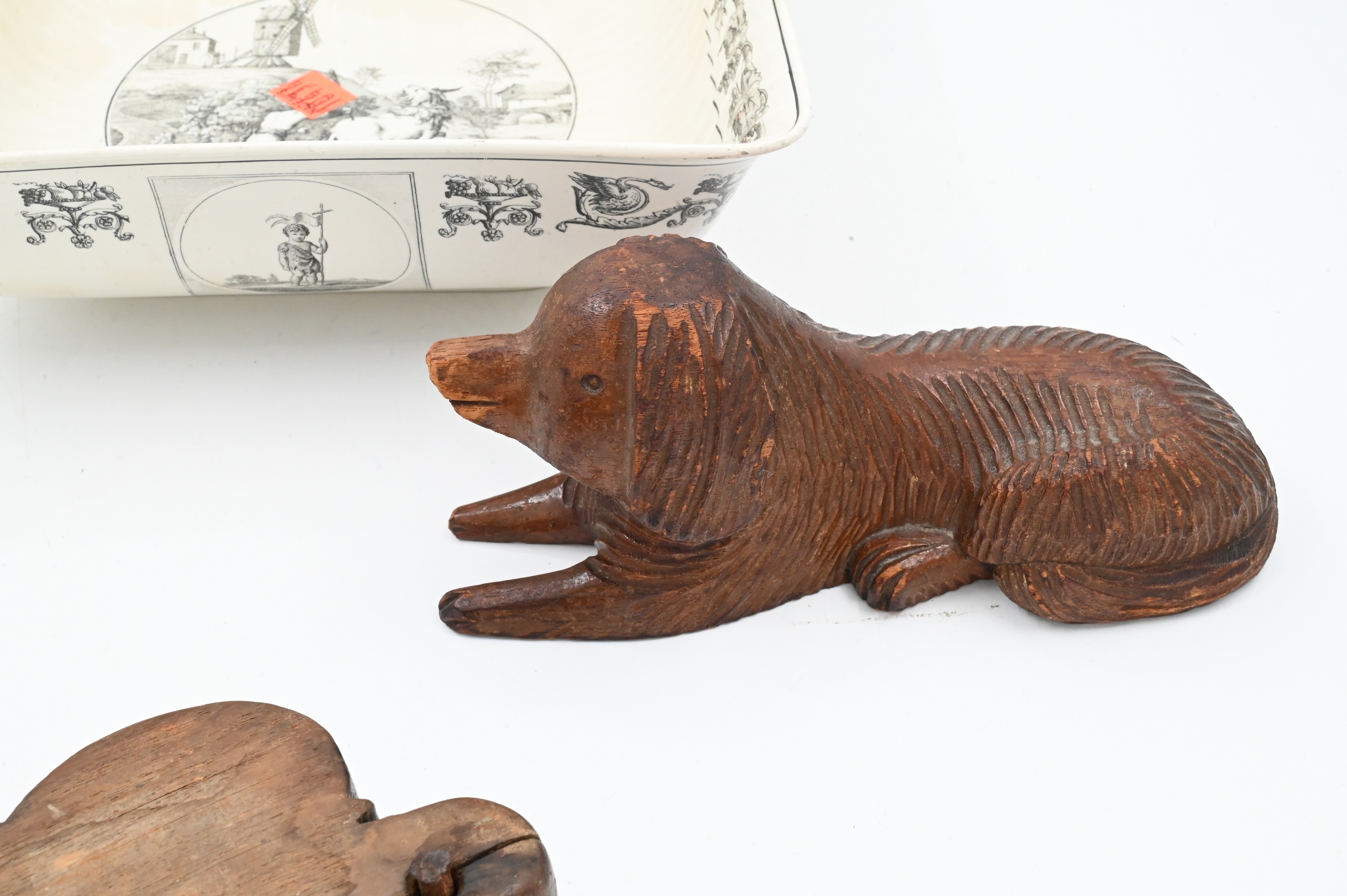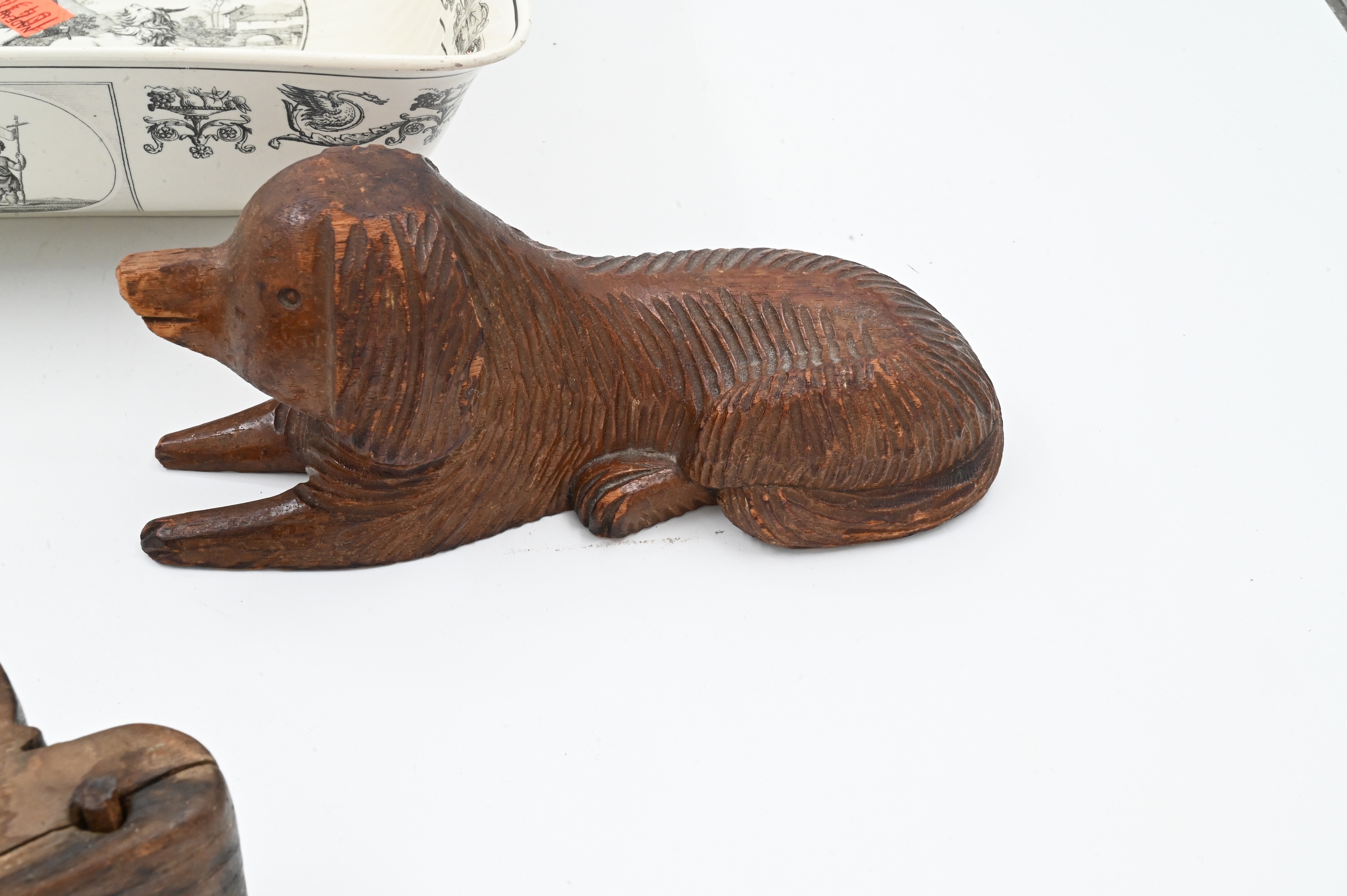 to include carved dog pediment, carved opium scale/weight box, along with an English ironstone bowl