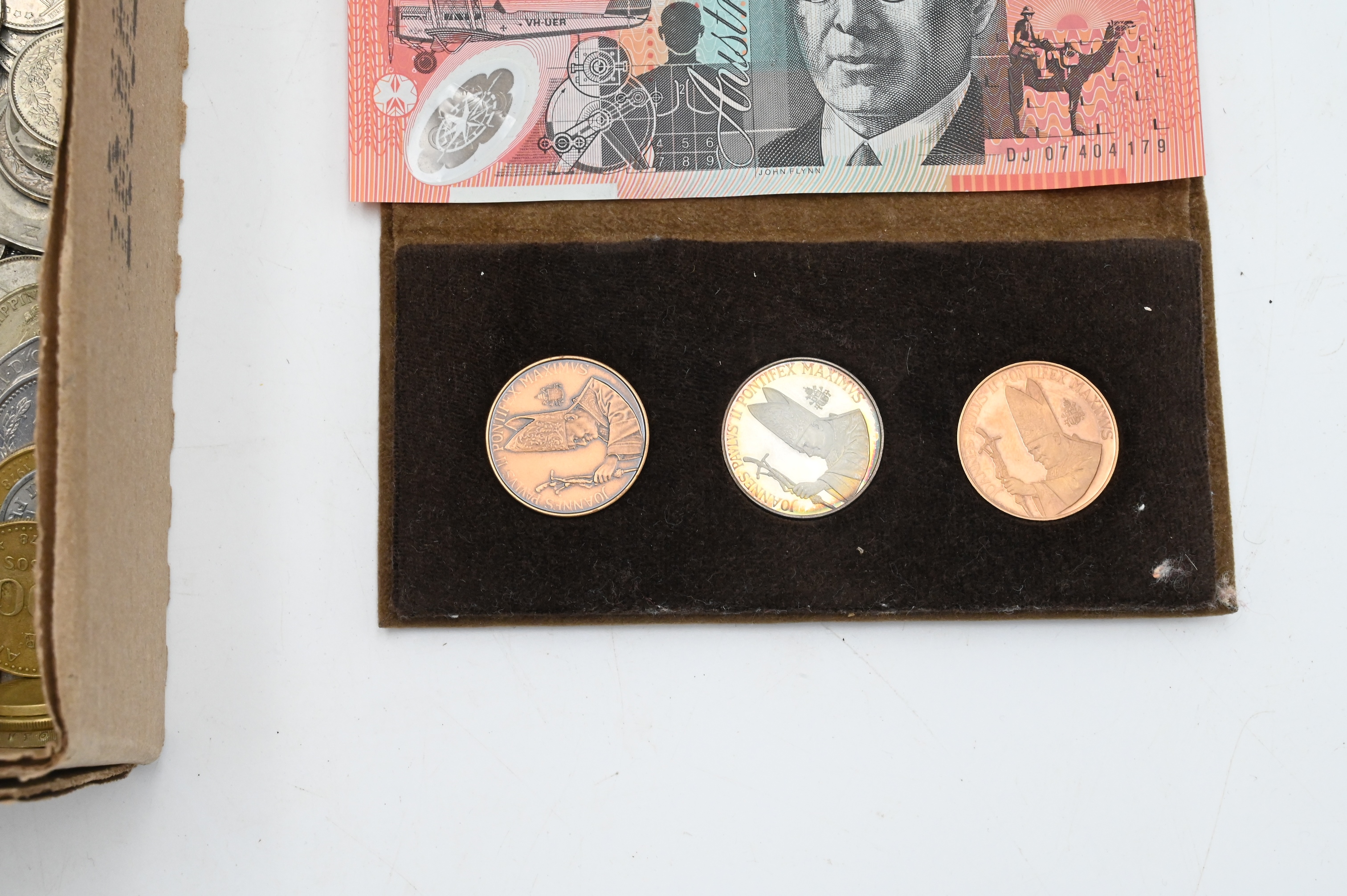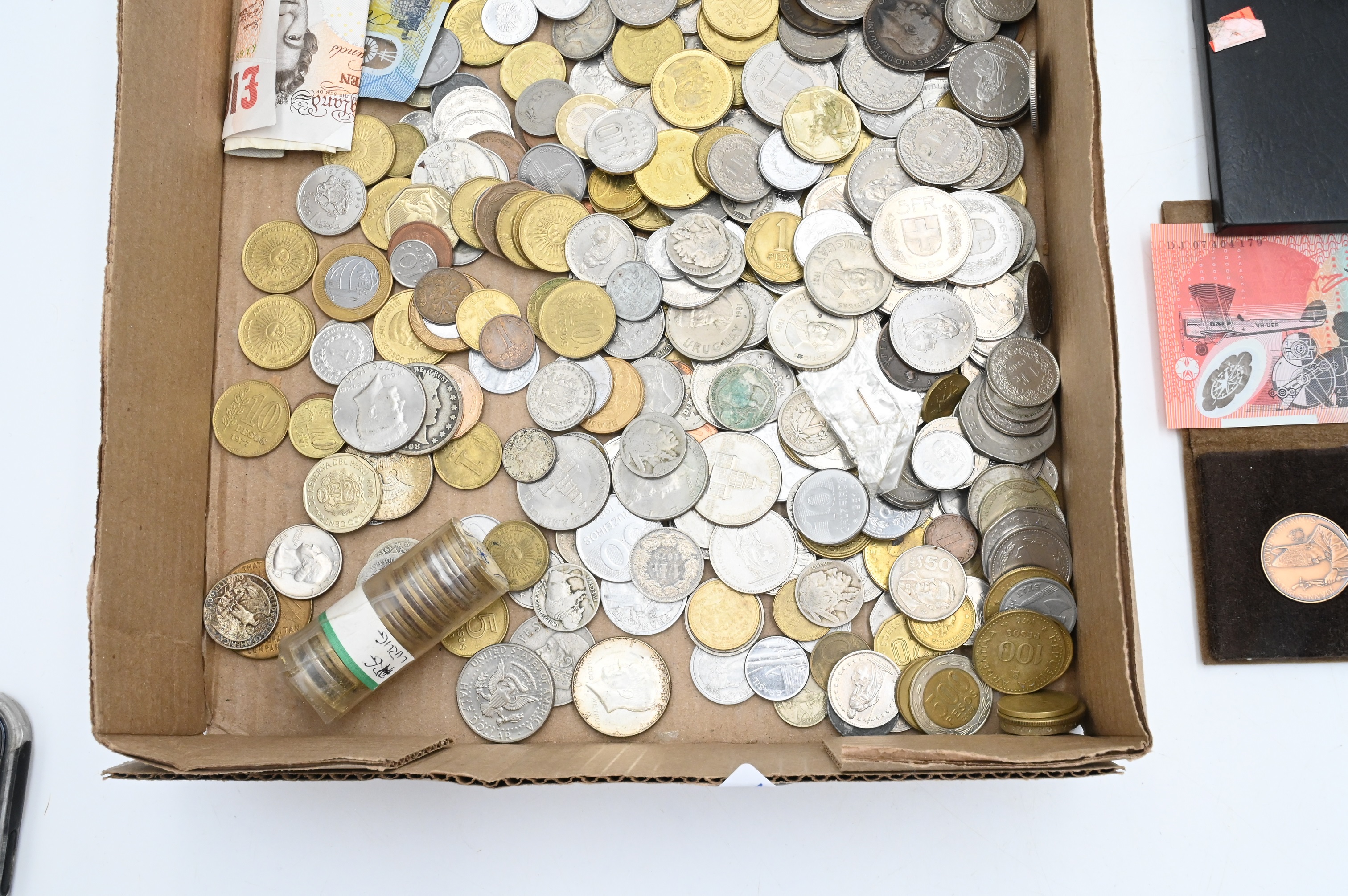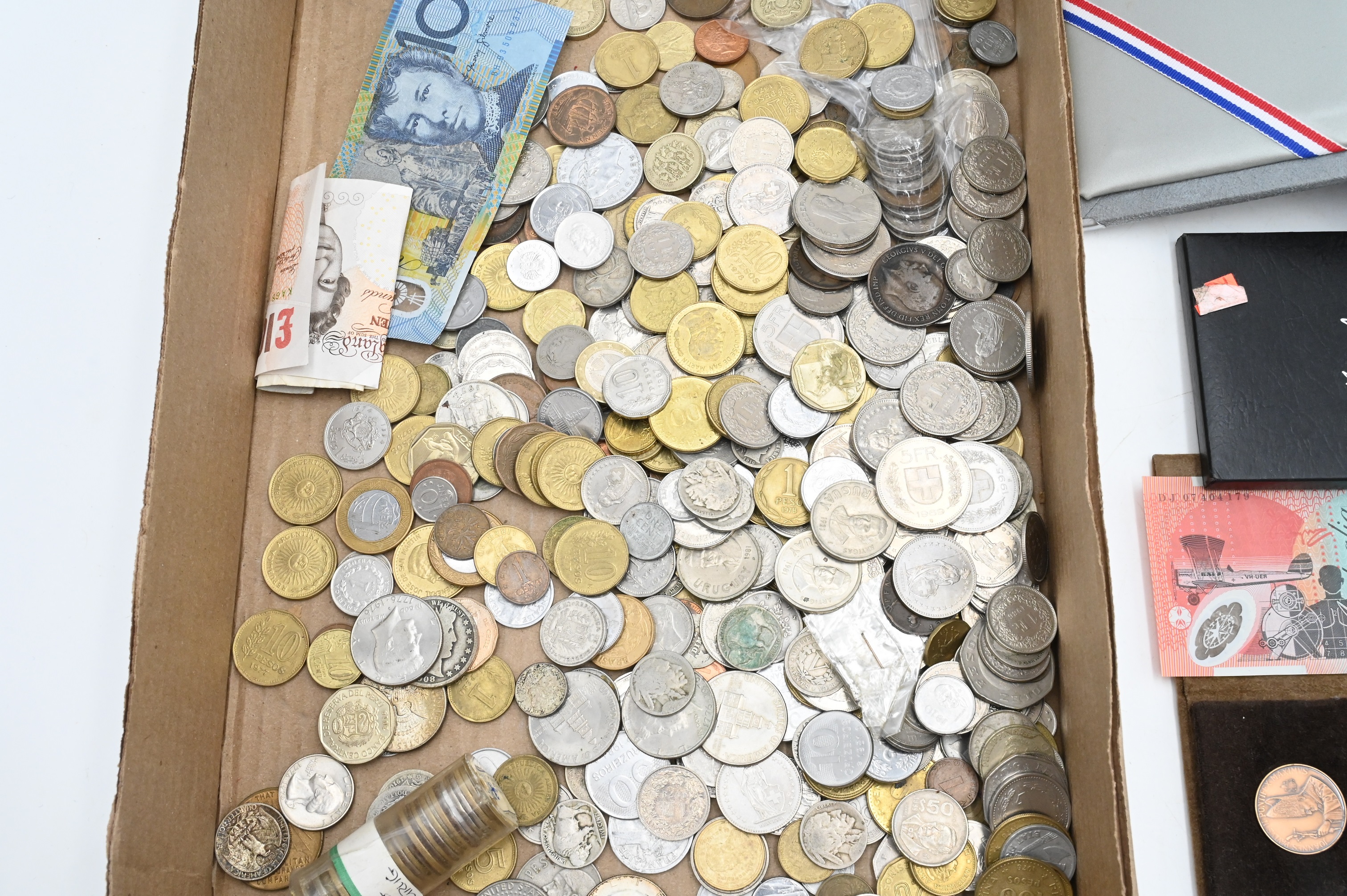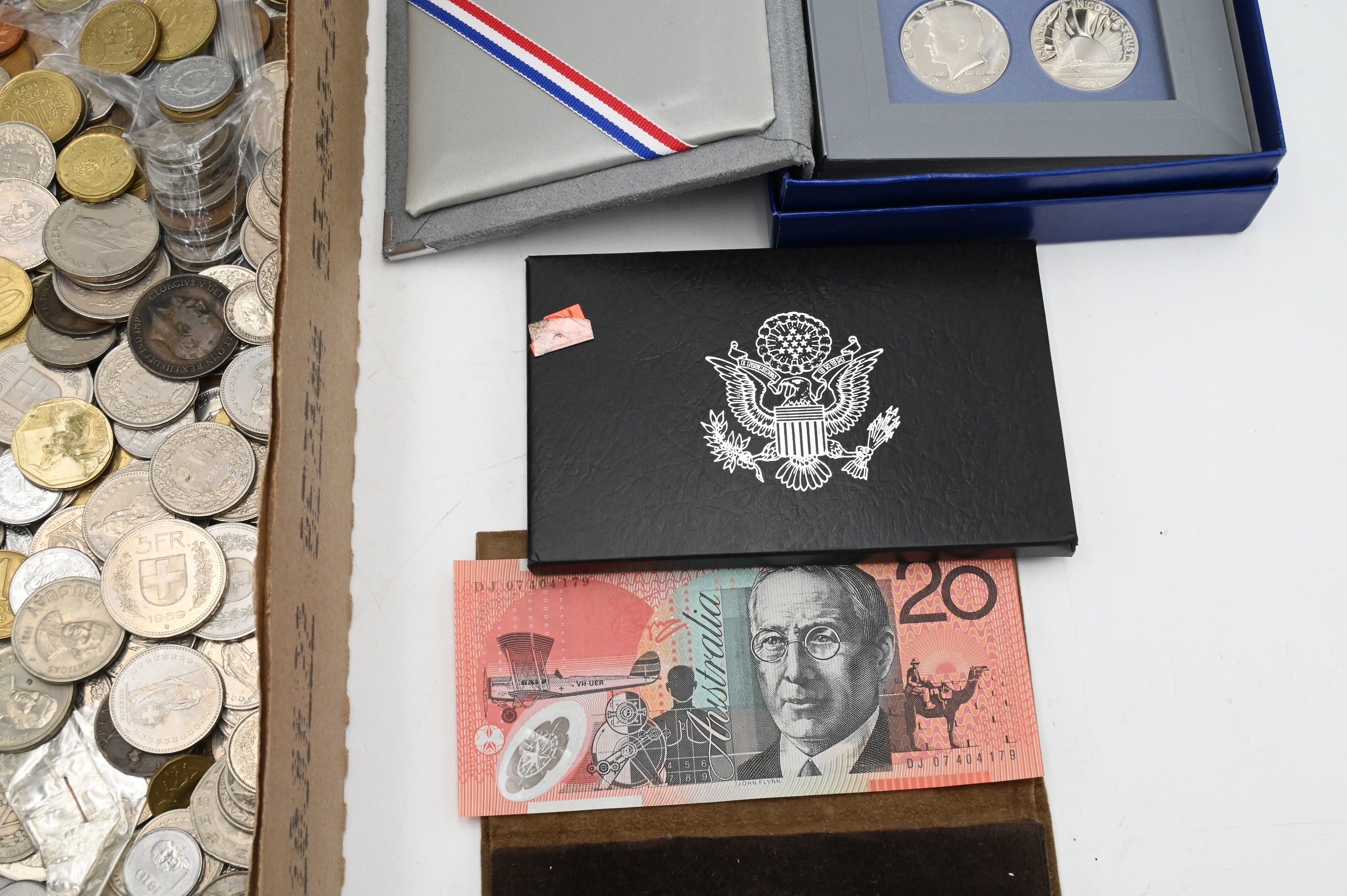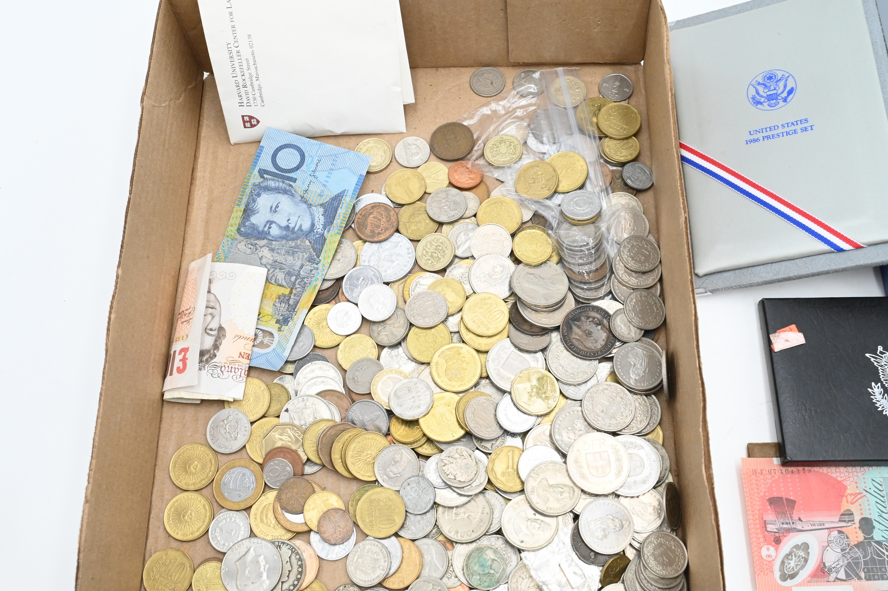 Tray Lot of Assorted World and United States Coins, to include 1993 silver proof set, and 1996 Liberty Prestige set