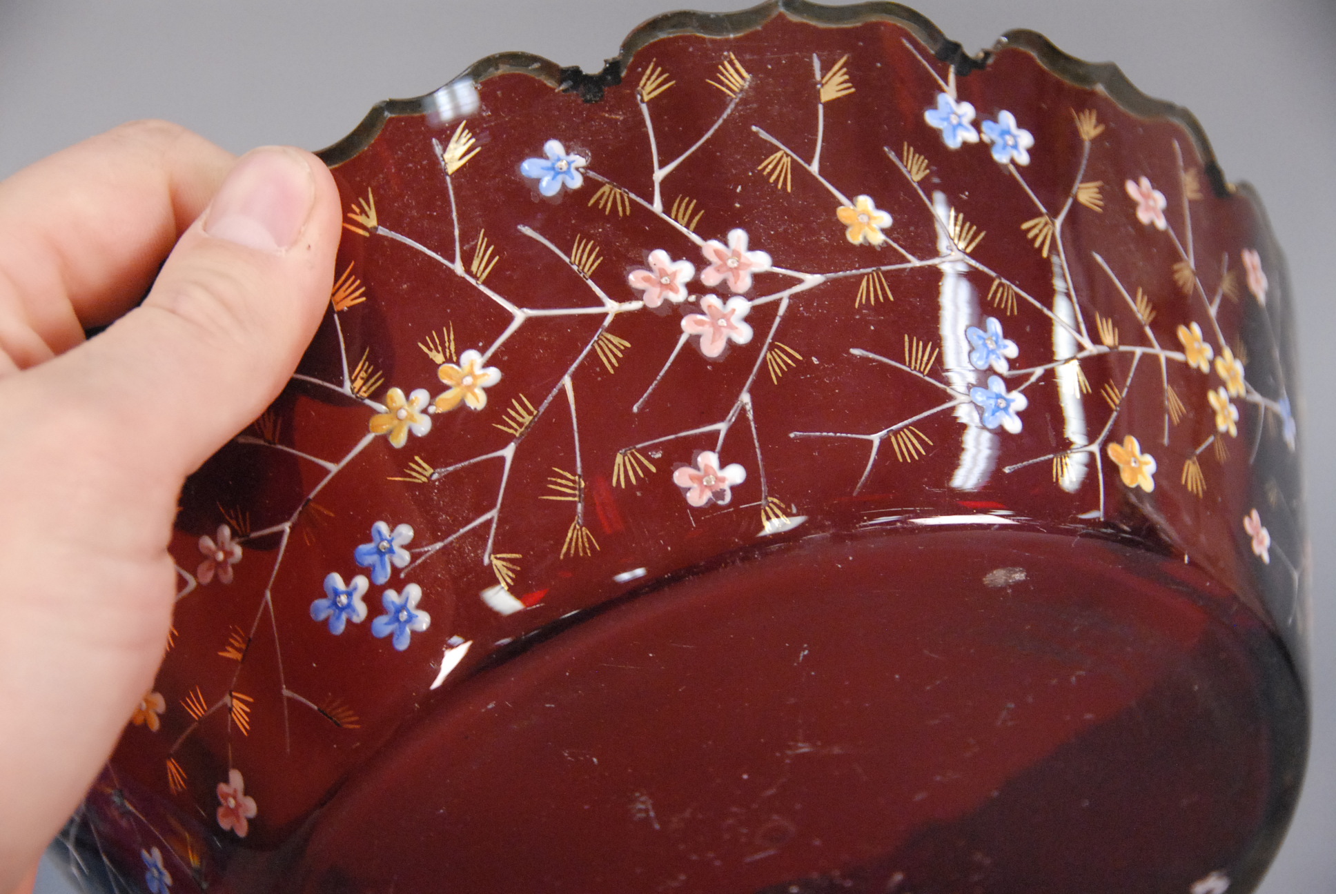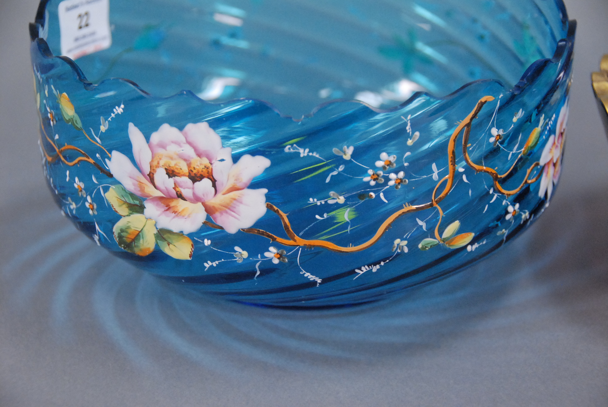 Lot 22: Two bowls with enamel decoration, one cranberry ht. 3in. dia. 9in. and one blue ht. 4in. dia. 9in.