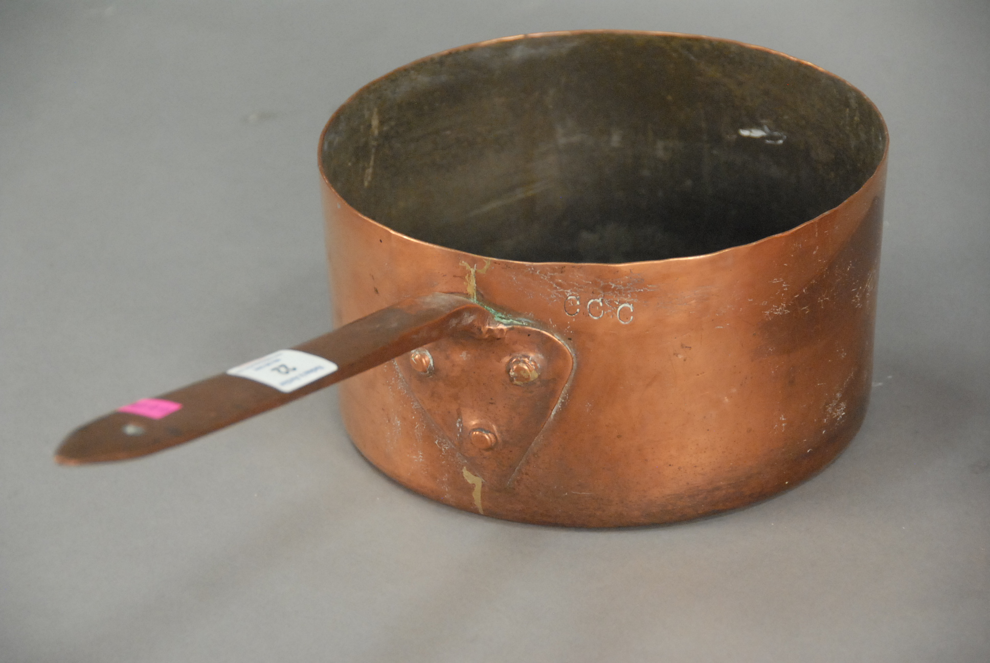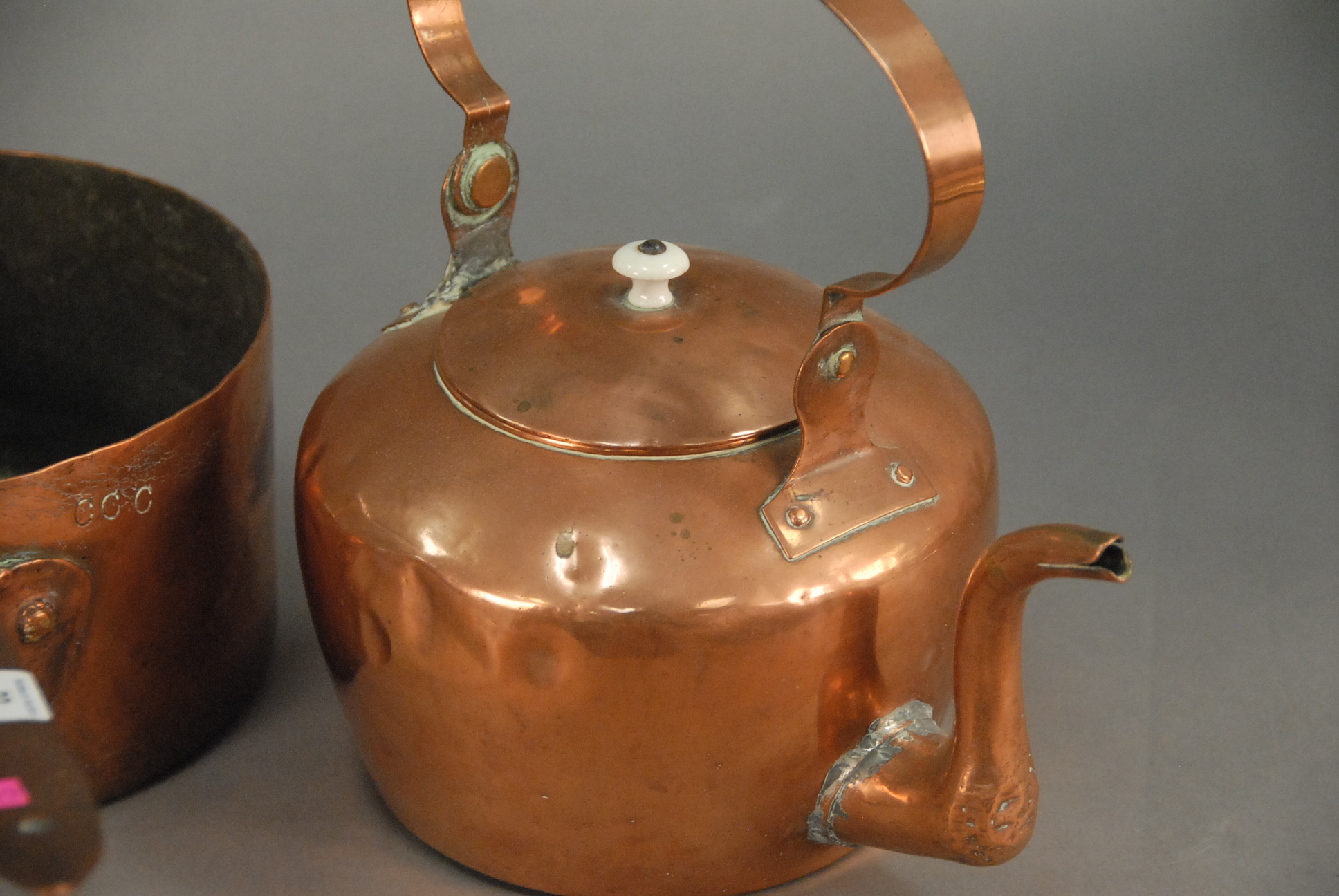 Two early copper pieces, large pot and teapot signed W. Ihling. ht. of teapot 11 in.