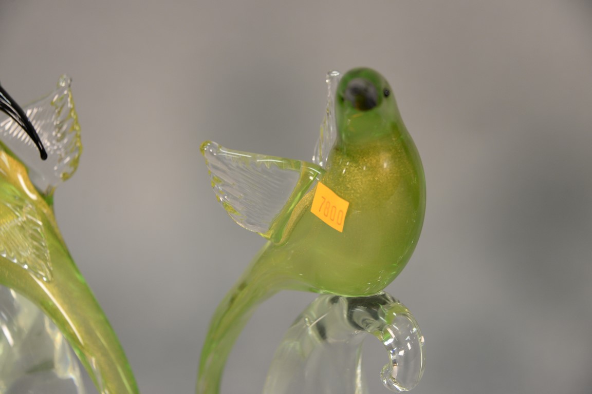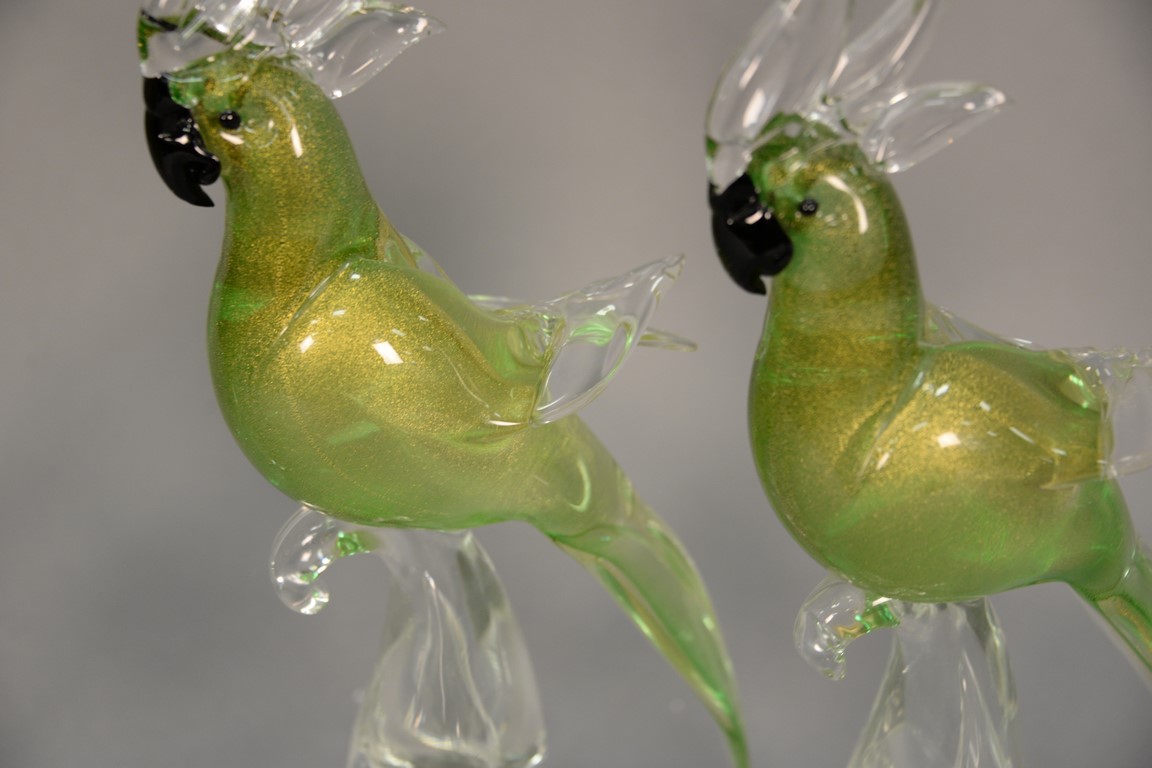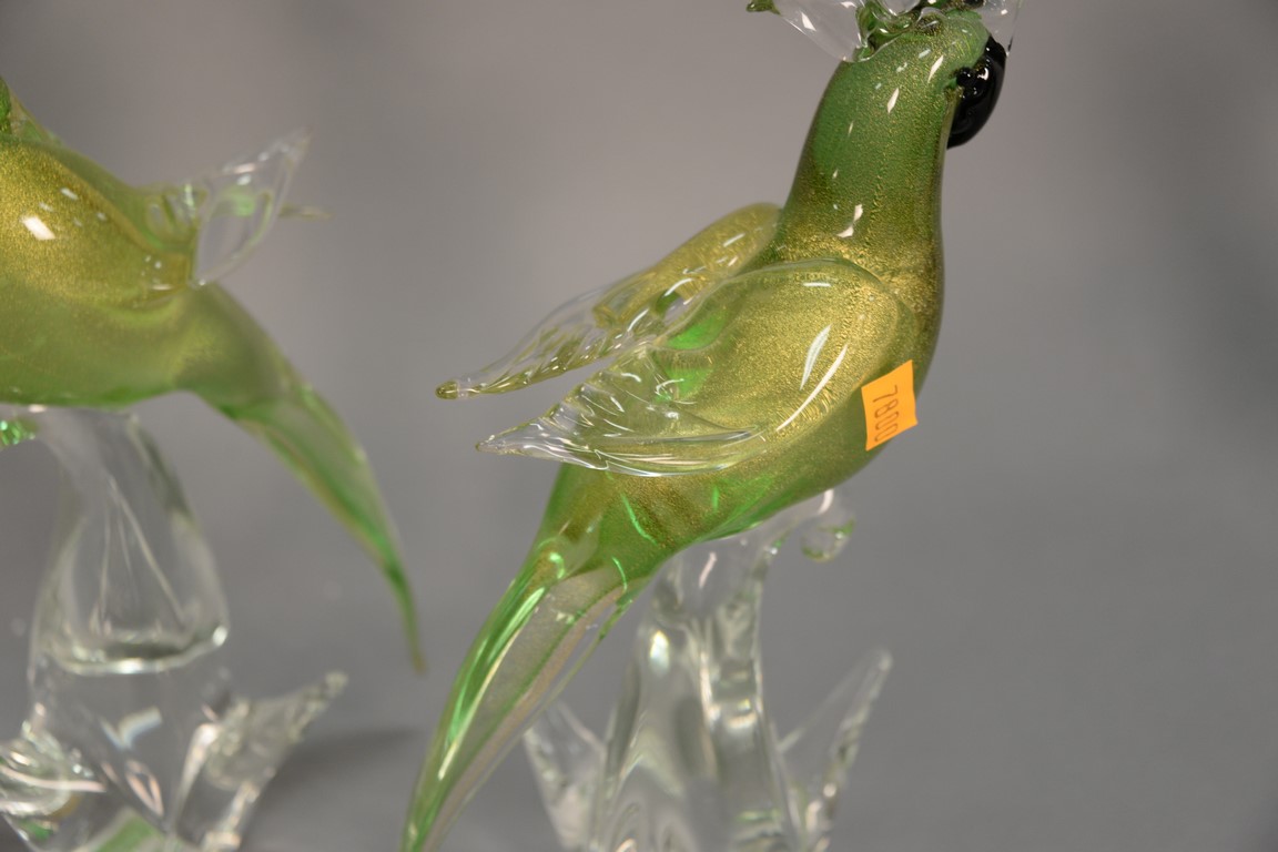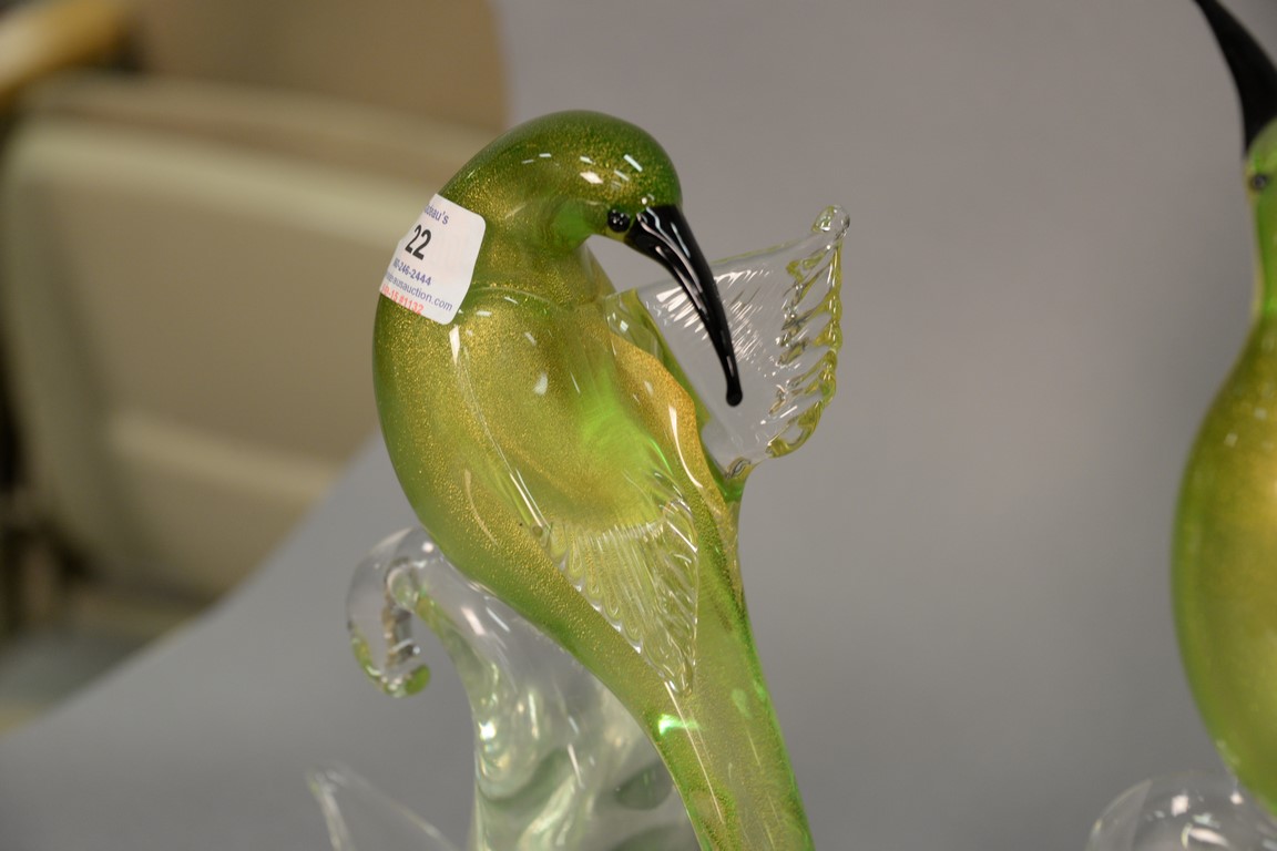 Lot 22: Two pairs of Murano art glass green/gold birds of paradise on clear glass bases. ht. 11 in. to 14 1/2 in.