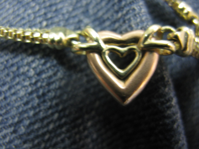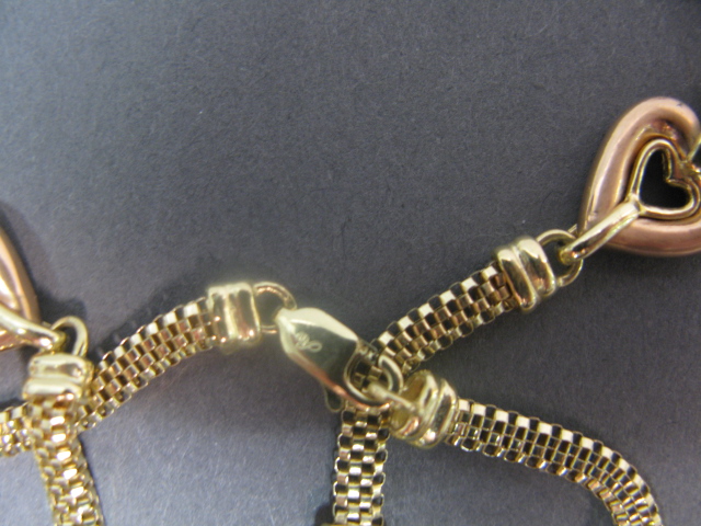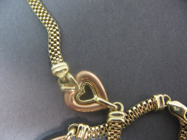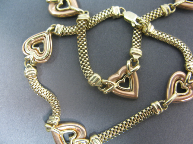 Two piece lot: 14 K gold necklace and matching bracelet in two color gold with several heart shapes.