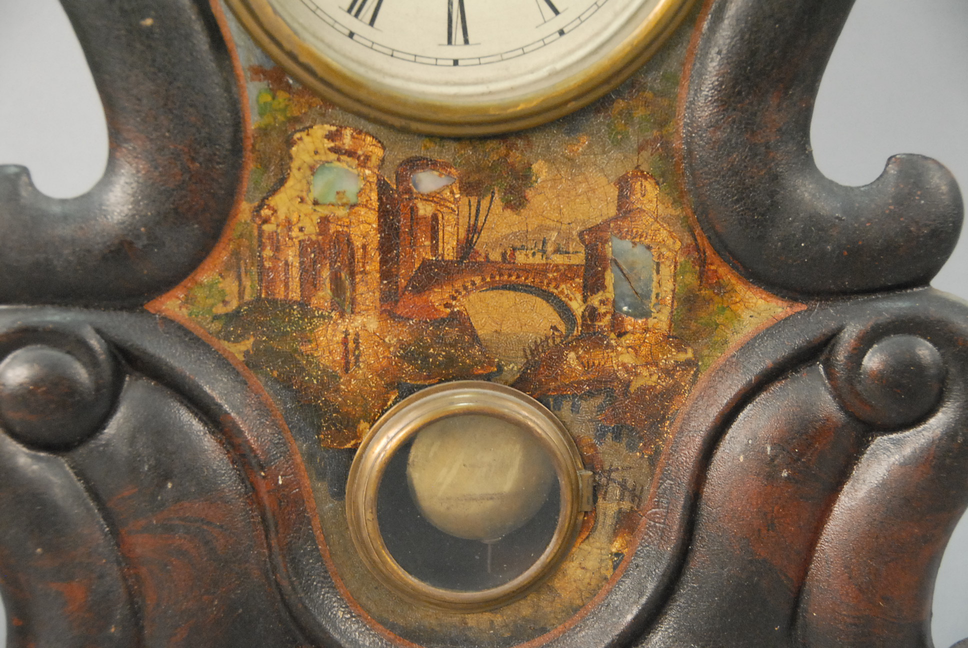 Victorian iron mantle clock with original paint, C. Jerome. ht. 20 1/2in.