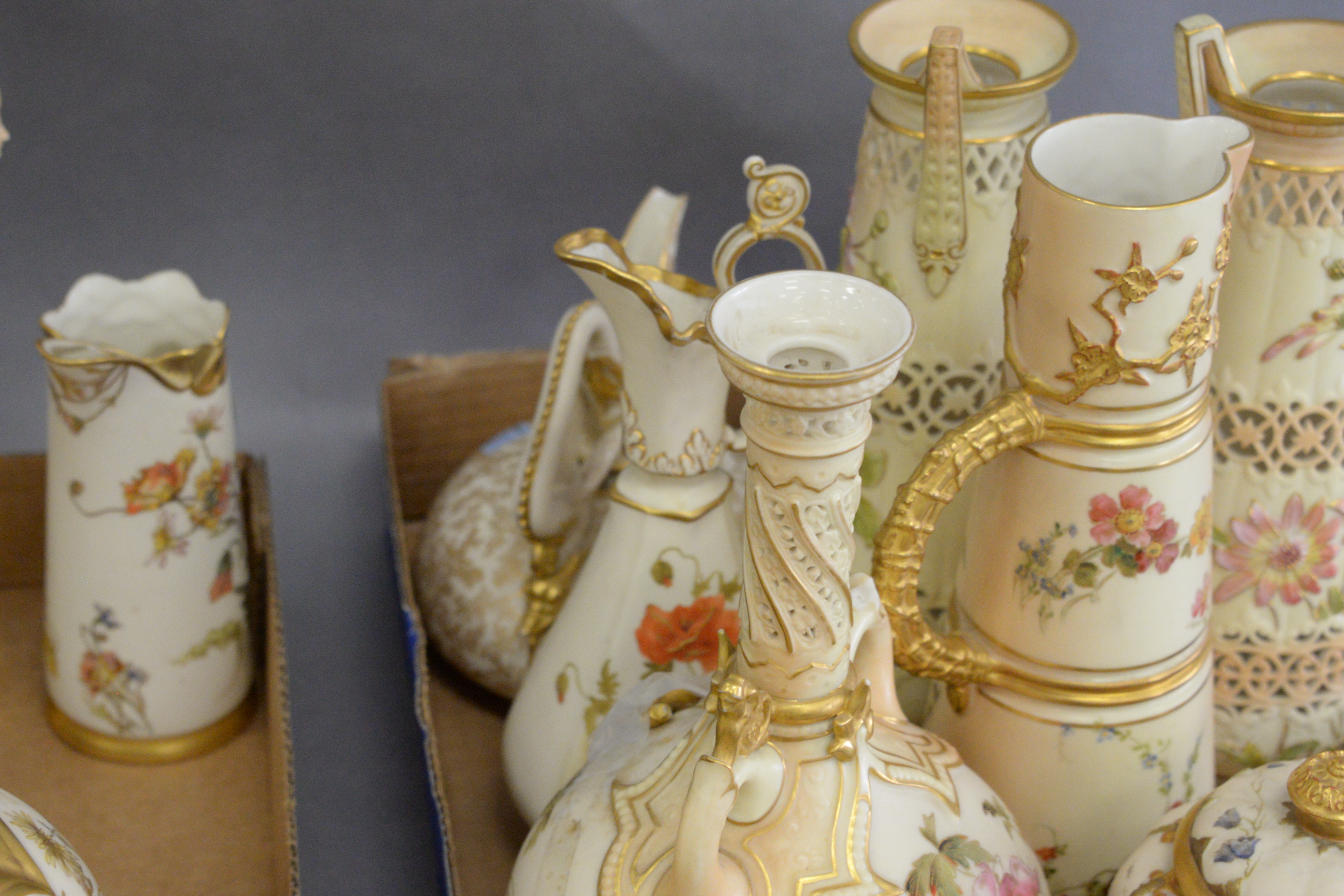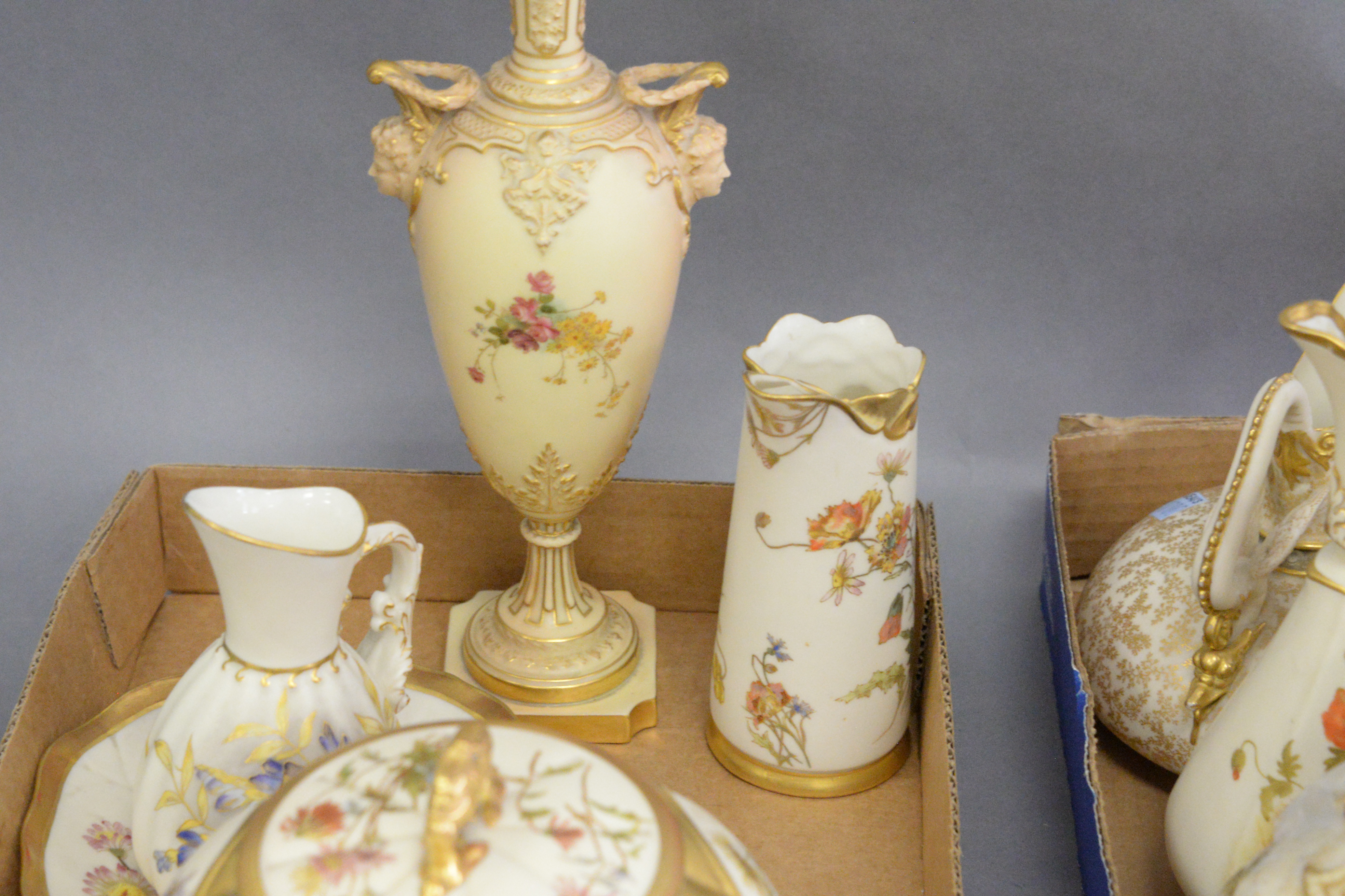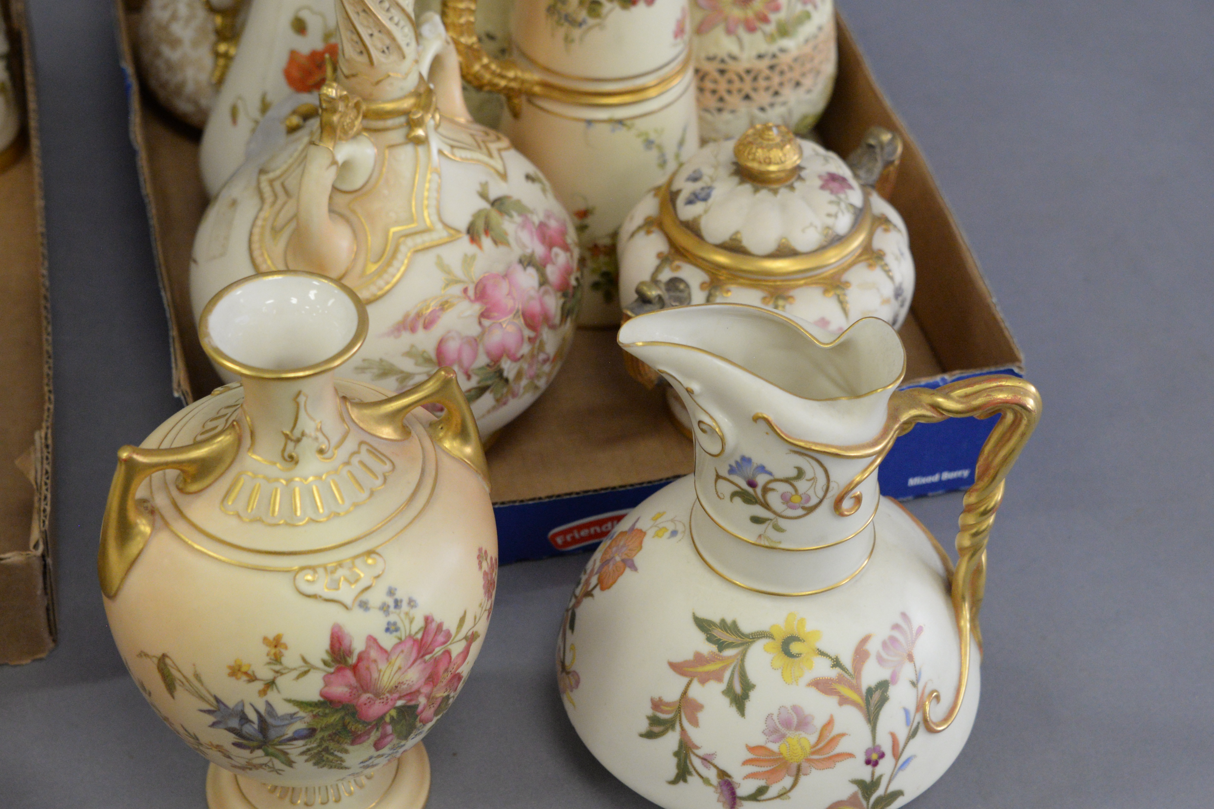 16 Piece Group of Royal Worcester Blush Ivory to Include, five vases, three covered jars, seven pitchers, one saucer, each marked on reverse, one vase with broken handle, tallest height 11 inches