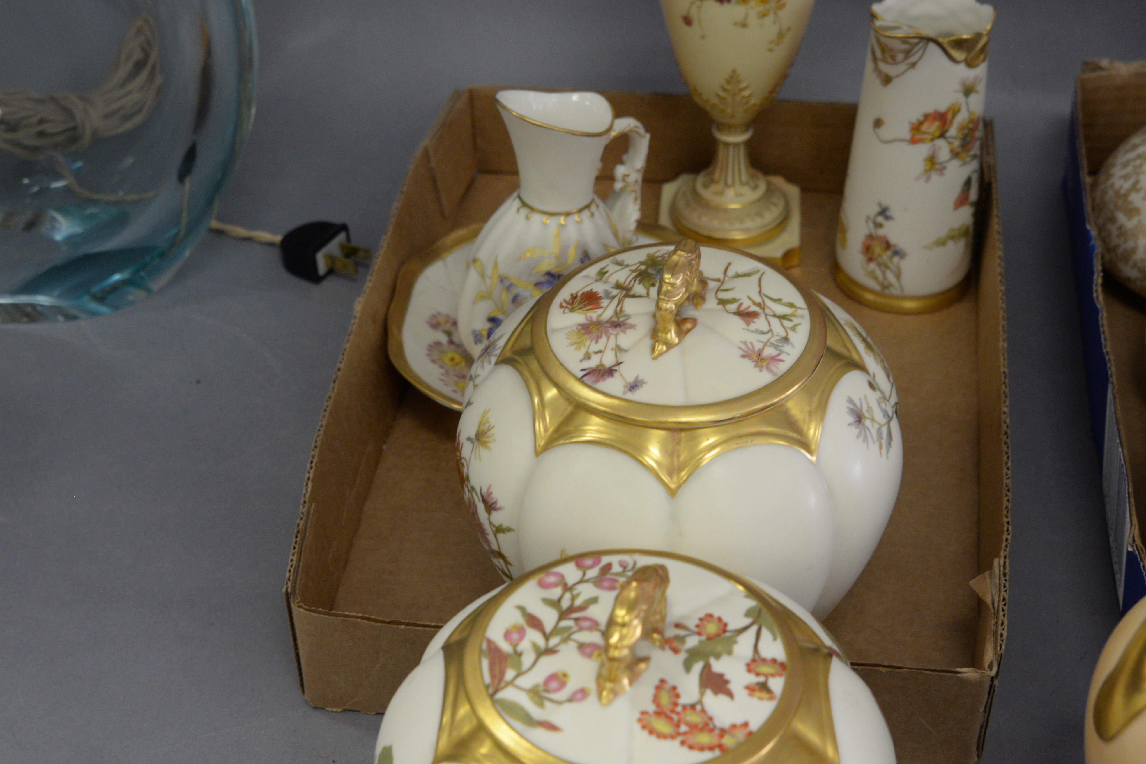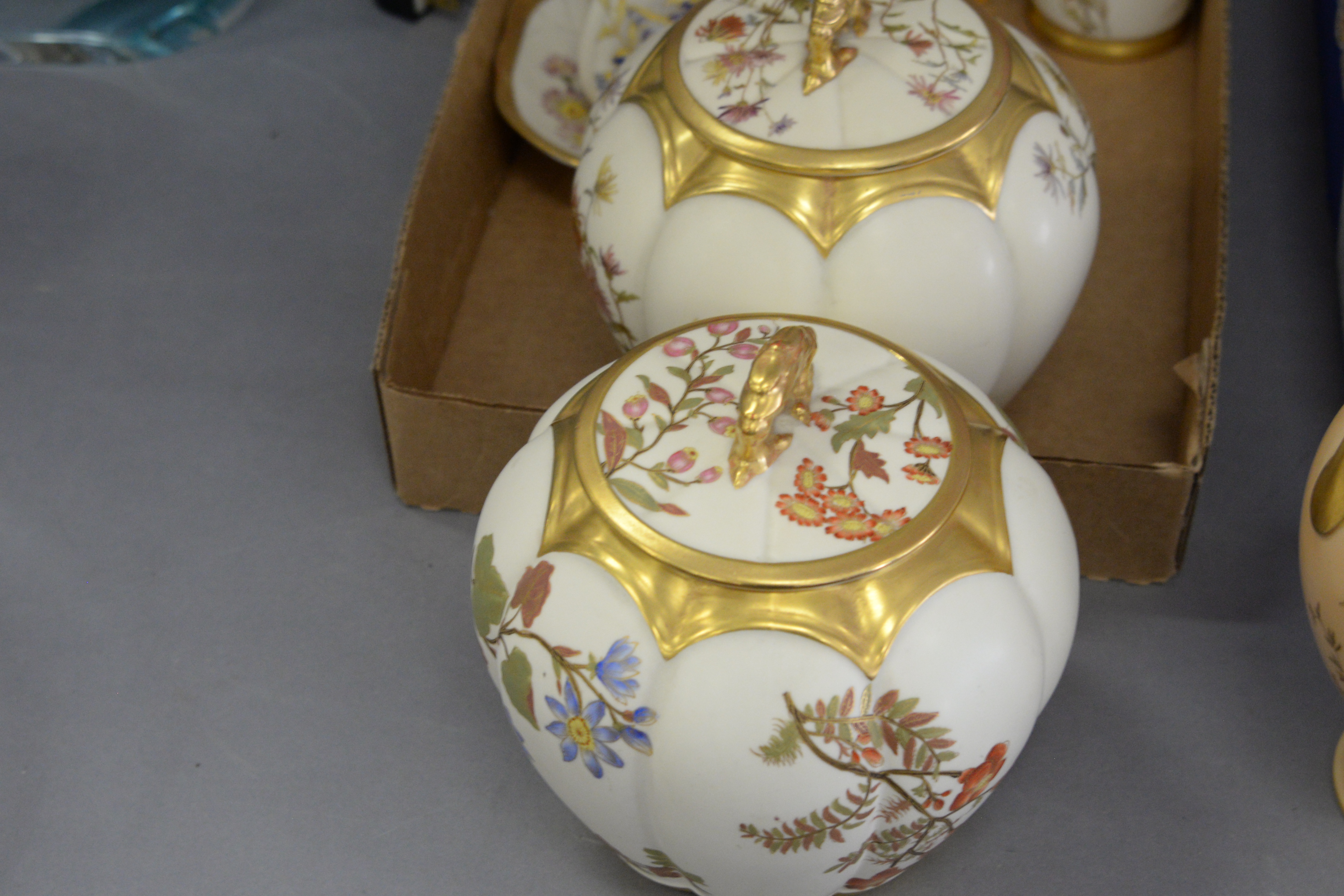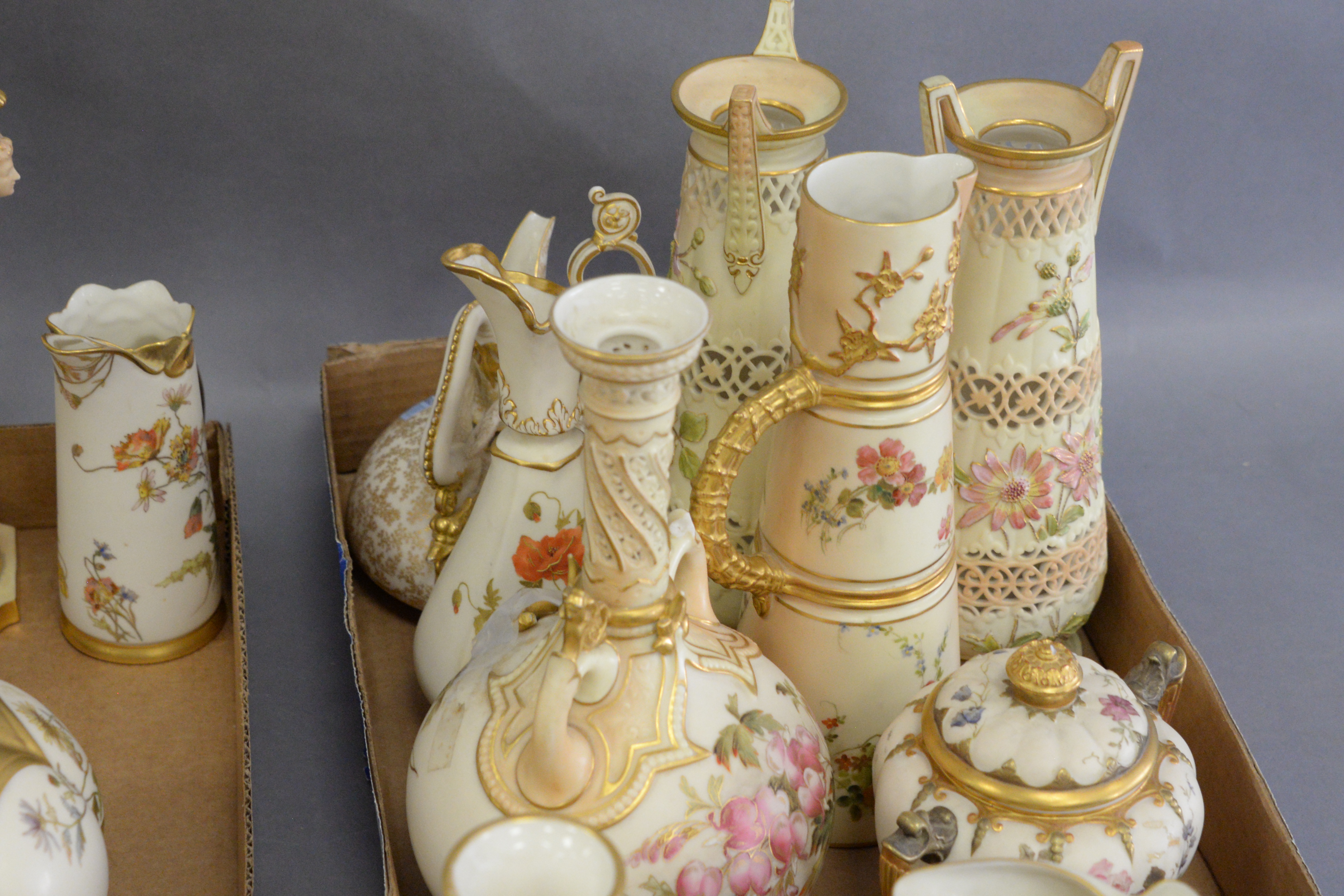 16 Piece Group of Royal Worcester Blush Ivory to Include, five vases, three covered jars, seven pitchers, one saucer, each marked on reverse, one vase with broken handle, tallest height 11 inches