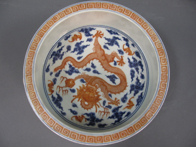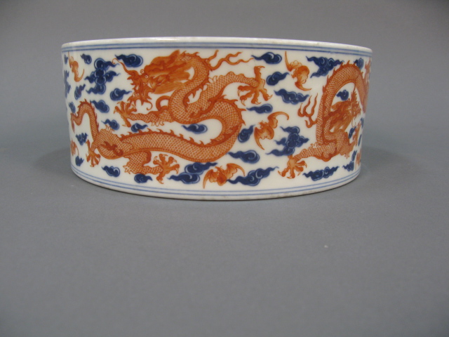 Blue and white porcelain brush washer bowl with coral red design DaoGuang mark, 19th Century.