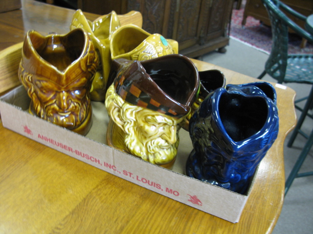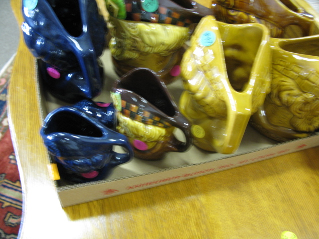 Box lots of figural mugs to include two McCallum Pitchers, Wade hand painted, three Elischer Pitchers, McCallum Royal Blue and three McCallum Pitchers.