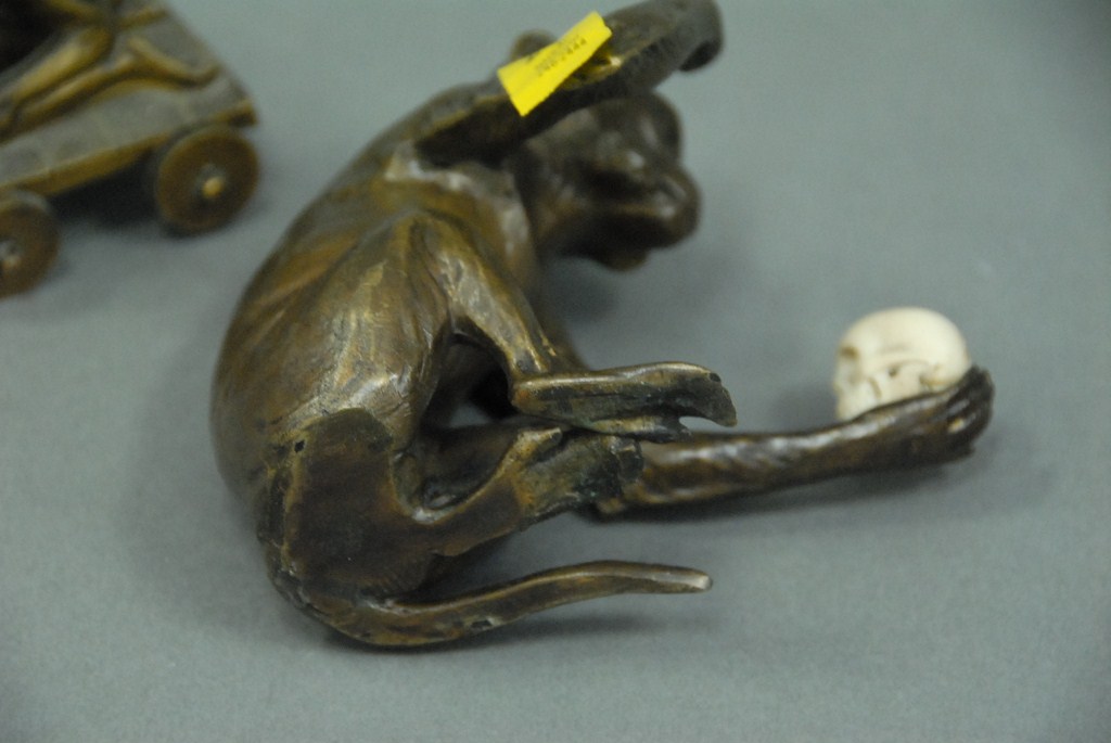 Bronze monkey with ivory skull and Napoleon I bronze mortar cannon, 4in. – 5in.