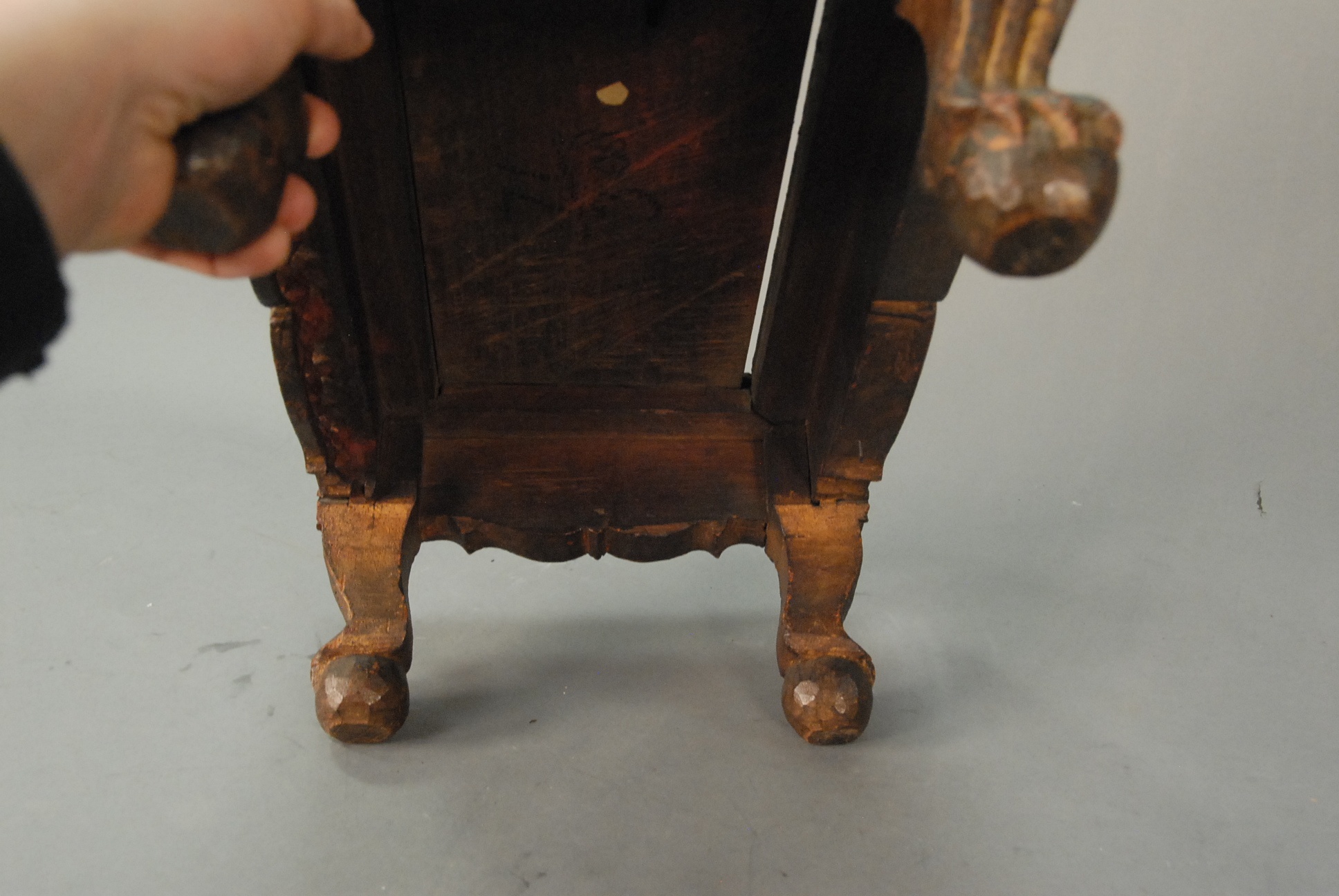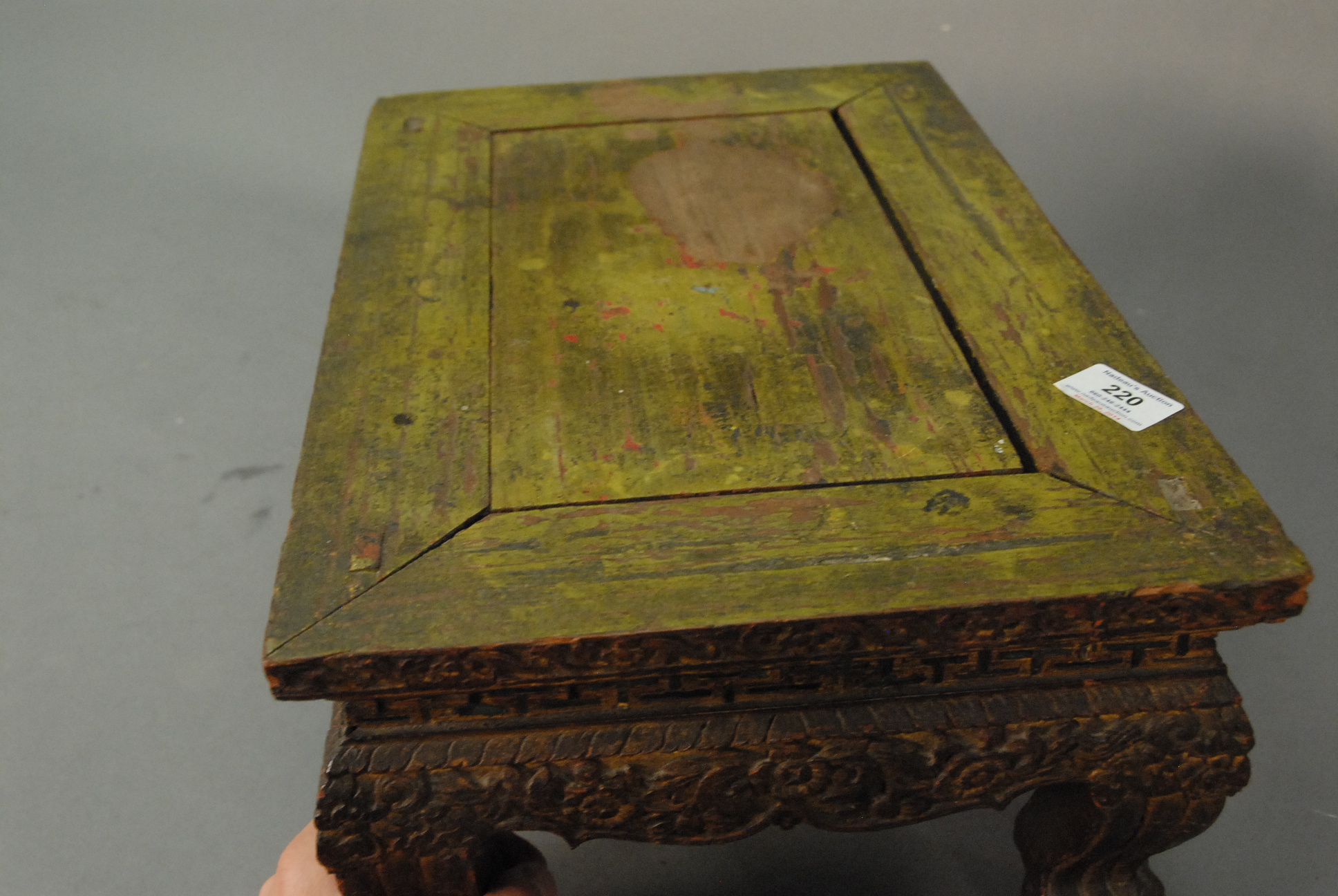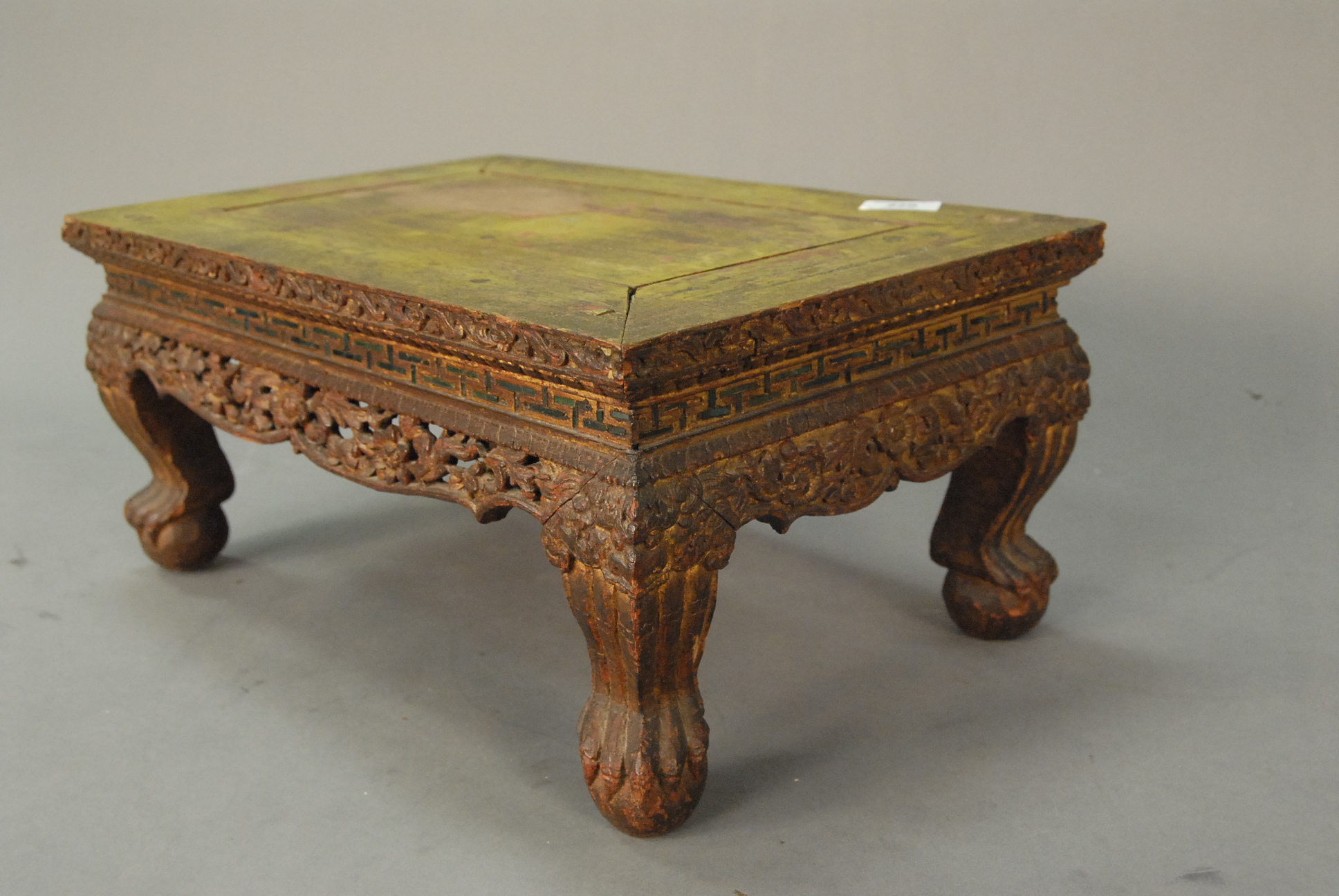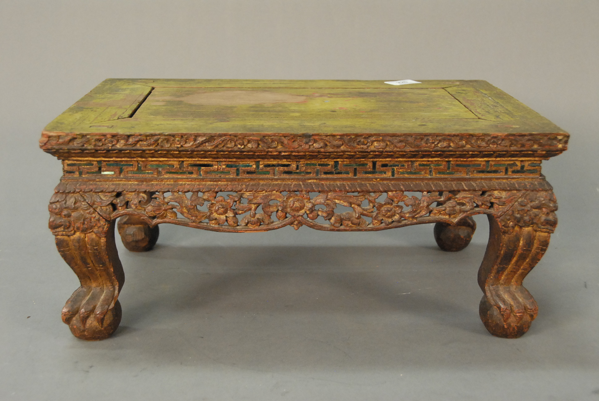 Lot 220: Chinese teak stand with carved edge and small green mirror pieces on carved legs with claw and ball feet, retaining some original gilt decoration, probably 18th century. top: 12 x 18