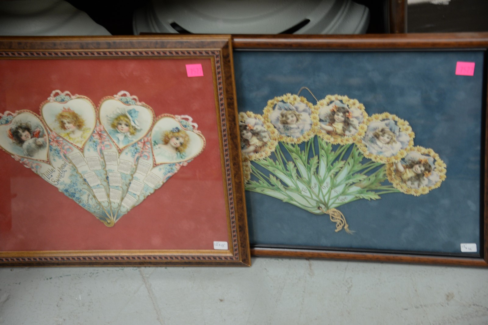 Lot 220: Eleven piece lot including framed advertising paper fans and Heinz pickle ads plus two fans and two vintage Valentines unframed.f…