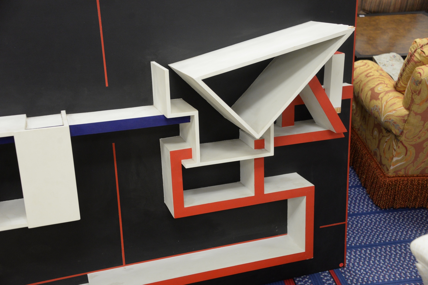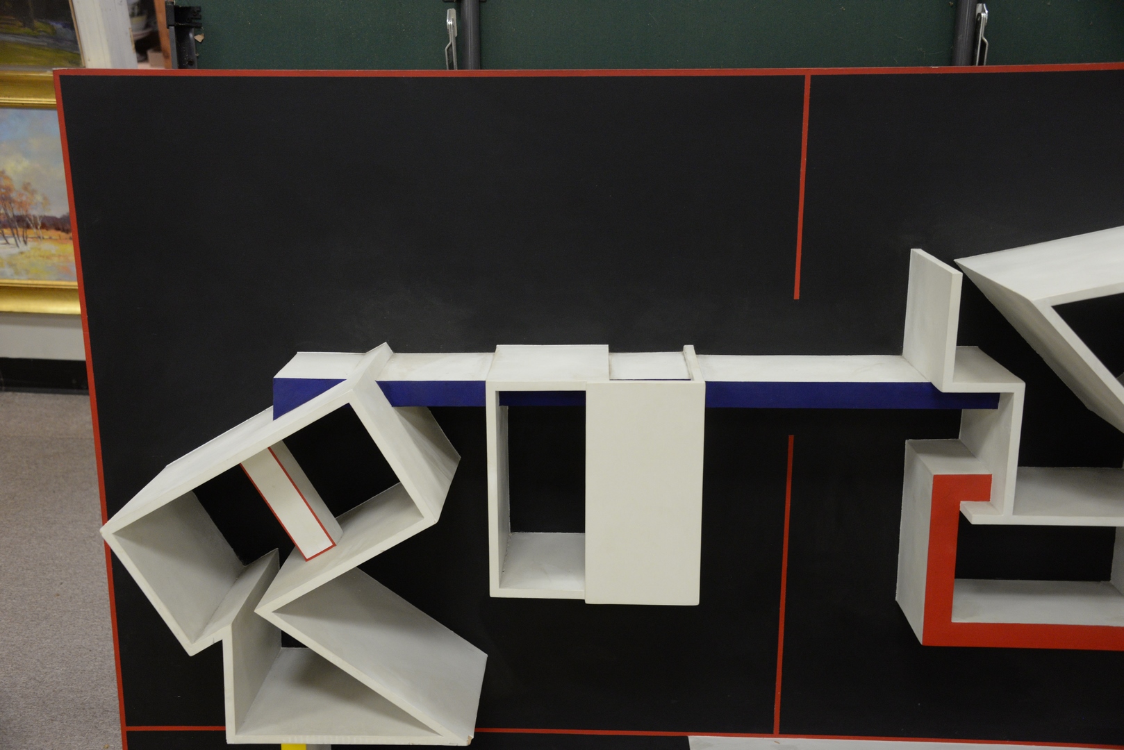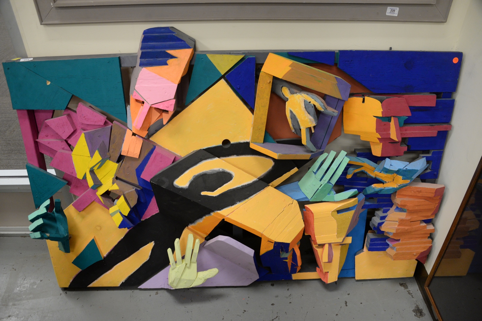 Four Piece Lot, to include Michael Hollis American, b. 1953, Grecian Echoes, 1982, mixed media with construction and ceramic tile, unsigned, 29 1/2 x 53, having a Texas Gallery label on the reverse, as is with tiles cracked and off the piece, pieces available, John Bernard Albers American, 20th century, Hand Some, 1982, painted wood, unsigned, 38 x 57 x 13, with pieces missing/damaged, along with Masaharu Matsui 20th century, Order of the Orient No. 2, acrylic screened on canvas, signed upper right M. Matsui, 26 x 36, as is with paint loss and flaking along with Peter Berg American, b. 1948, Bram’s Very Own Fault, 1981, painted wood, unsigned, overall 48 x 78.