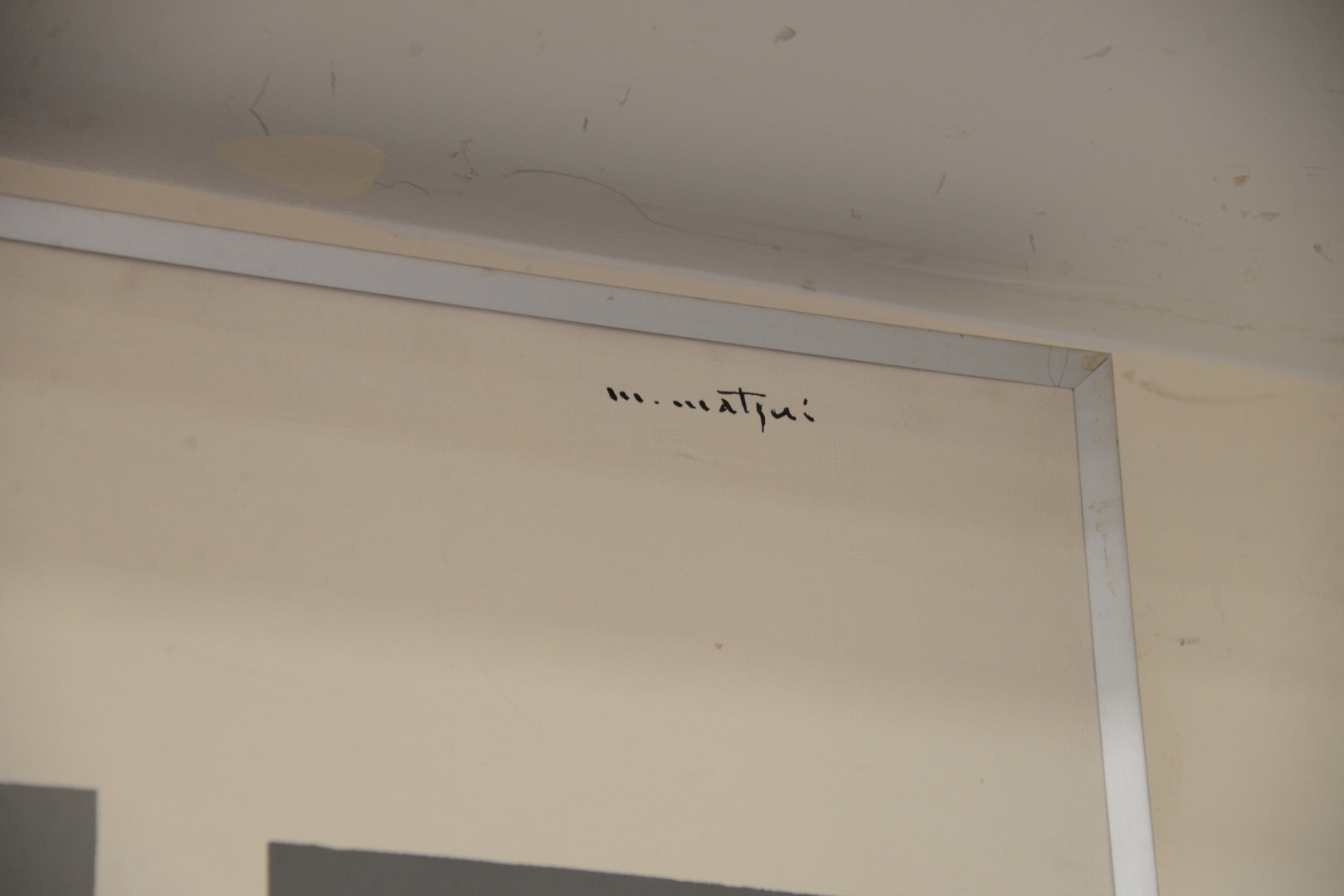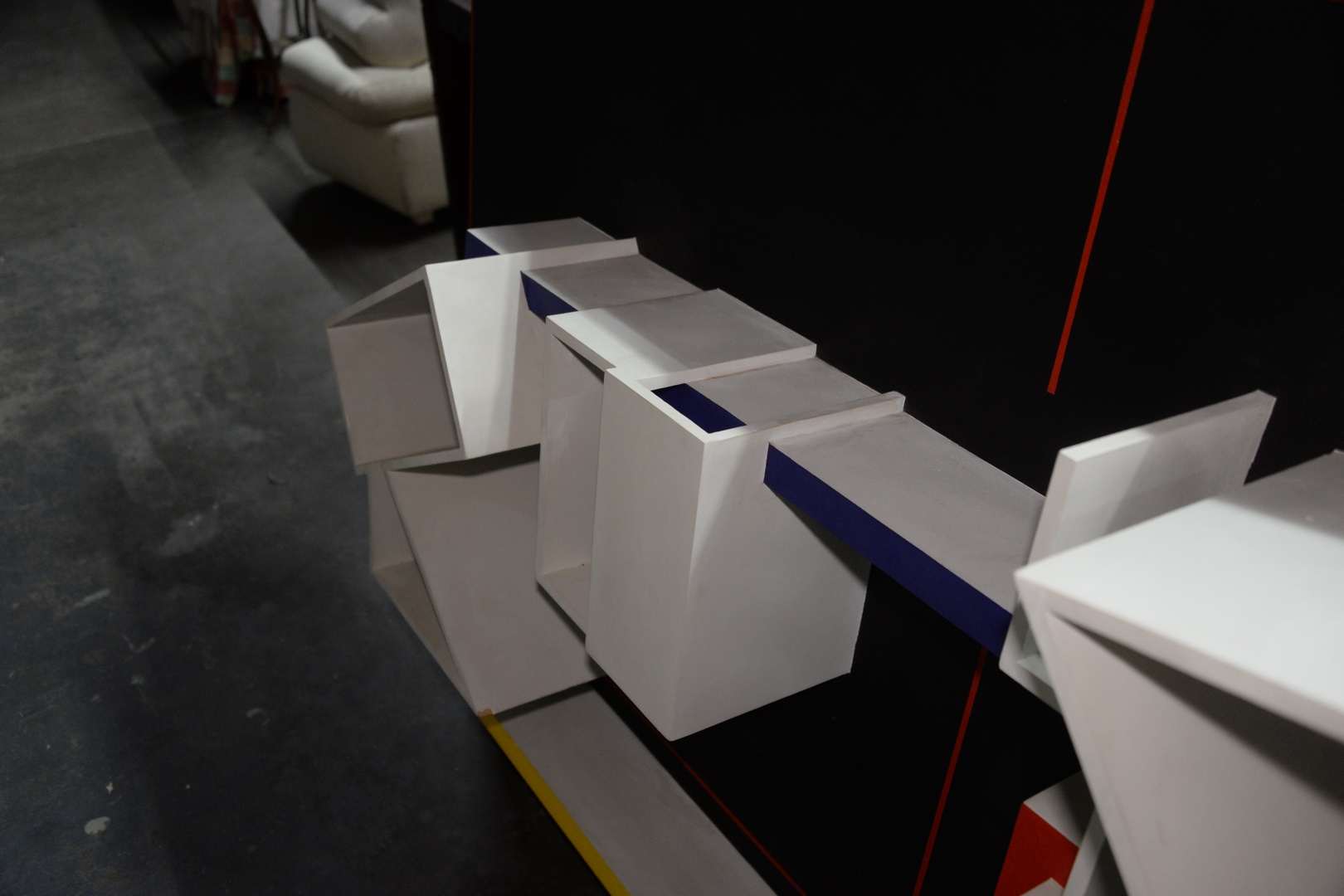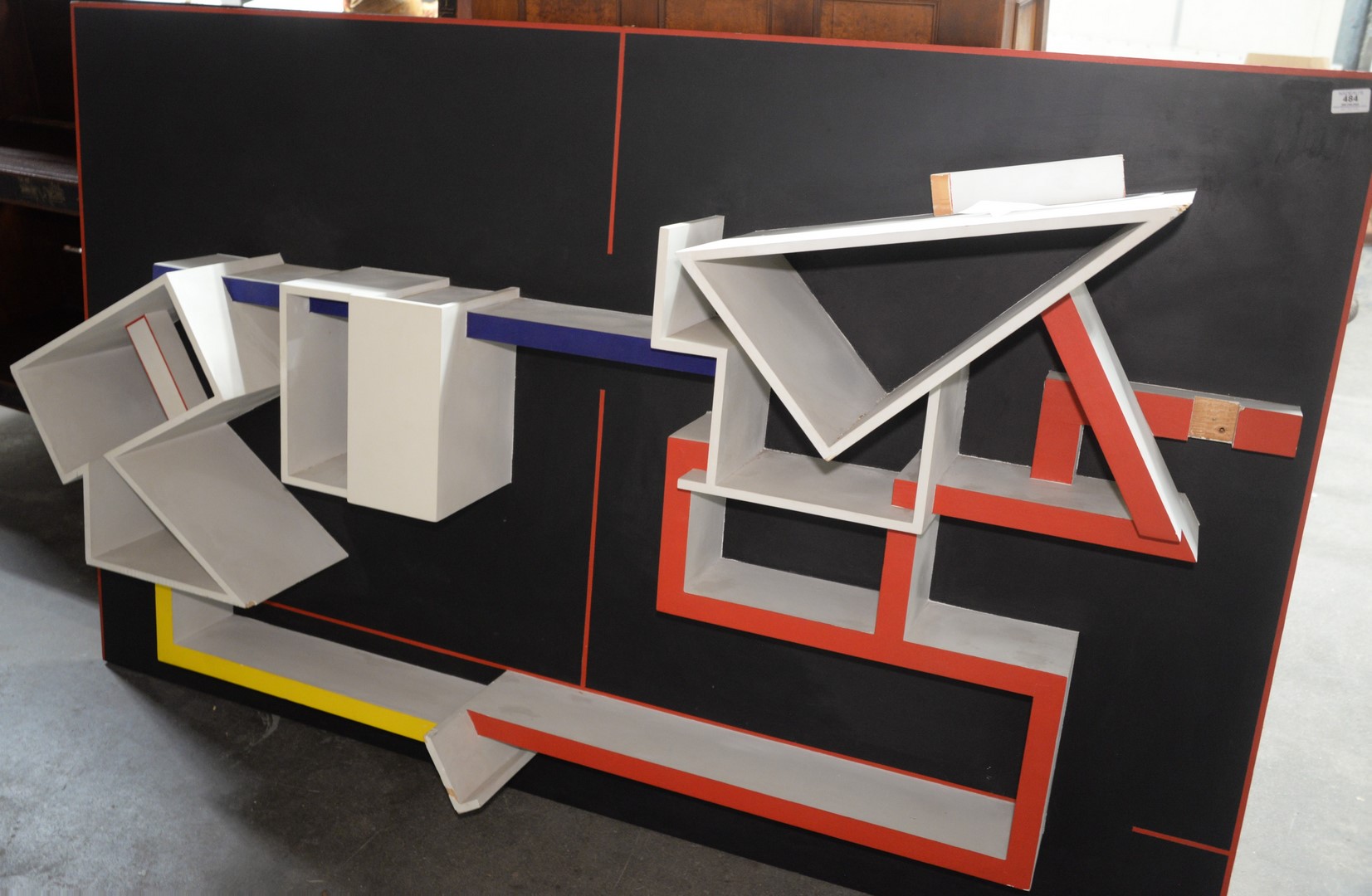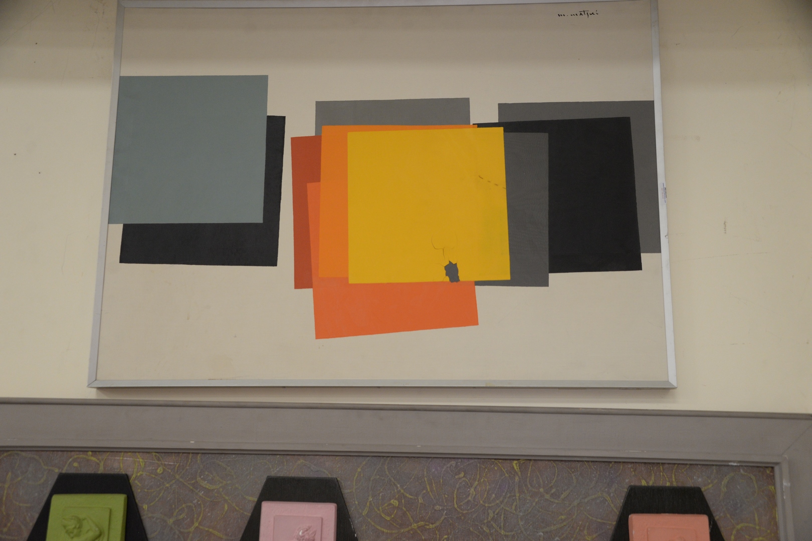 Four Piece Lot, to include Michael Hollis American, b. 1953, Grecian Echoes, 1982, mixed media with construction and ceramic tile, unsigned, 29 1/2 x 53, having a Texas Gallery label on the reverse, as is with tiles cracked and off the piece, pieces available, John Bernard Albers American, 20th century, Hand Some, 1982, painted wood, unsigned, 38 x 57 x 13, with pieces missing/damaged, along with Masaharu Matsui 20th century, Order of the Orient No. 2, acrylic screened on canvas, signed upper right M. Matsui, 26 x 36, as is with paint loss and flaking along with Peter Berg American, b. 1948, Bram’s Very Own Fault, 1981, painted wood, unsigned, overall 48 x 78.
