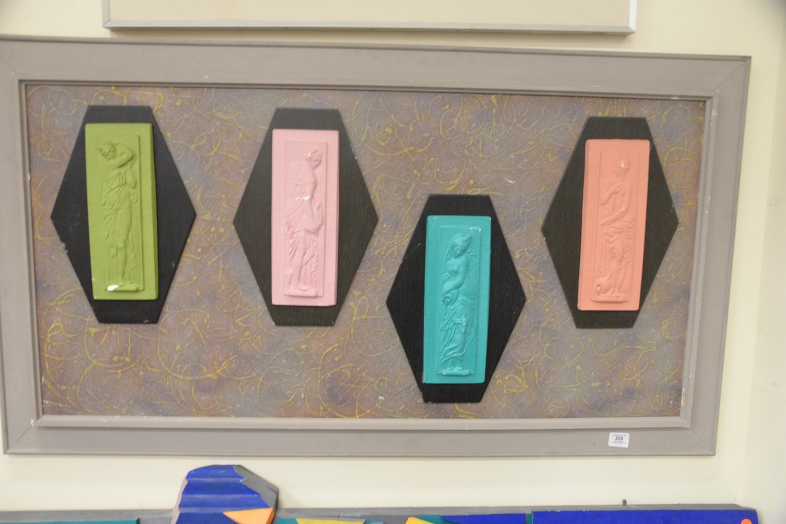 Lot 220: Four Piece Lot, to include Michael Hollis American, b. 1953, Grecian Echoes, 1982, mixed media with construction and ceramic tile, unsigned, 29 1/2 x 53, having a Texas Gallery label on the reverse, as is with tiles cracked and off the piece, pi