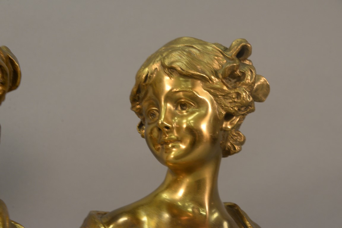 Lot 220: Georges Van der Straeten 1856-1928 Pair of gilt bronze busts Young Woman and Young Boy both on alabaster bases marked on botto…