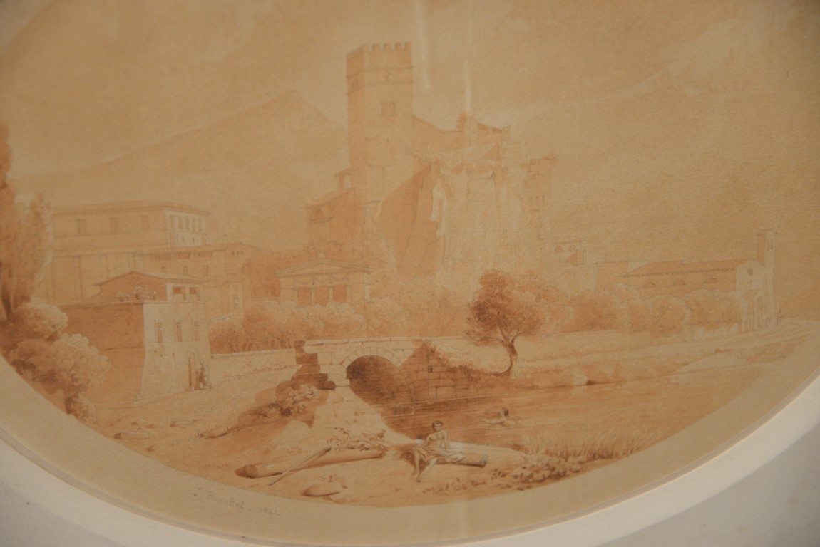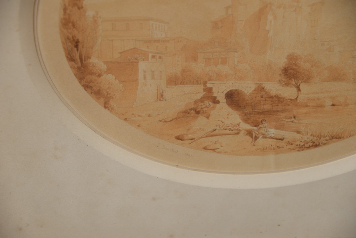 Jules Frederic Bouchet 1799-1860 Bathing in the Canal on the City’s Edge watercolor and pencil on paper signed and dated lower left: J. Bouchet 1847 sight size: 8 1/2 x 11